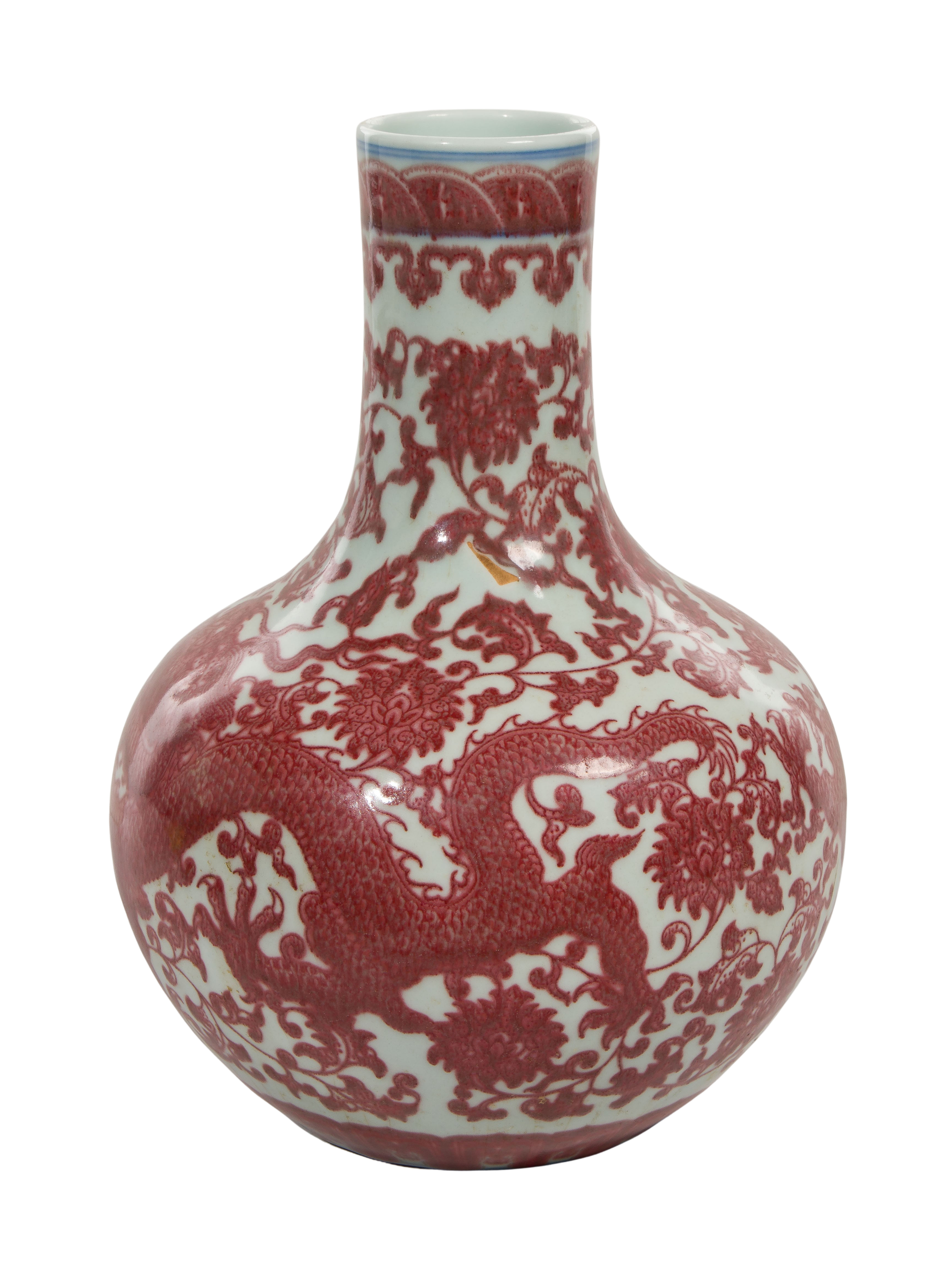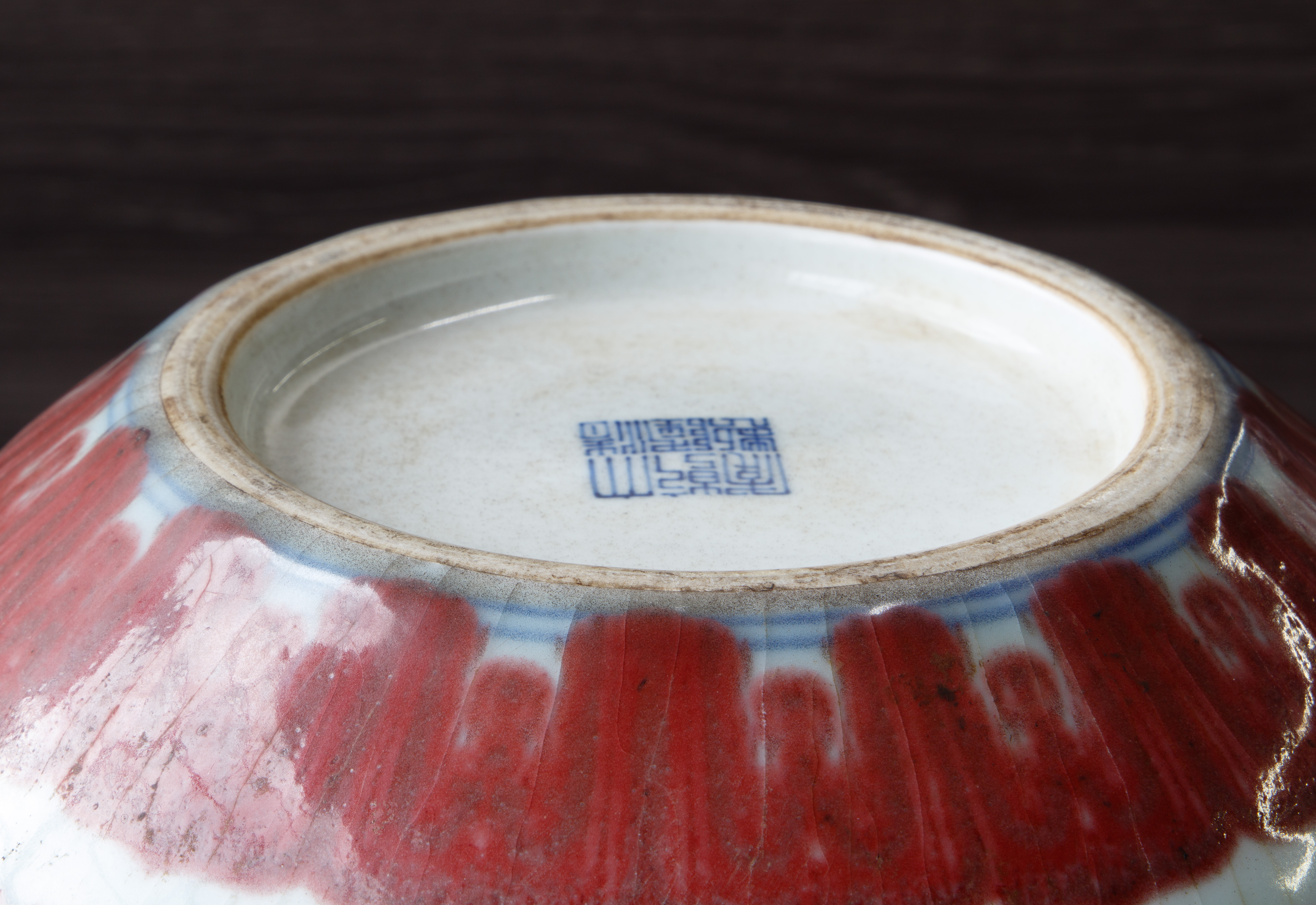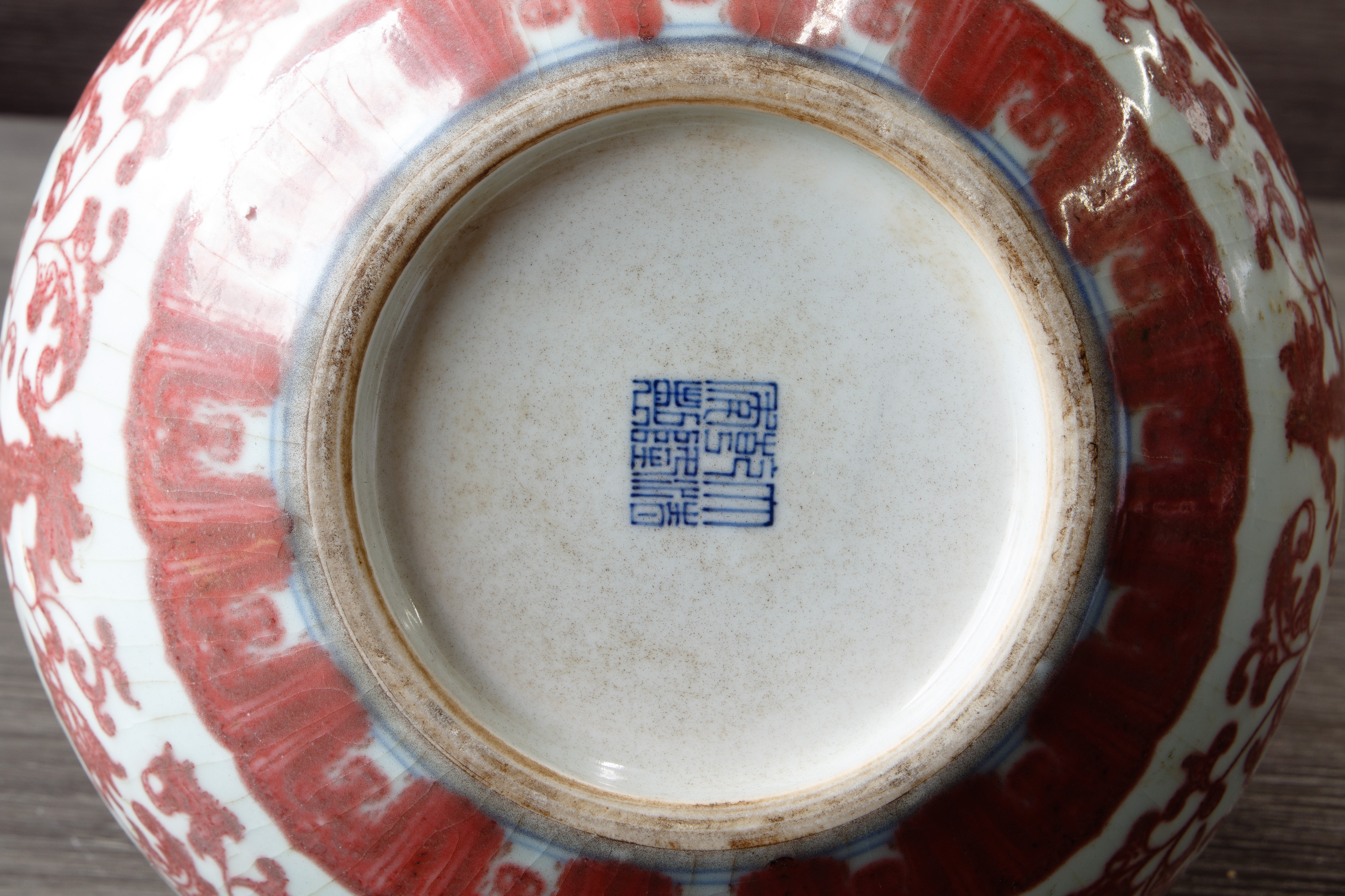 Having a dragon motif in a red underglaze with a 6-character underglaze blue Qianlong archaic seal mark underside