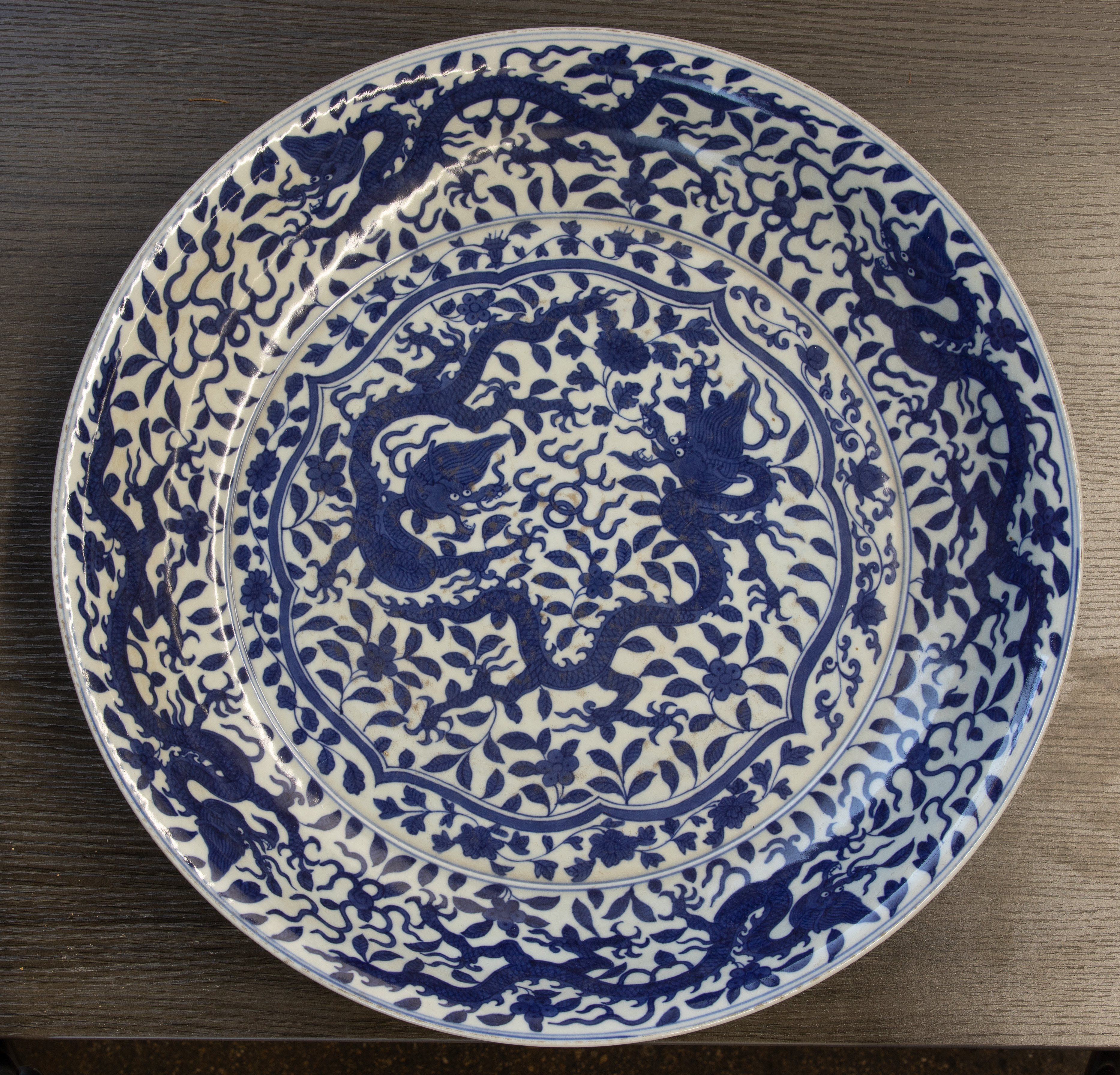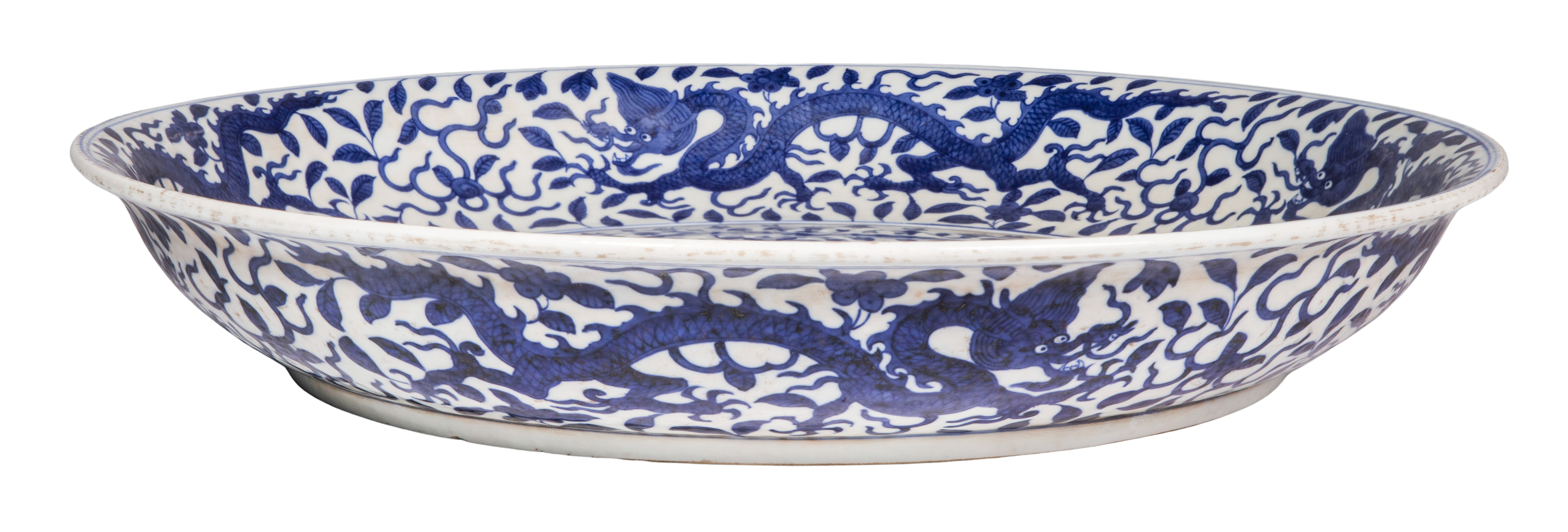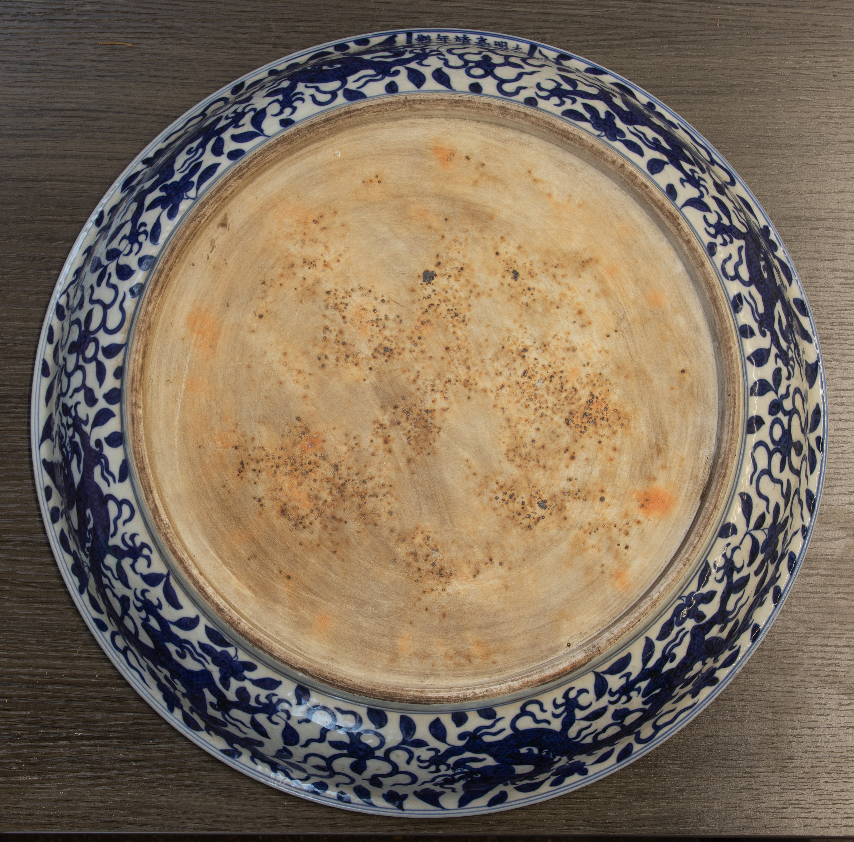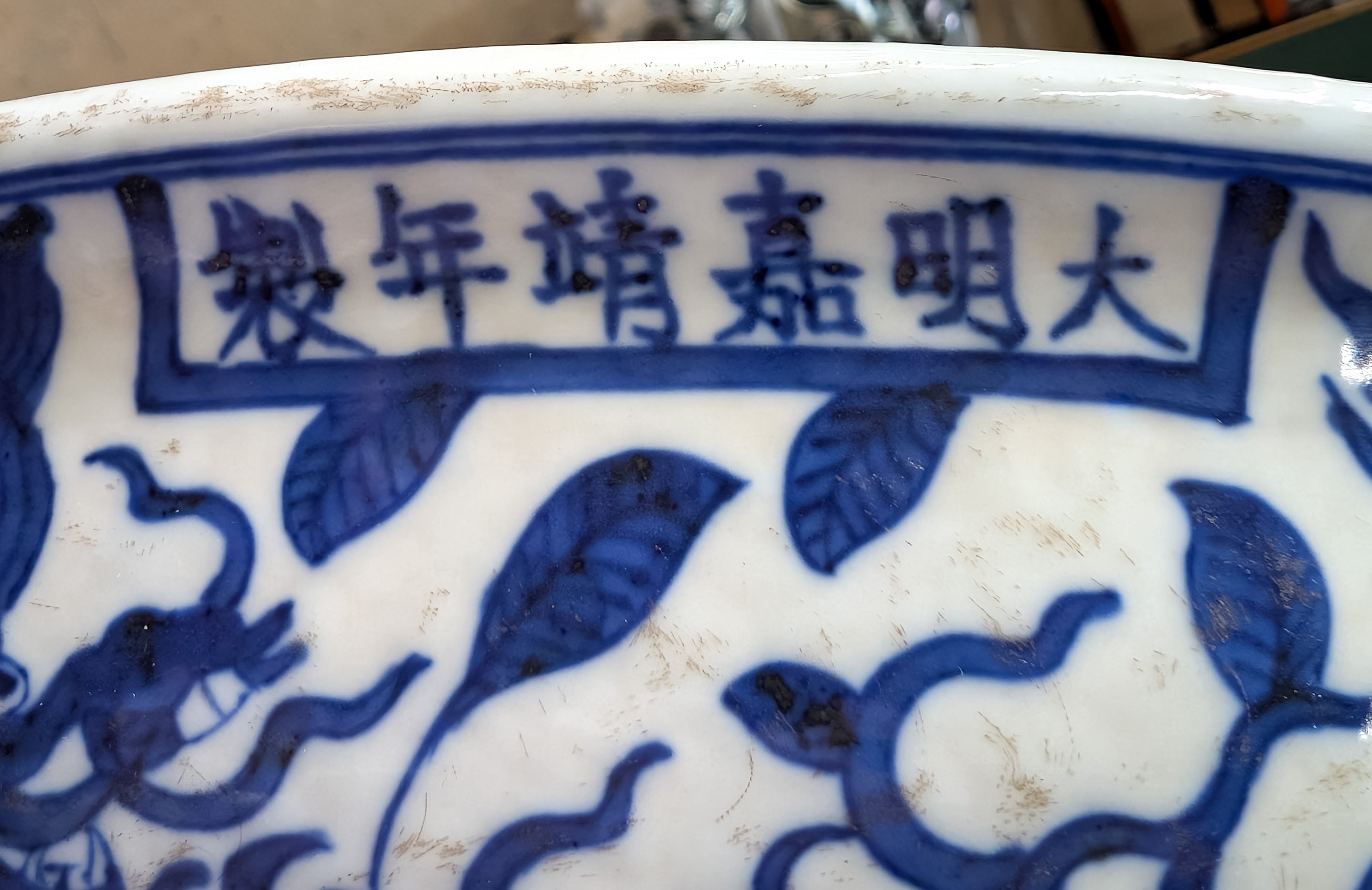 Blue and white dragon charger, the interior and exterior having five-toed dragons, a floral motif and six-character Jiajing mark on the side in underglaze blue, unglazed underside and foot ring