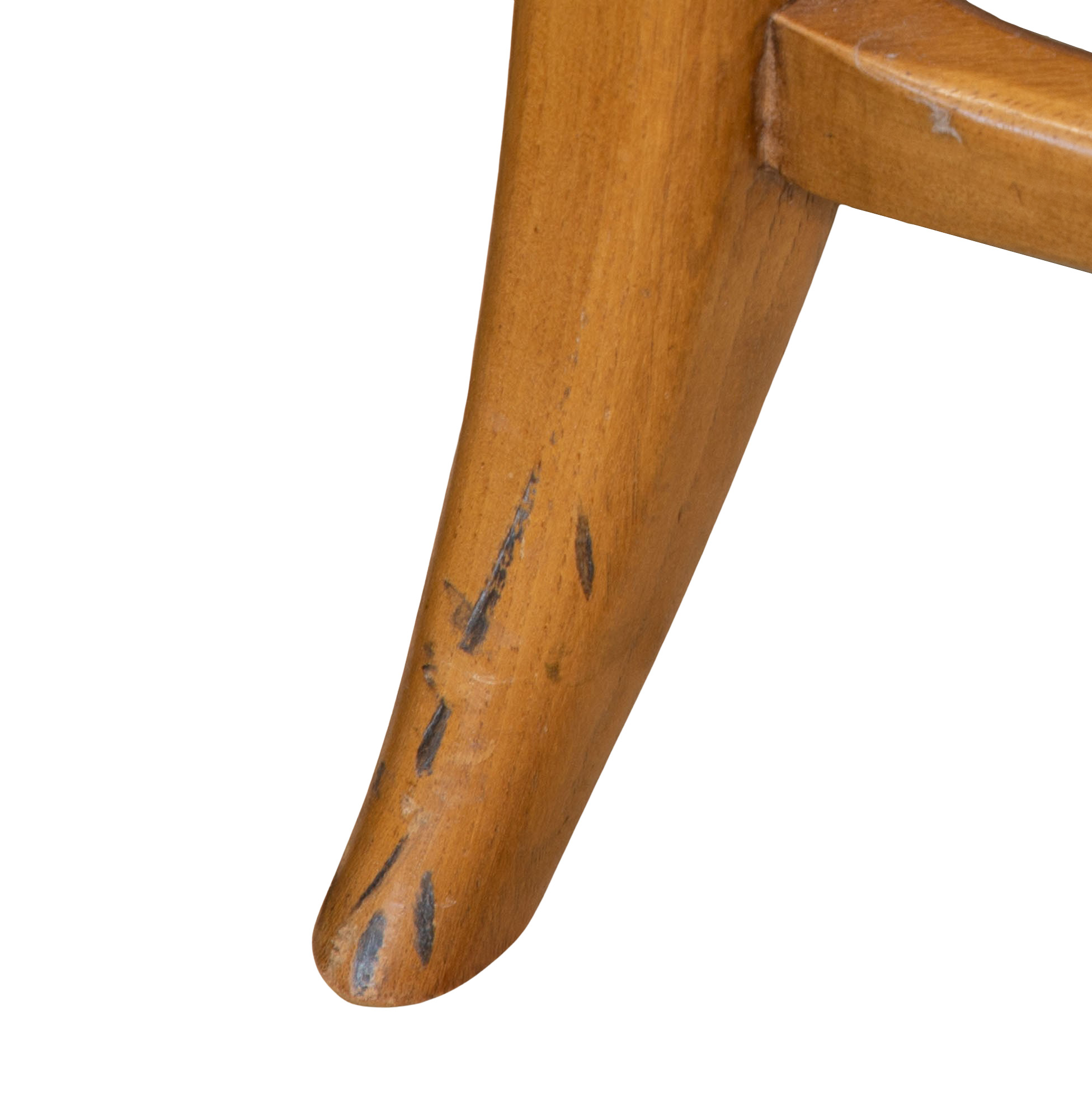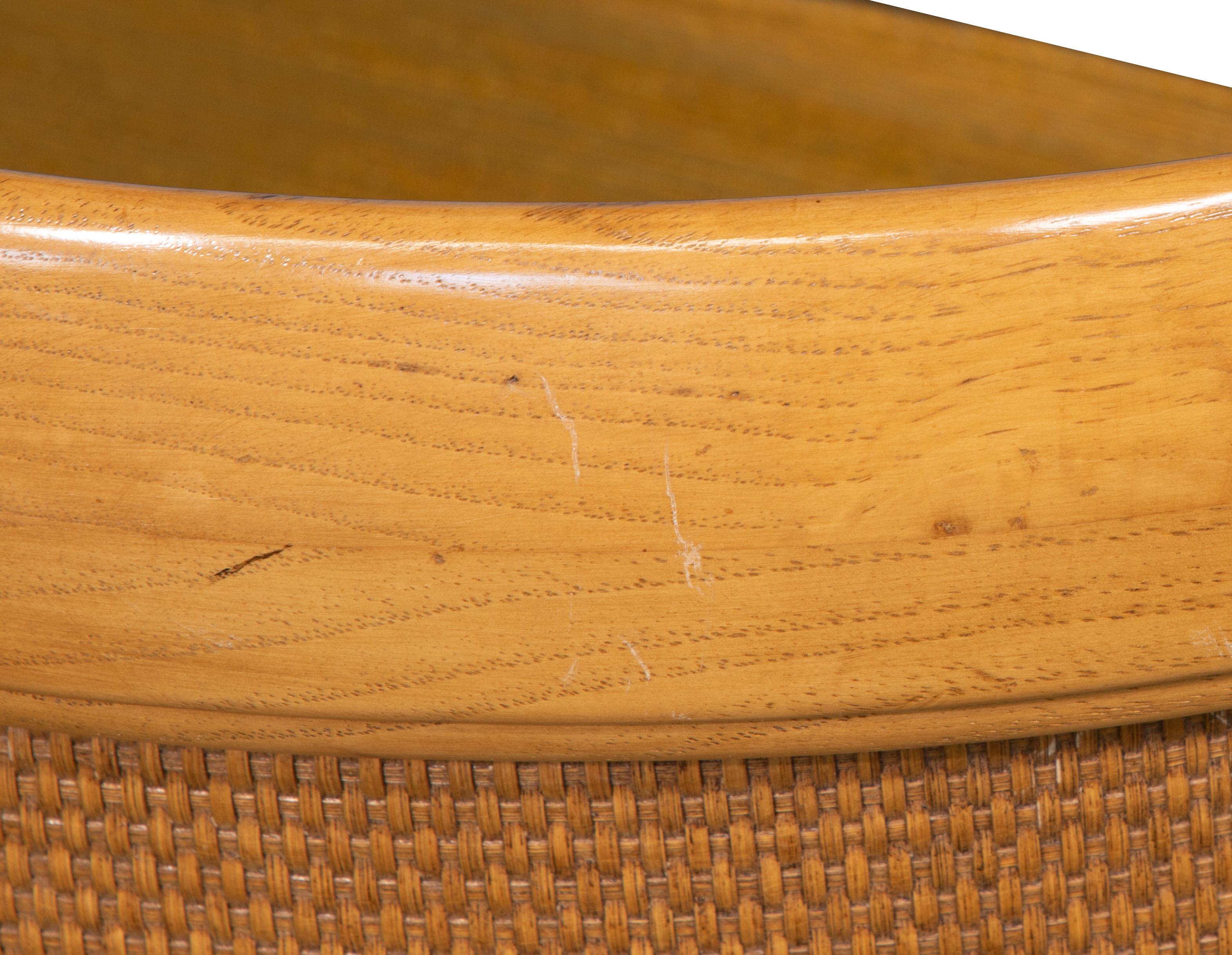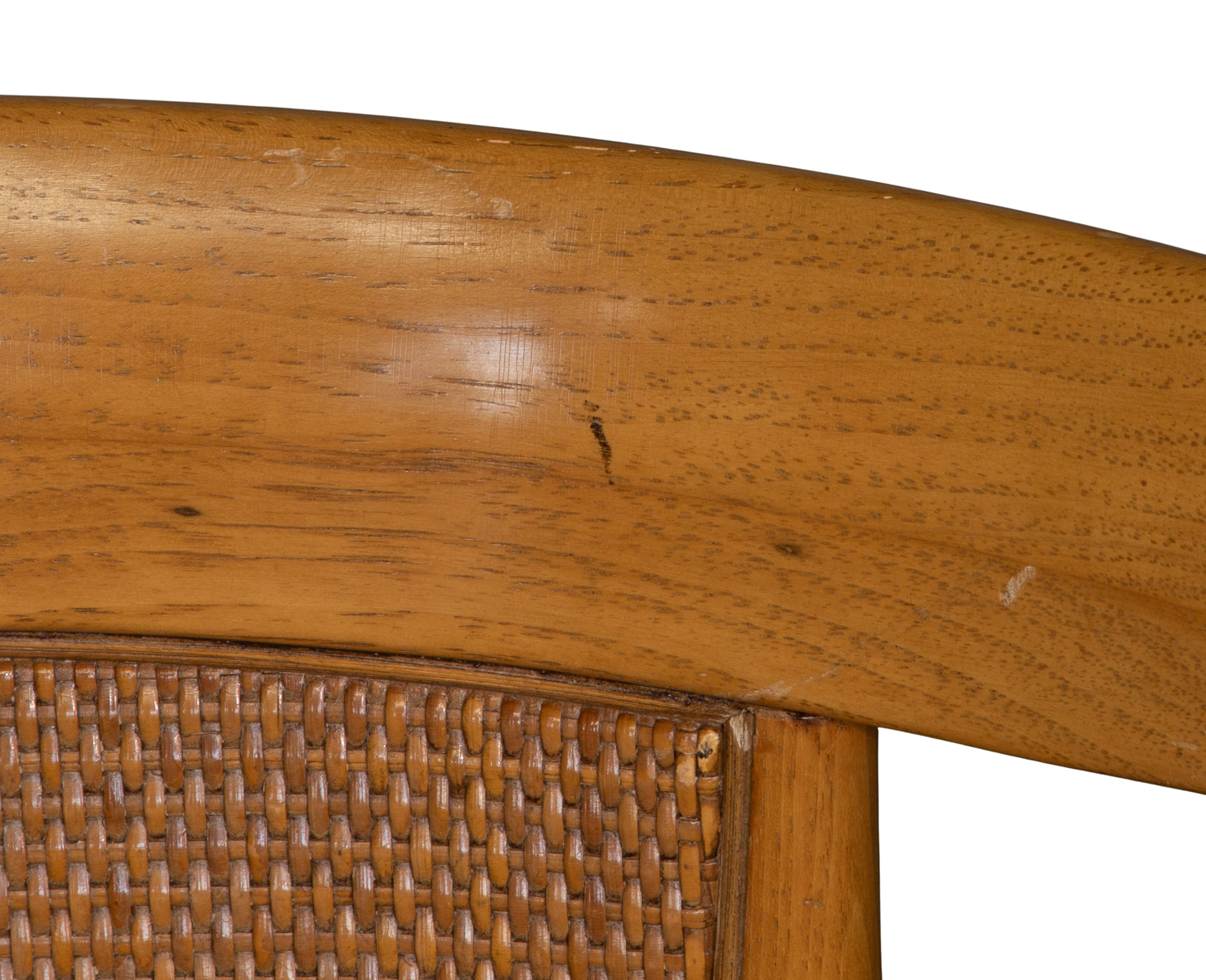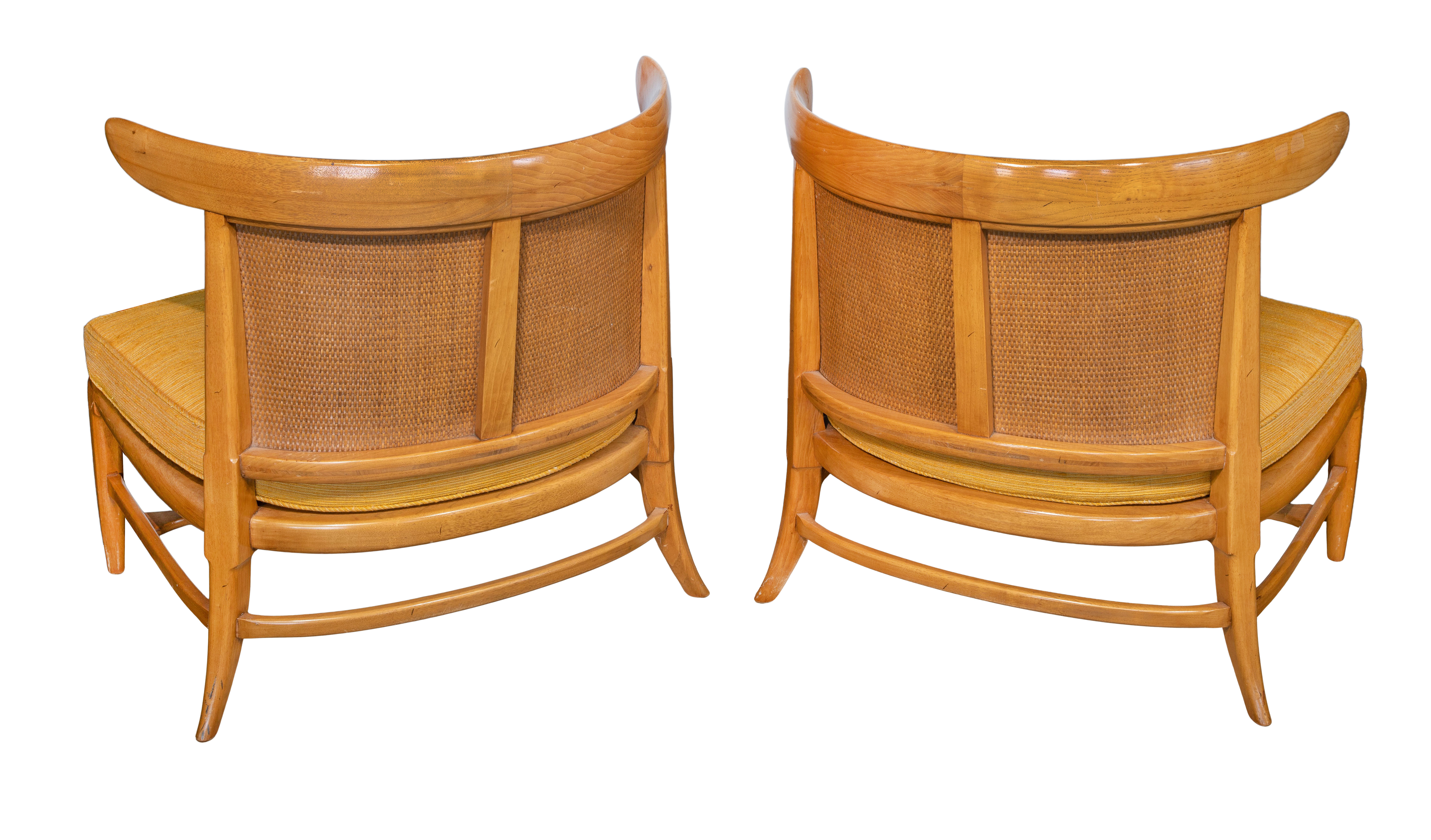 A pair of chairs having a wood frame, bullhorn detail, caned backs and original removable upholstered cushions, retaining tags under cushions, designed by John Lubberts & Lambert Mulder