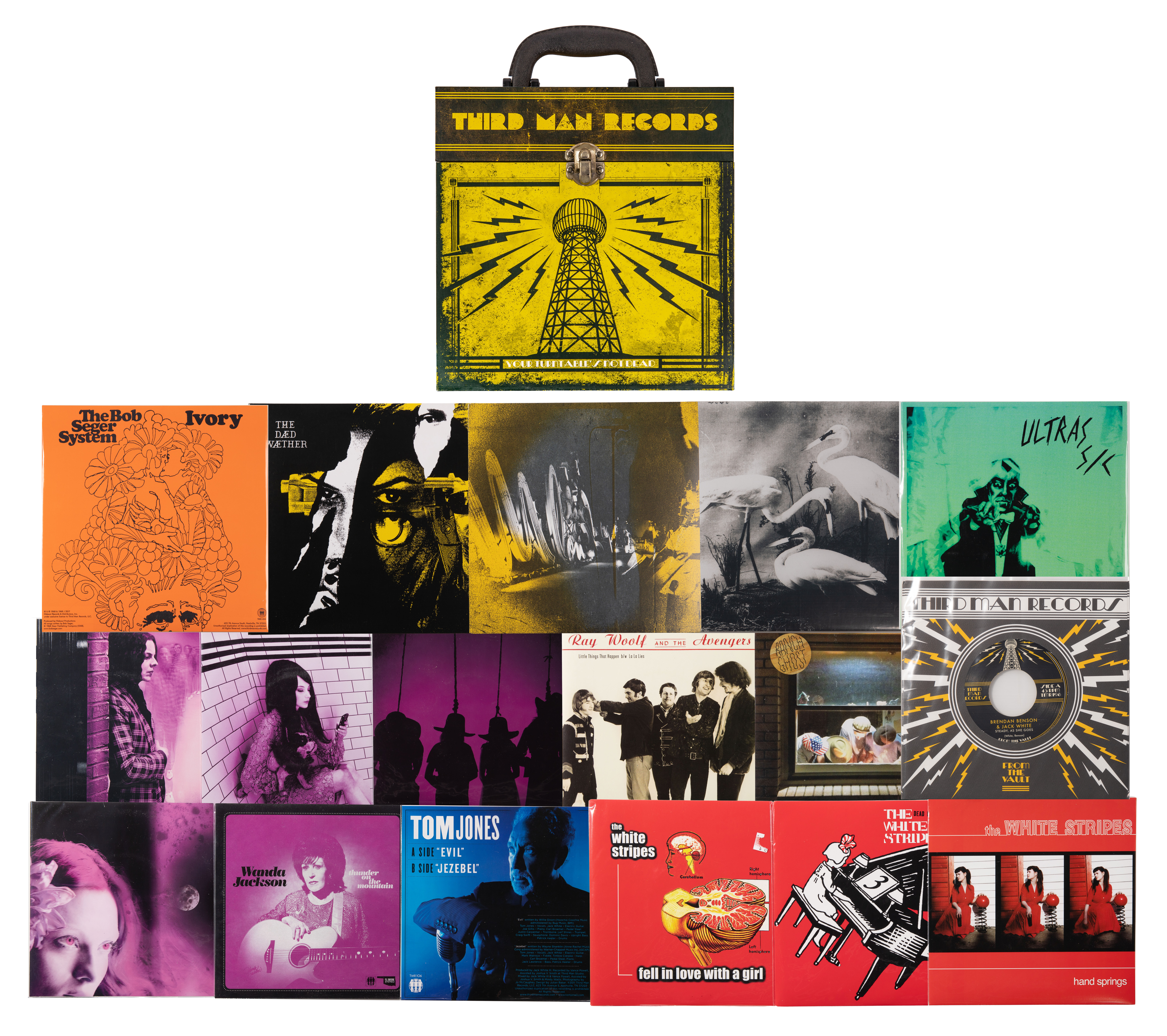 A branded yellow and black storage box containing approximately (40) singles in original sleeves including The Dead Weather, The Bob Seger System, Ray Woolf and the Avengers, Ranch Ghost, The Black Belles, Jack White, White Stripes and others, storage box having shipping box