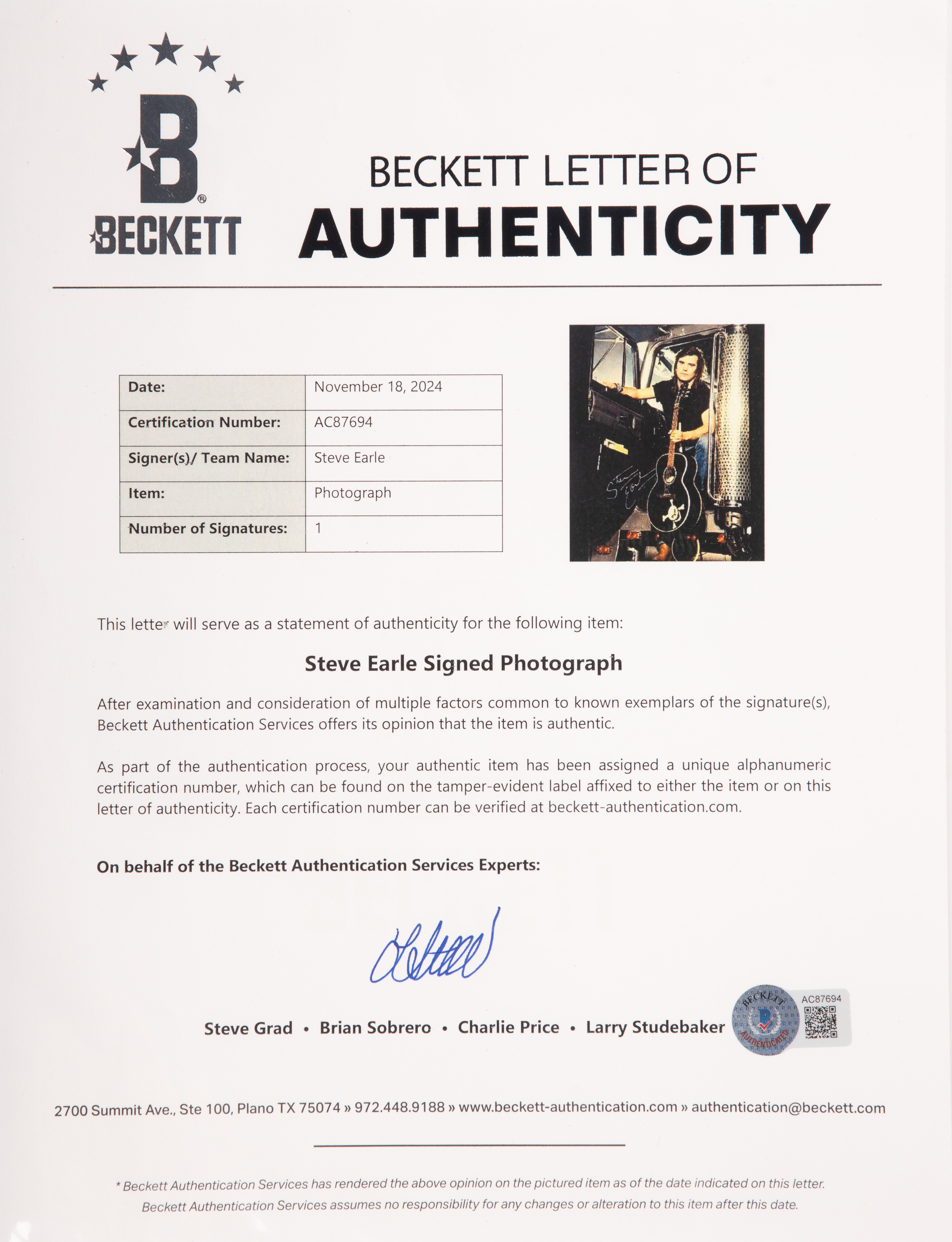 (5) items including a 1988 autographed photograph having COA #AC87694 and hologram from Beckett as well as two having photographer blind stamp and two having personal annotations by photographer verso