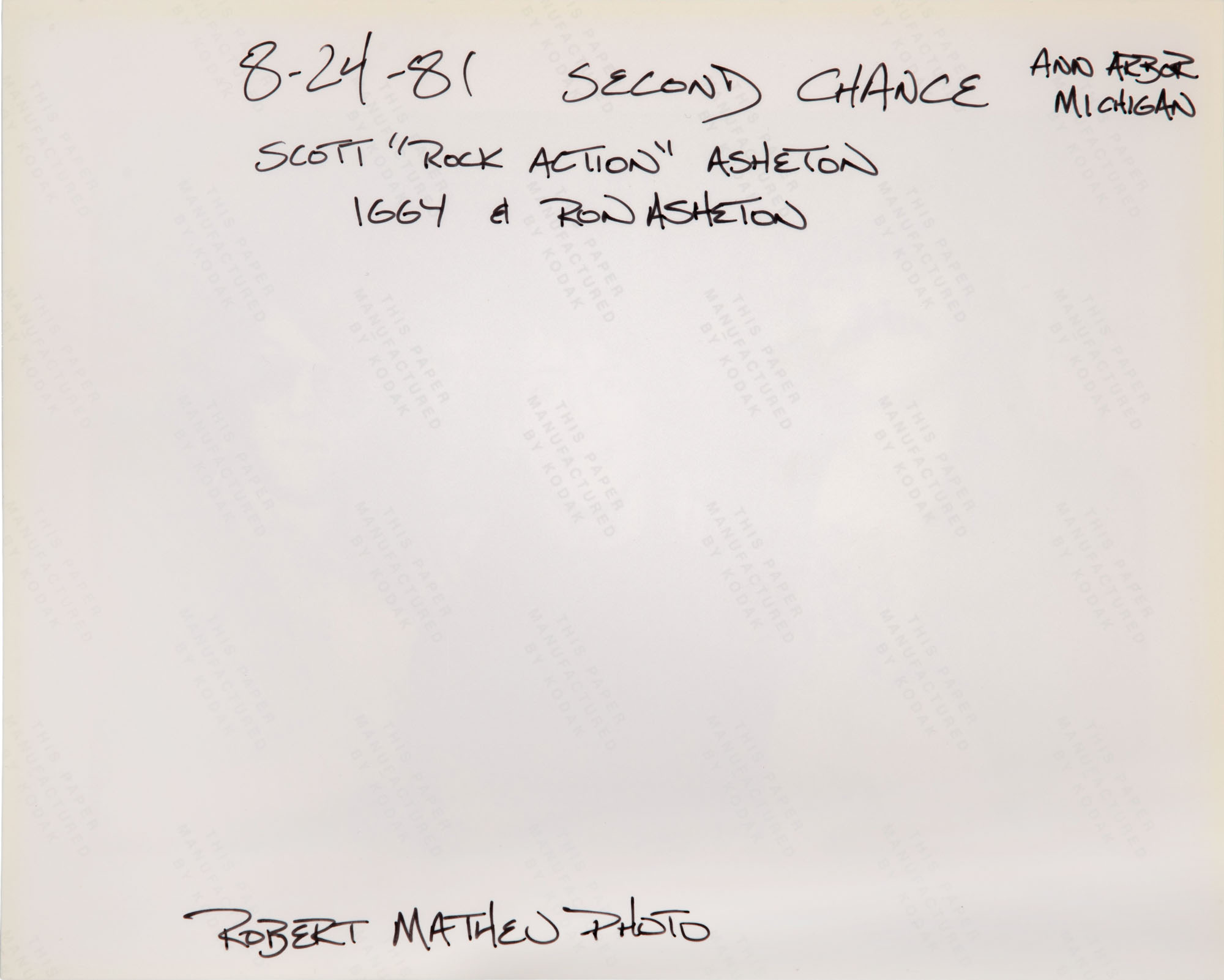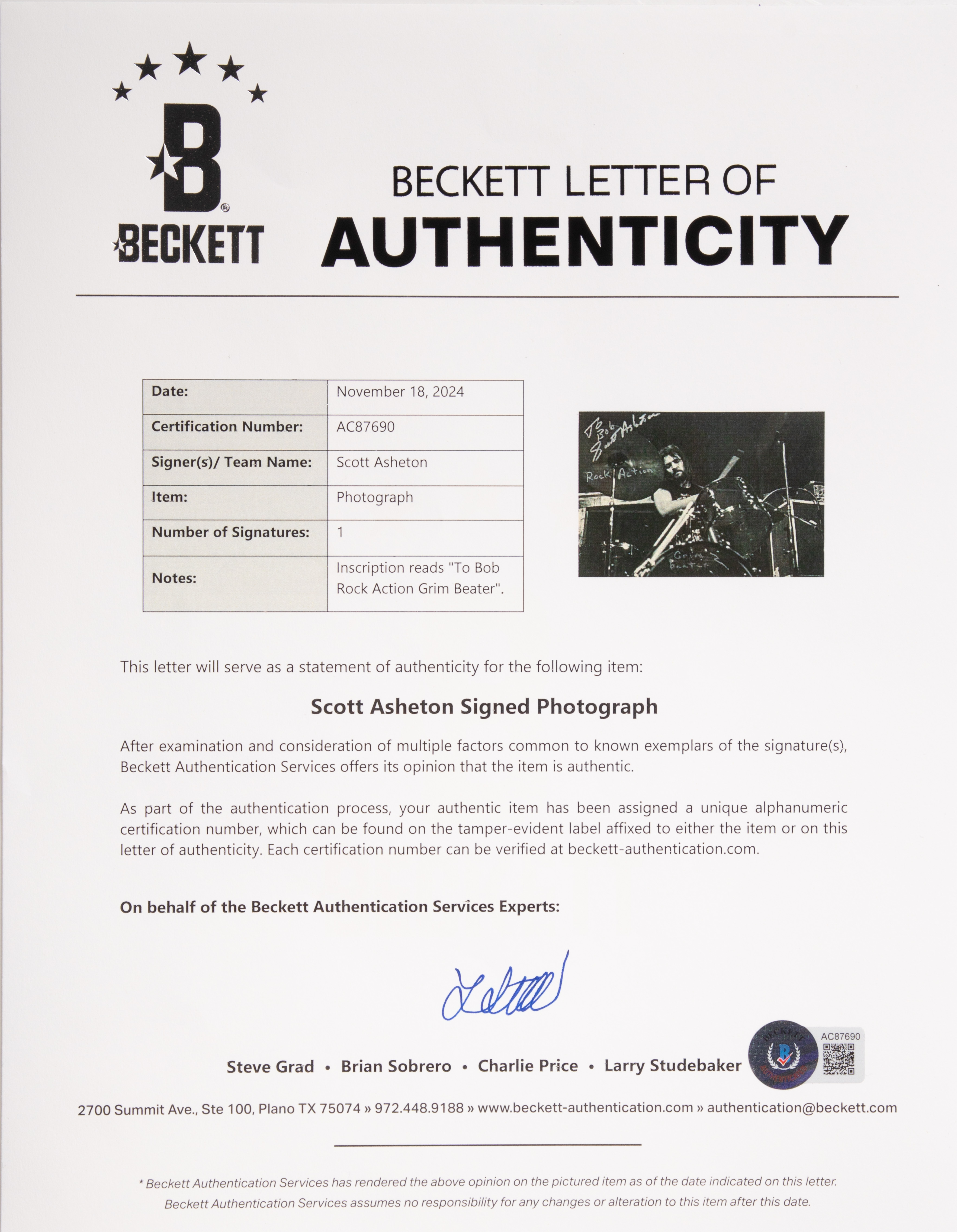 (6) items including an autographed picture of Scott Asheton of the Stooges having COA #AC87690 and hologram from Beckett as well as three having photographer blind stamp and two having personal annotations by photographer verso