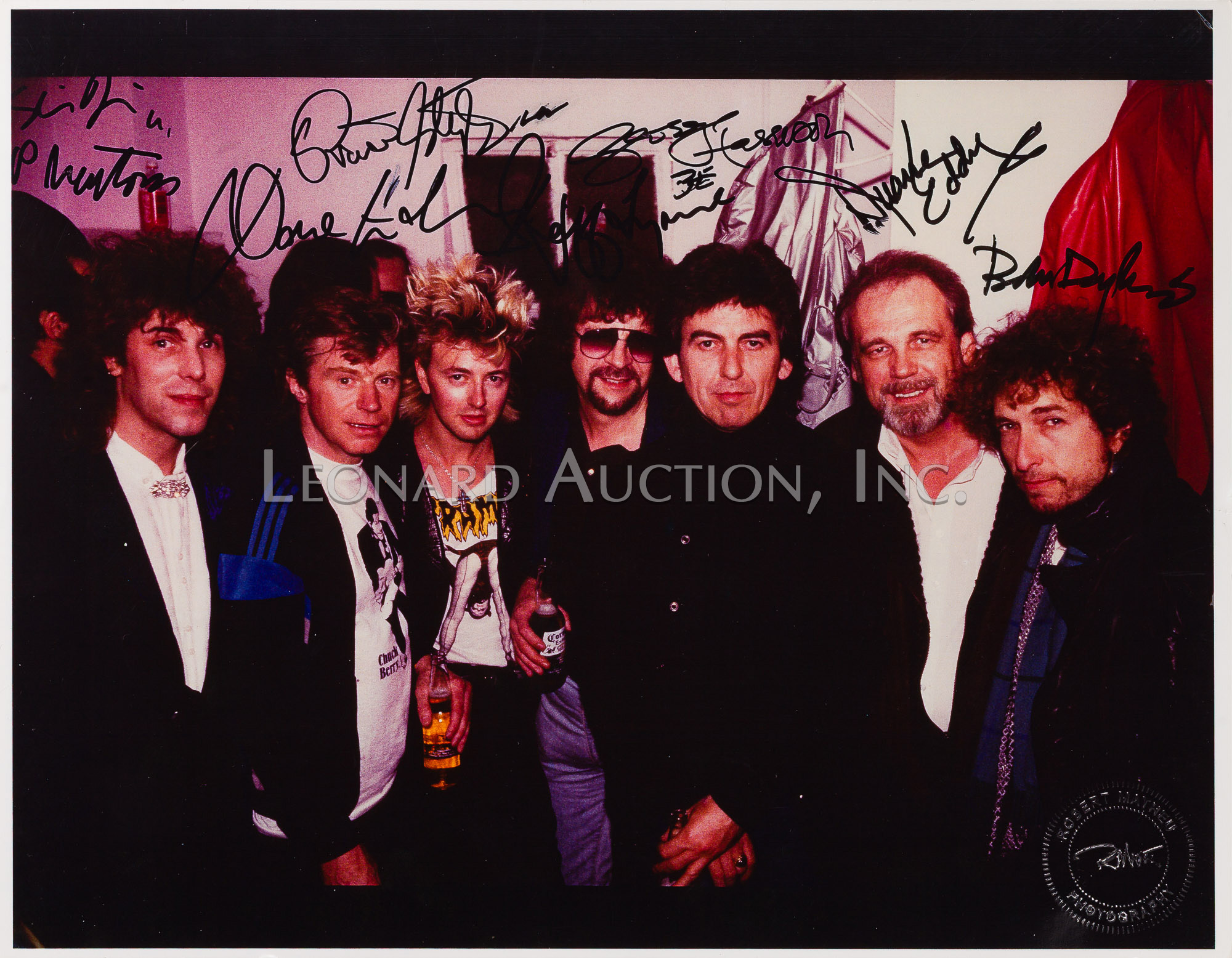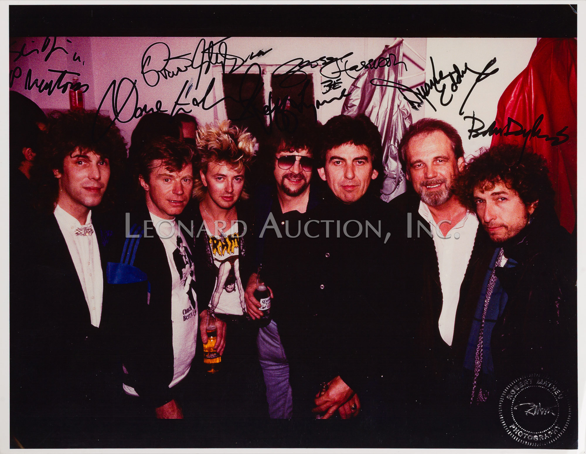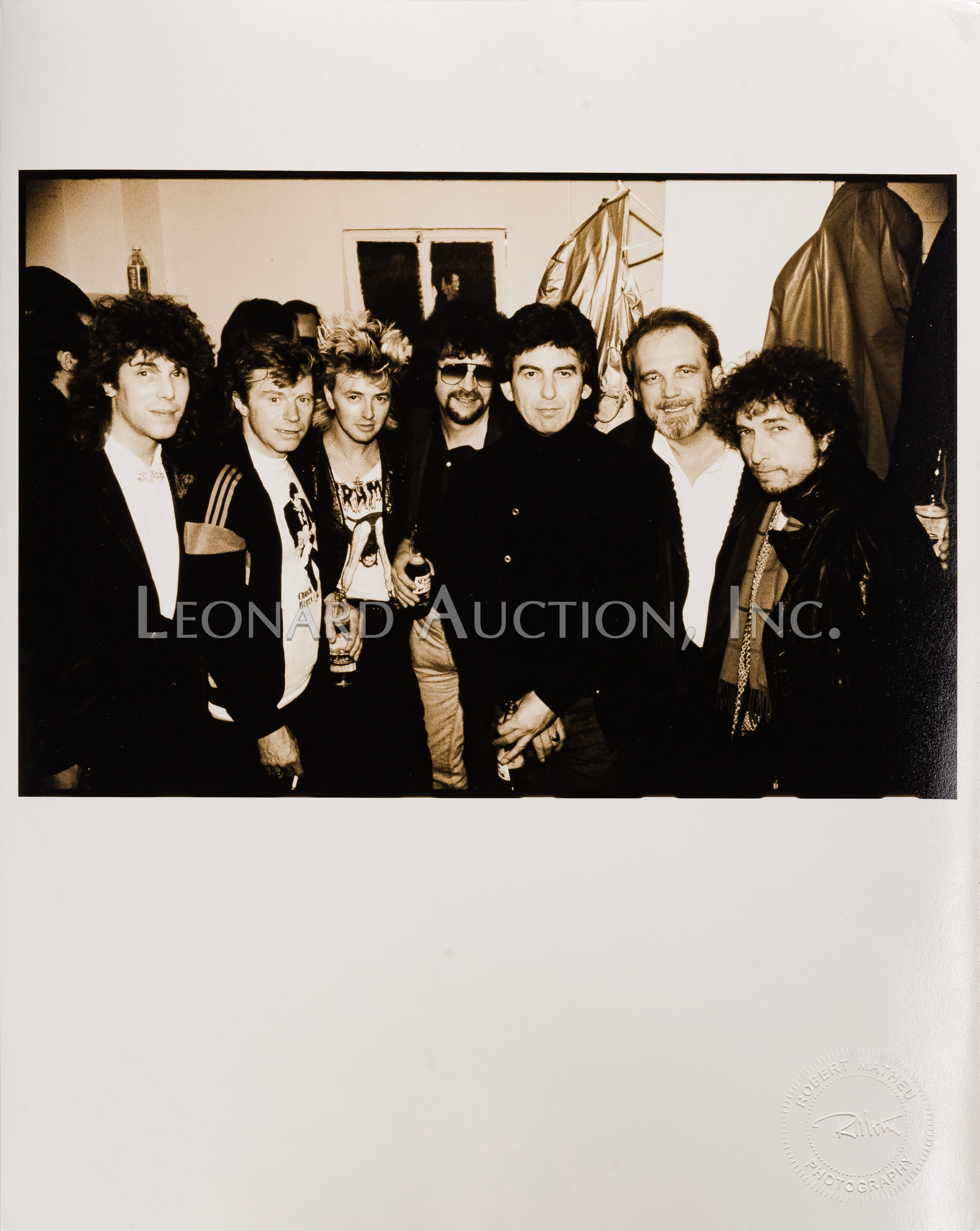 (3) items including (2) color images of a signed backstage photograph of Slim Jim Phantom, Dave Edmonds, Brian Setzer, Jeff Lynne, George Harrison, Duane Eddy and Bob Dylan as well as a black and white version, all having photographer blind stamp