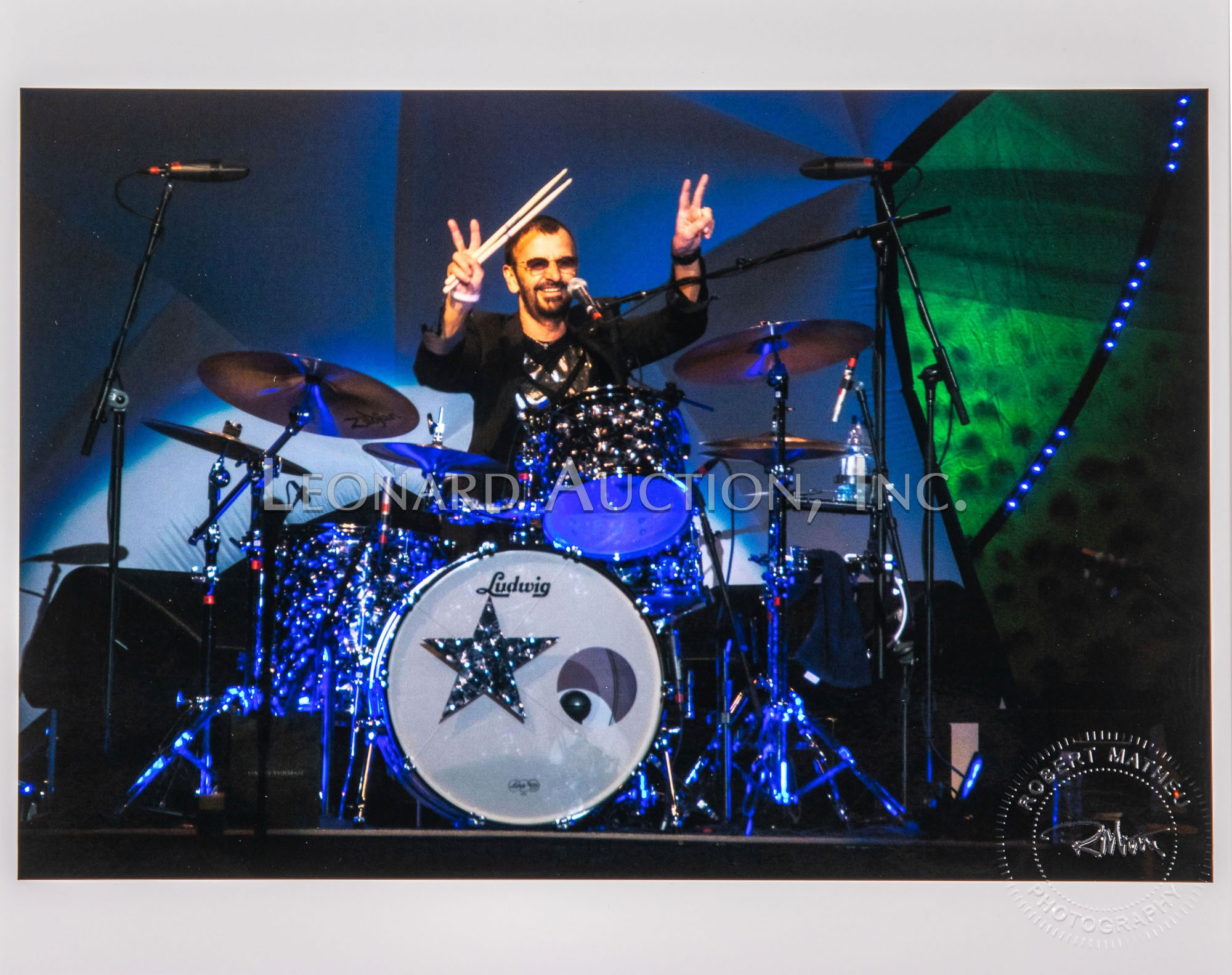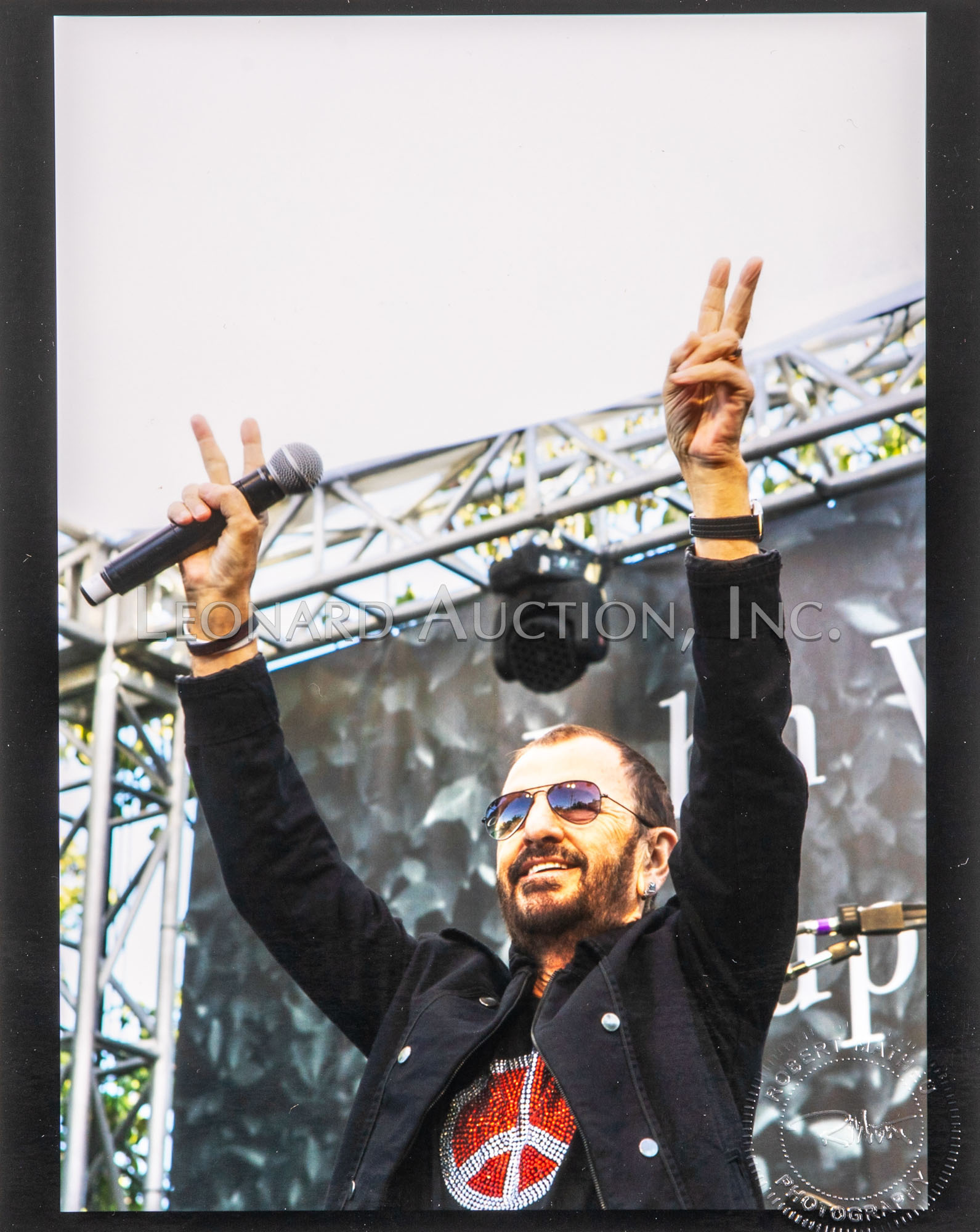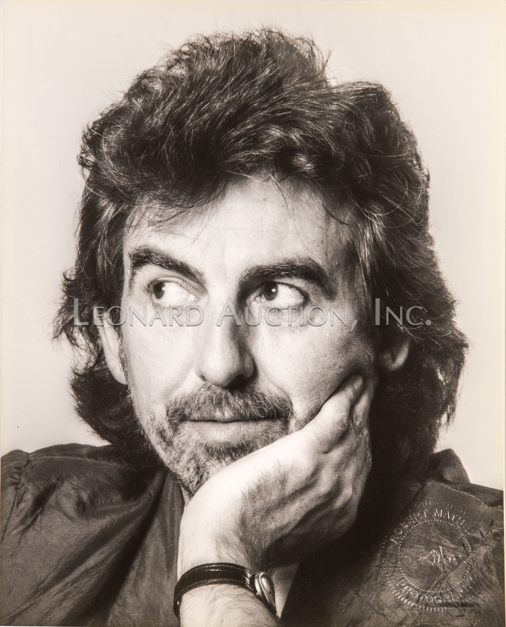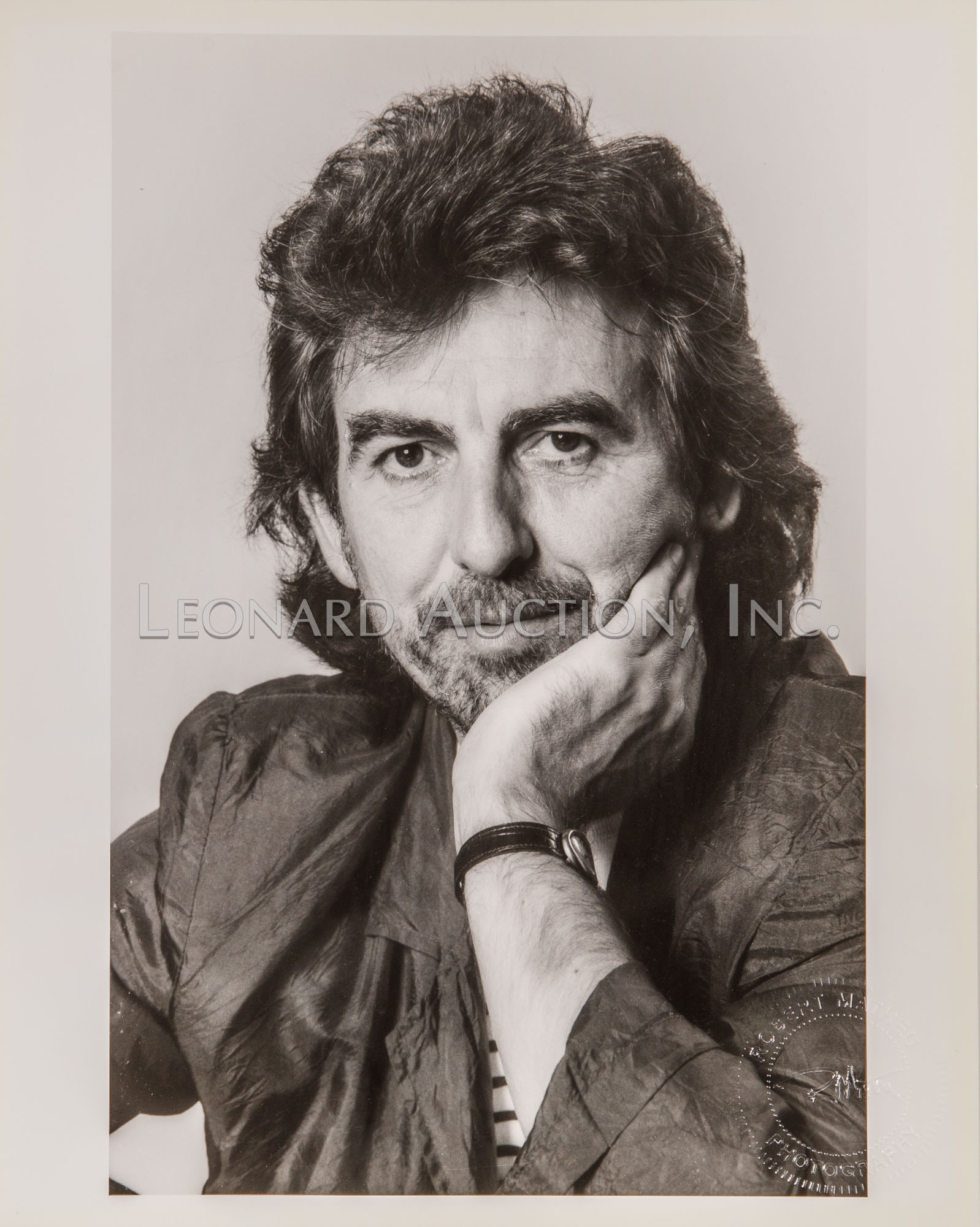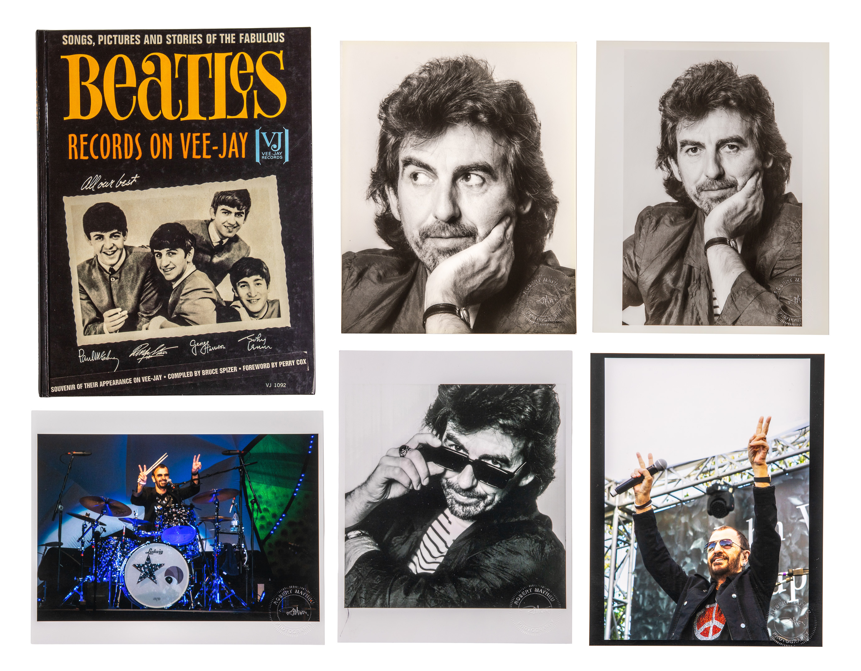 (6) total items including (3) black and white portraits of George Harrison and (2) color performance images of Ringo Starr, all having photographer blind stamp; together with a signed and inscribed 1998 hard cover 1st edition ‘Songs, Pictures and Stories of the Fabulous Beatles Records on Vee-Jay’ by Bruce Spizer