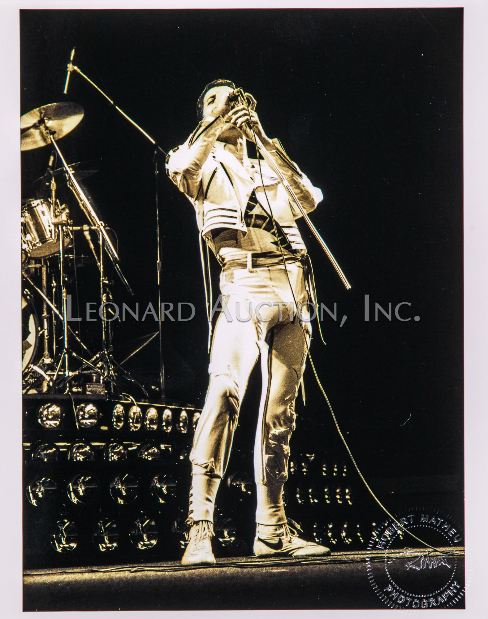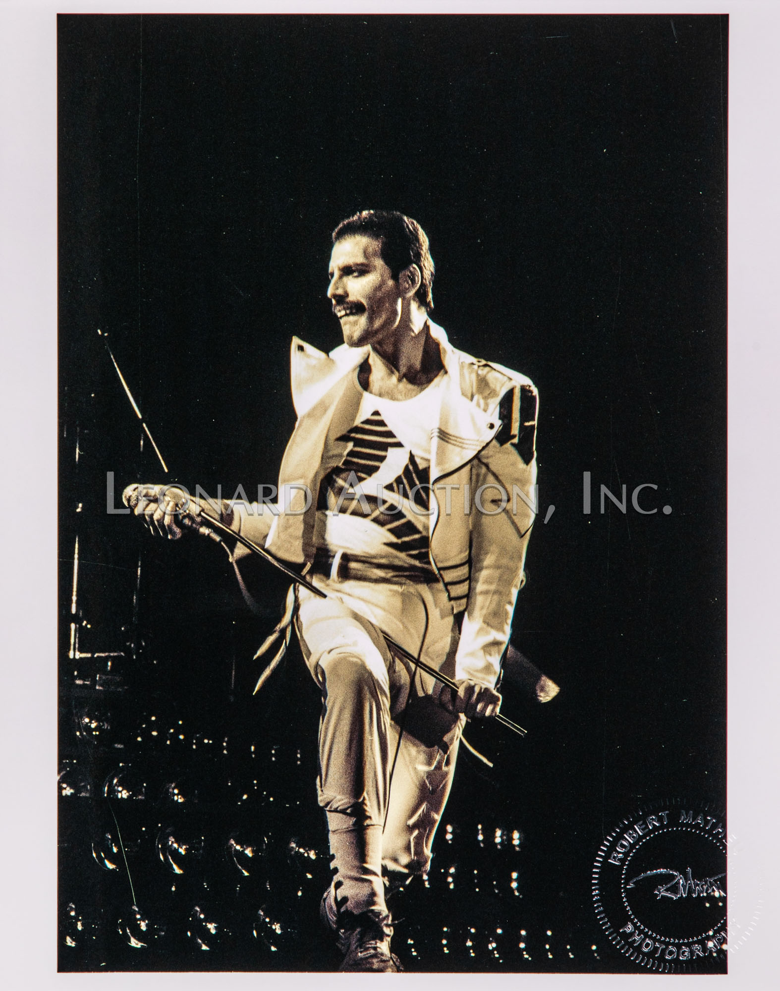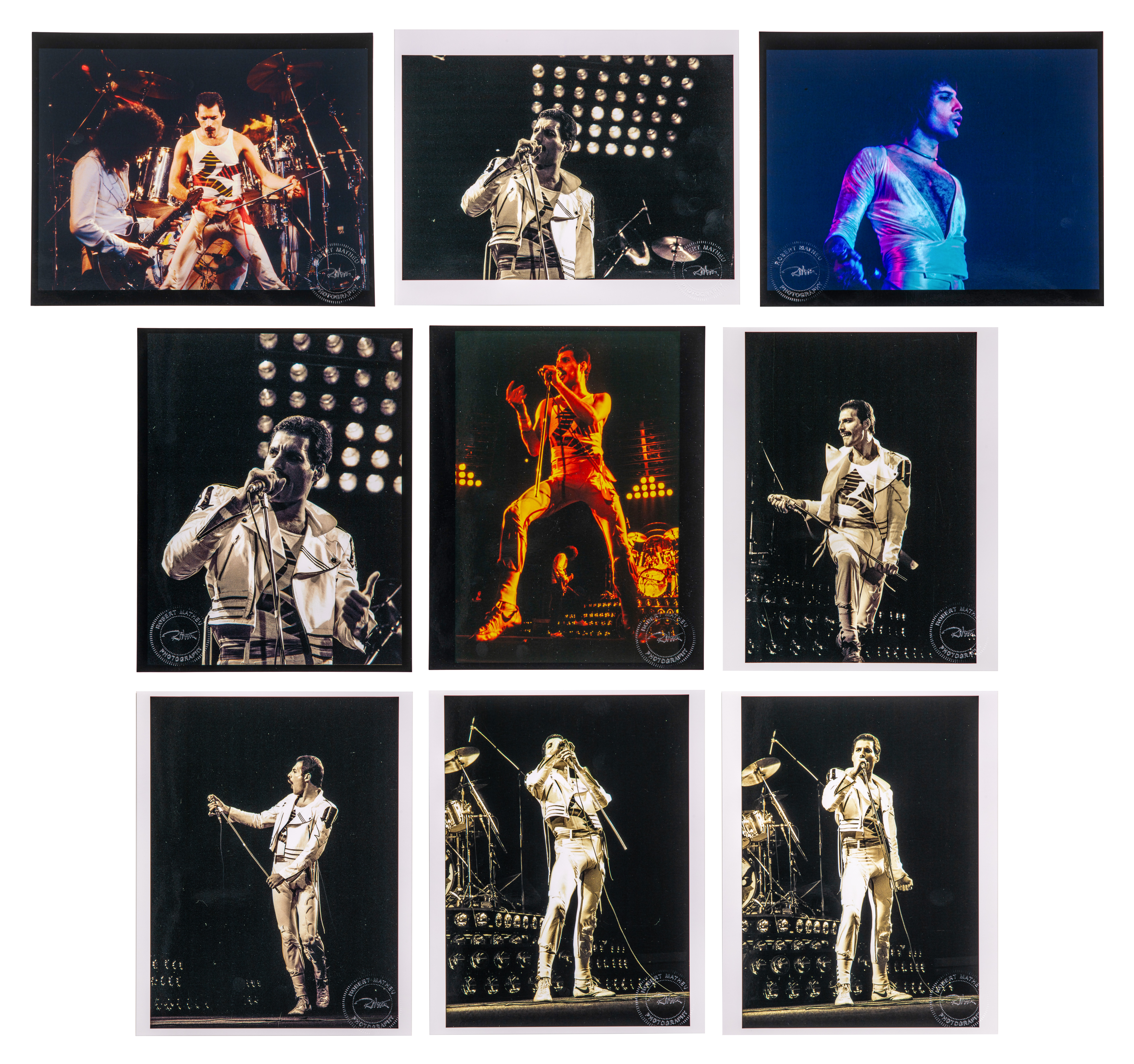 (9) black and white / color photographs of Freddie Mercury performing, all having photographer blind stamp