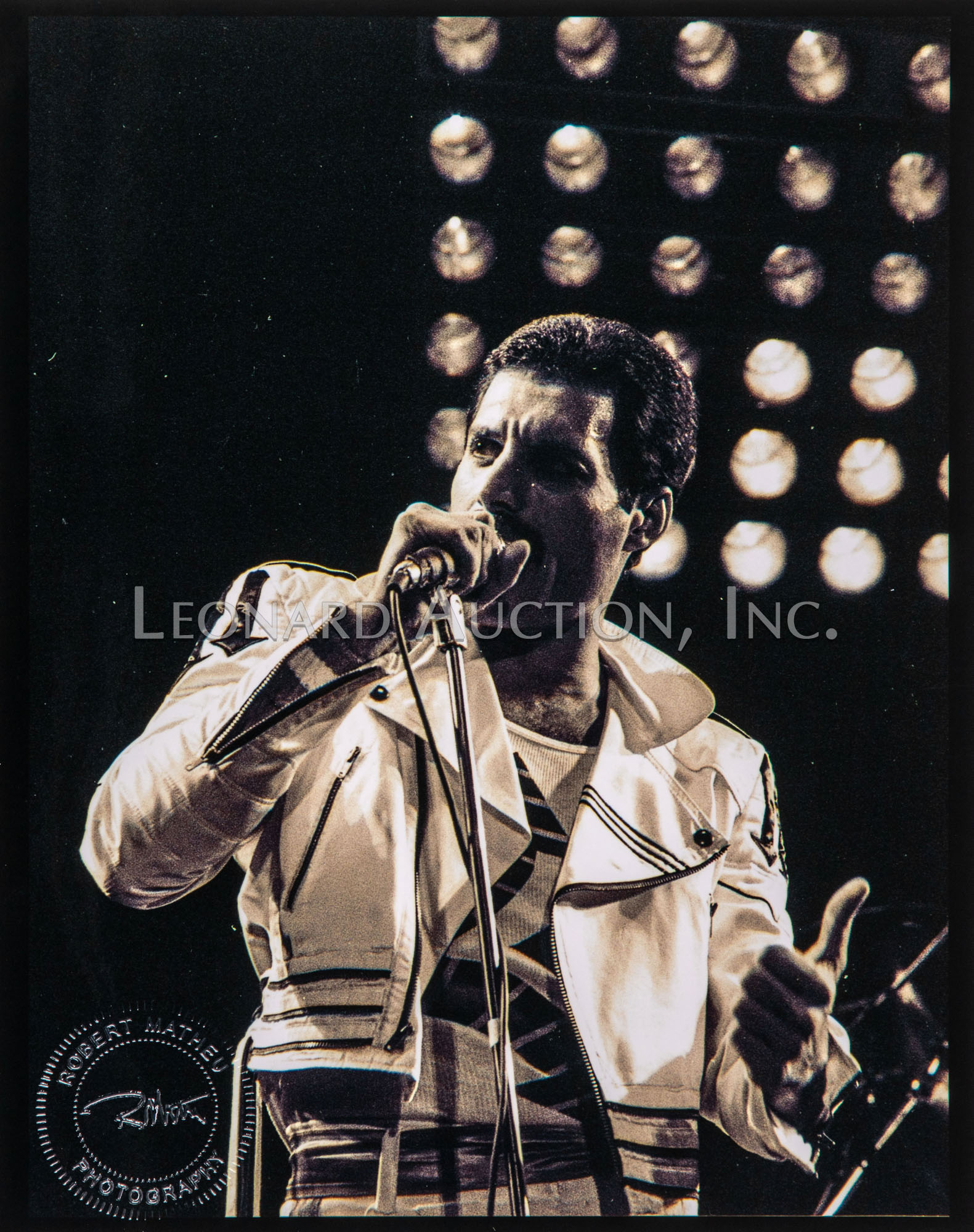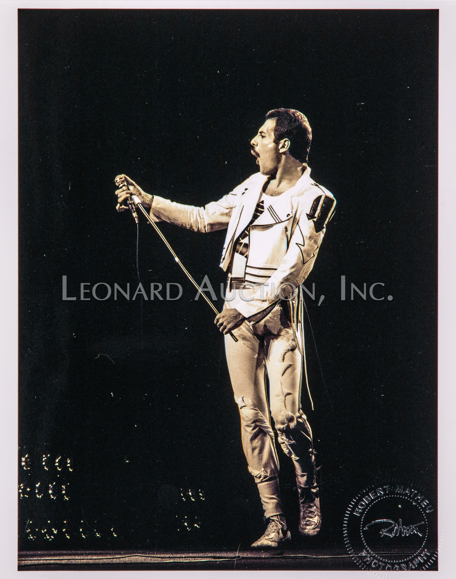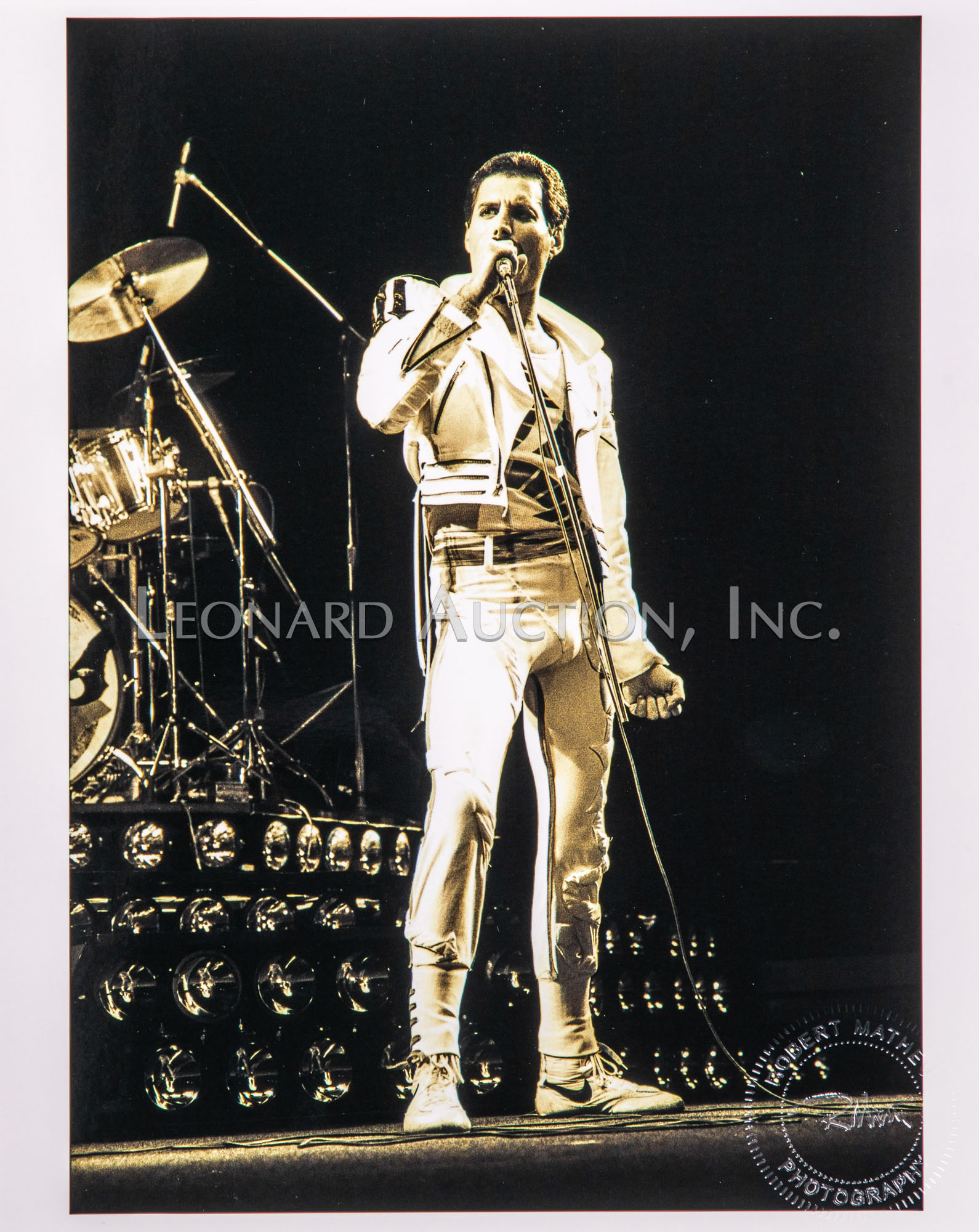 (9) black and white / color photographs of Freddie Mercury performing, all having photographer blind stamp