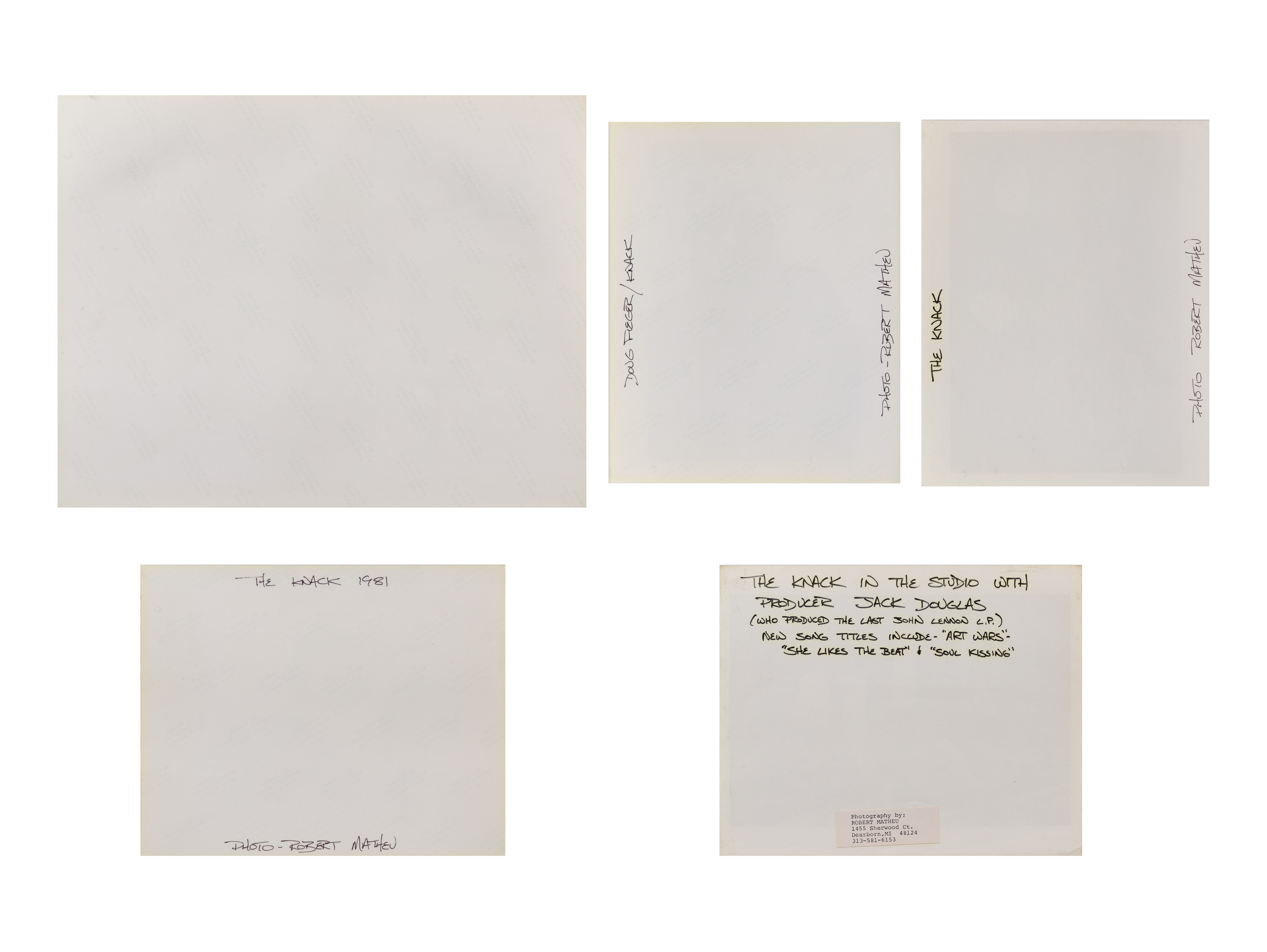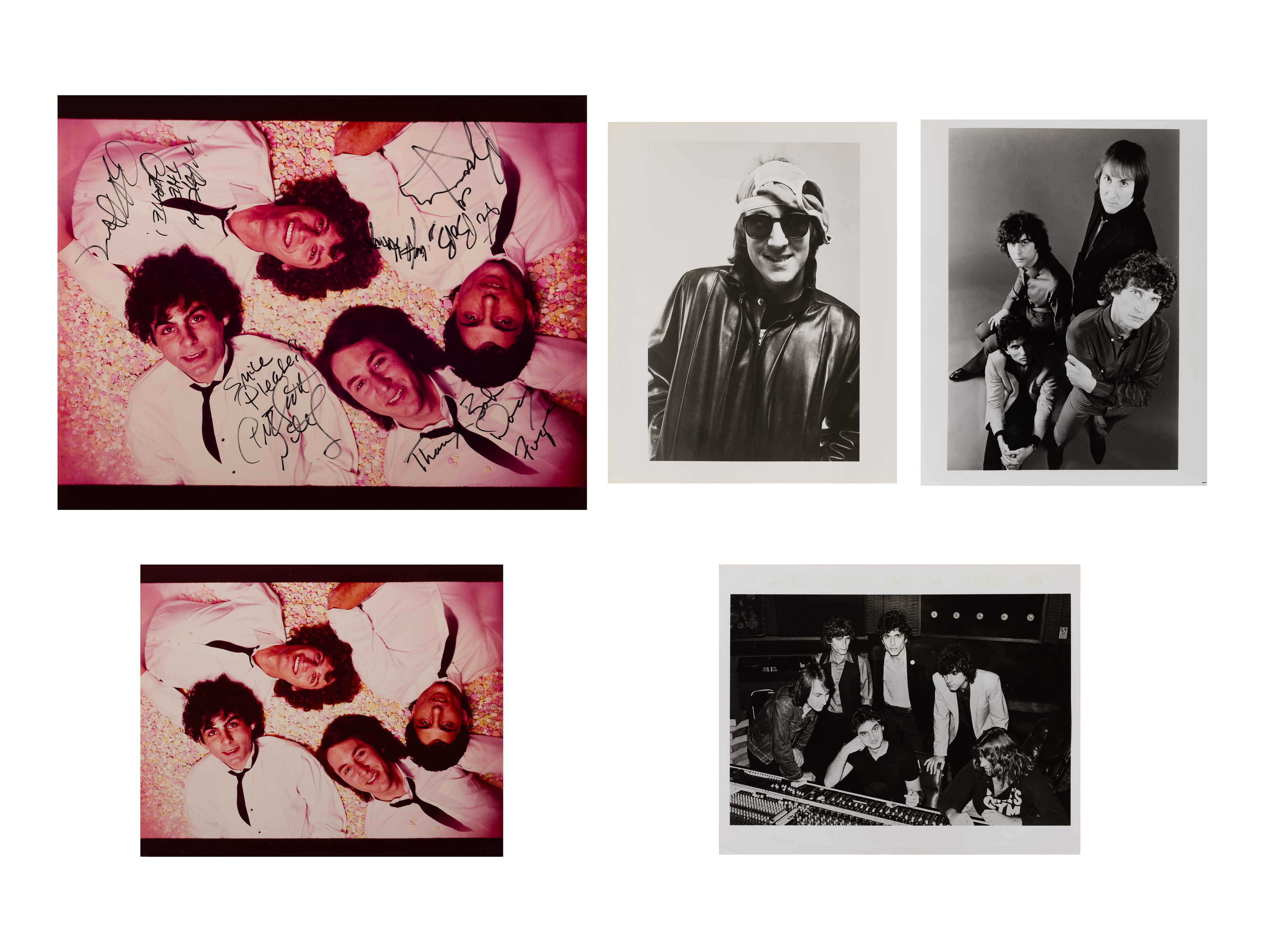 (5) items including a 1981 14 x 11-inch color promotional group shot signed by Doug Fieger and band members, a 10 x 8-inch print of the same image, (3) black and white including a promotional group image, an image of the band in the recording studio with producer Jack Douglas and a portrait of Doug Fieger, some having annotations and photographer signature verso