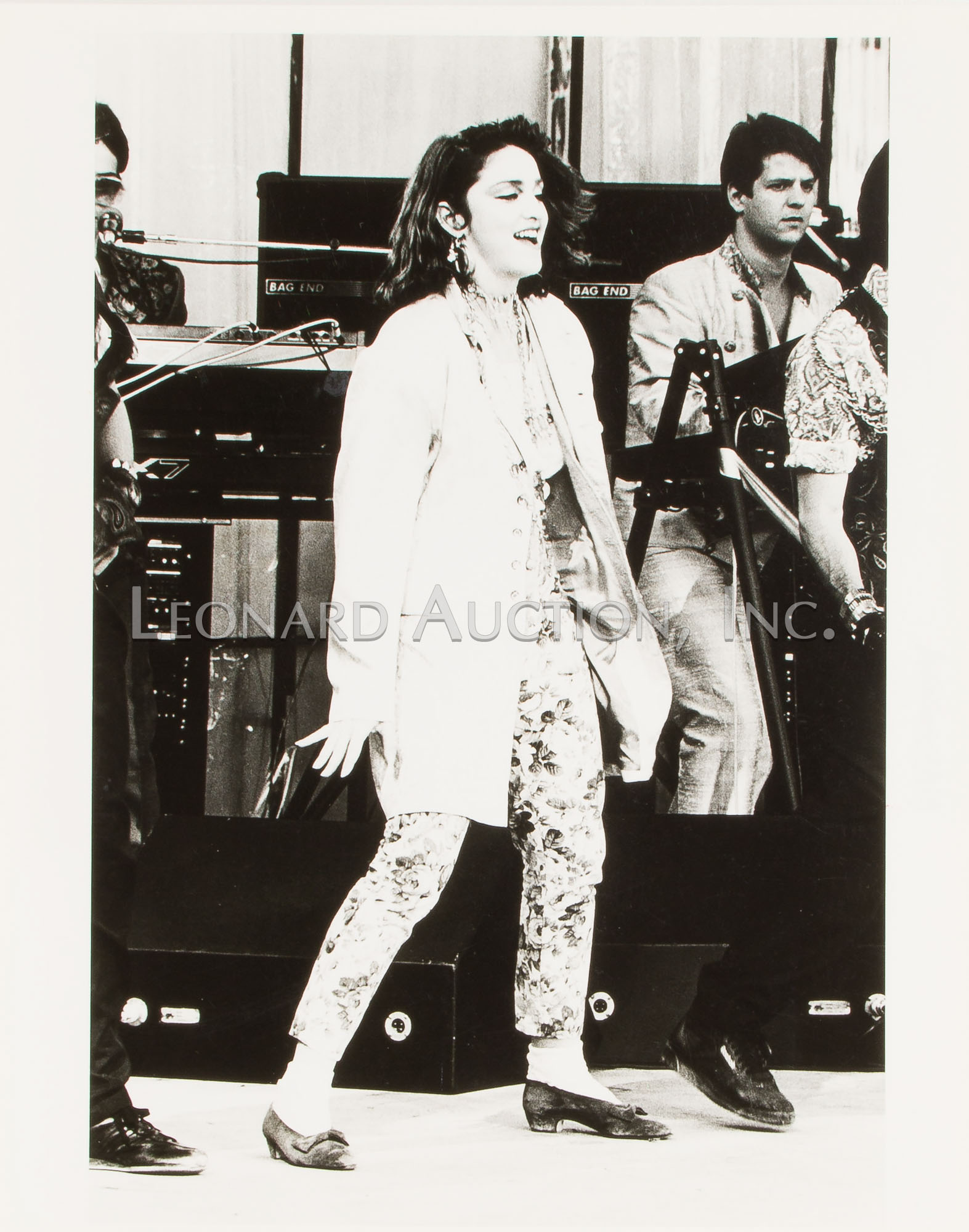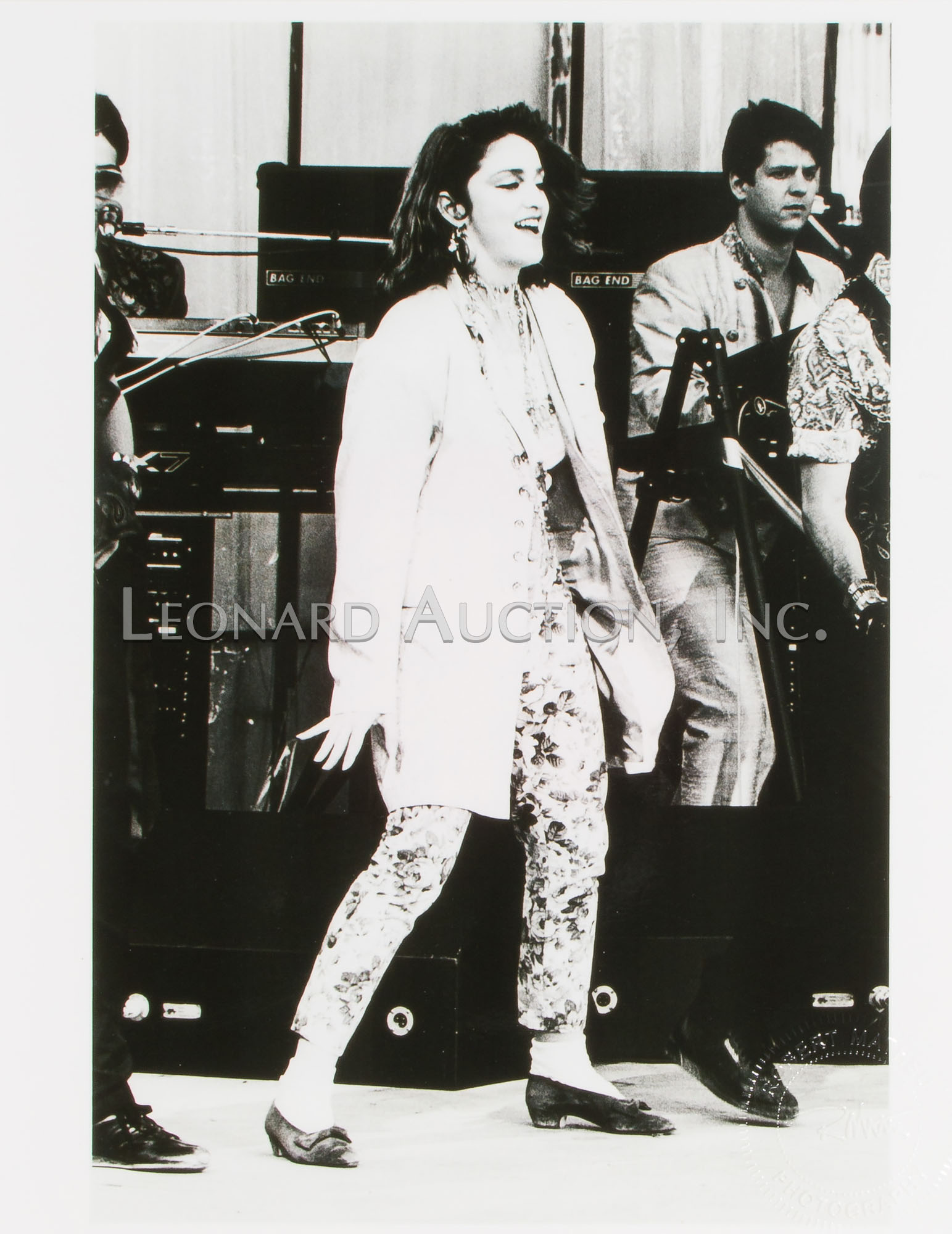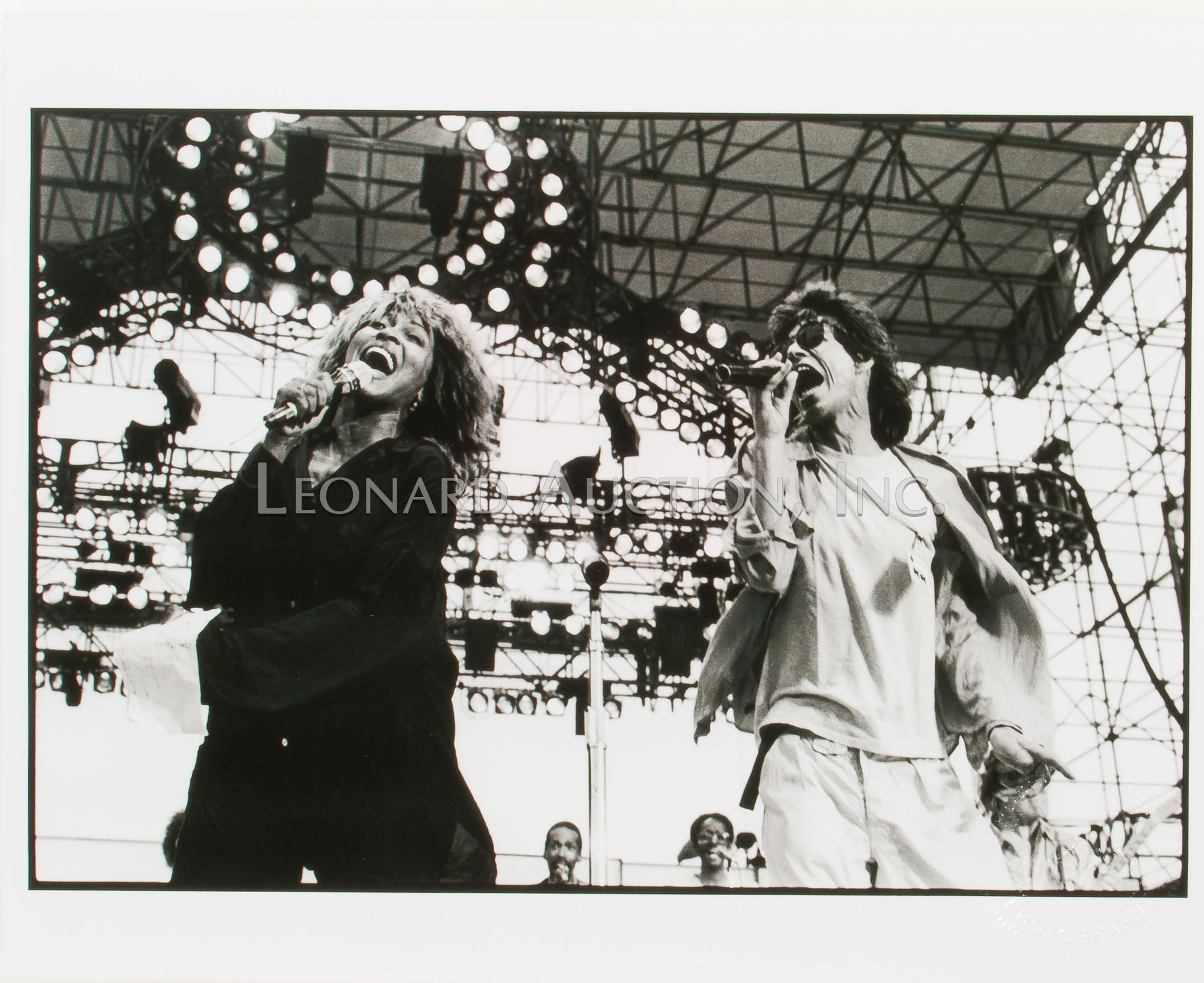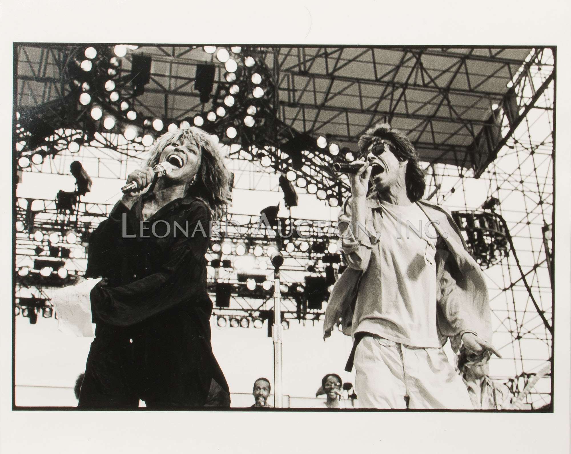 (6) items including (3) black and white photographs of Madonna and (3) photographs of Mick Jagger and Tina Turner practicing and performing for Live Aid 1985, two having photographer blind stamp, three having photographer annotations, color of Mick and Tina unmarked