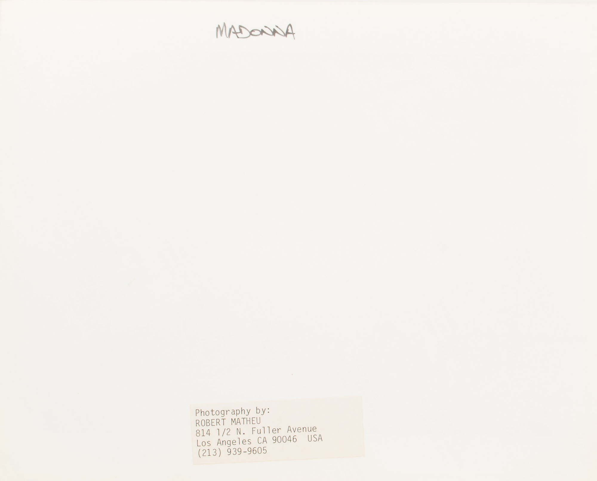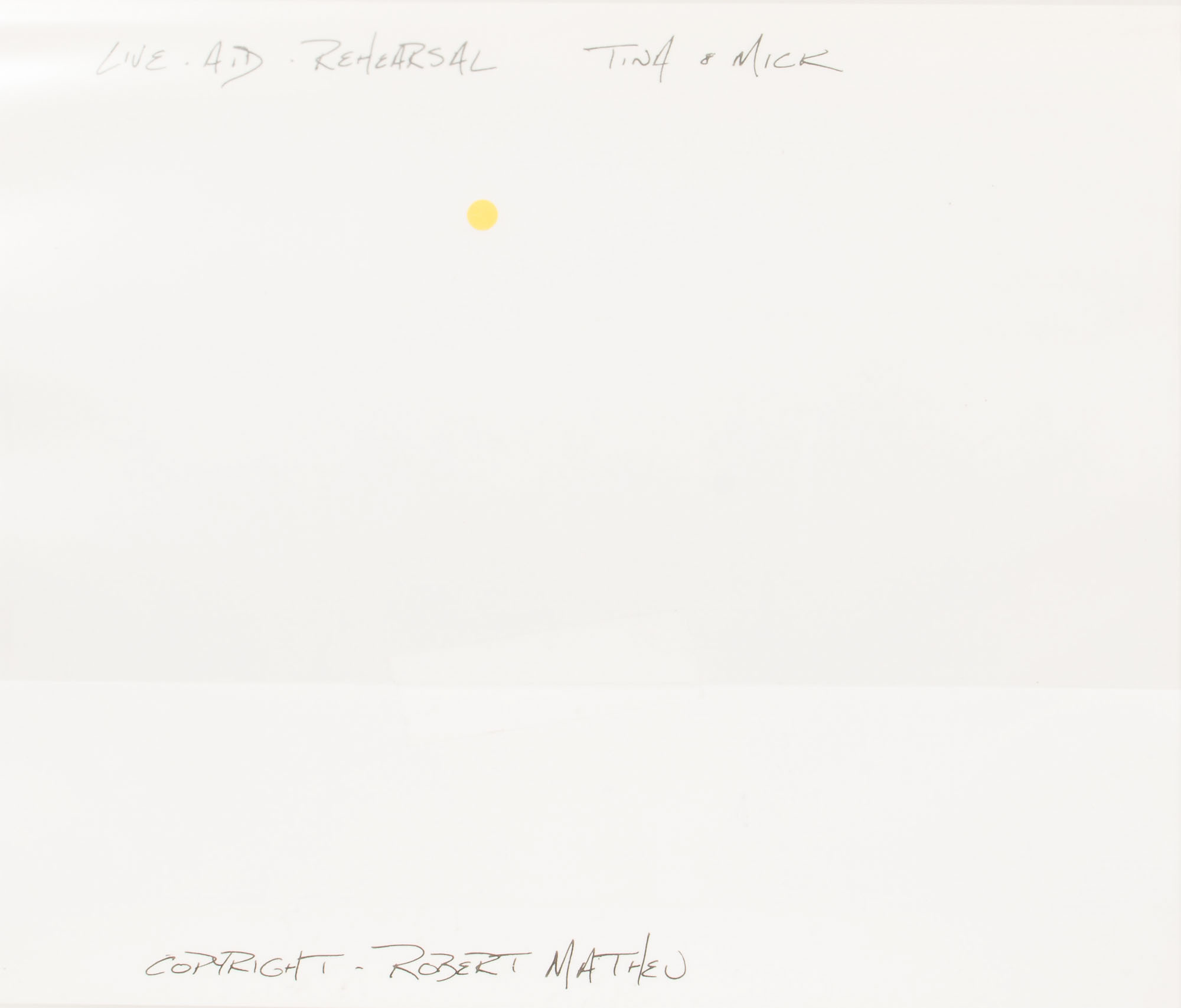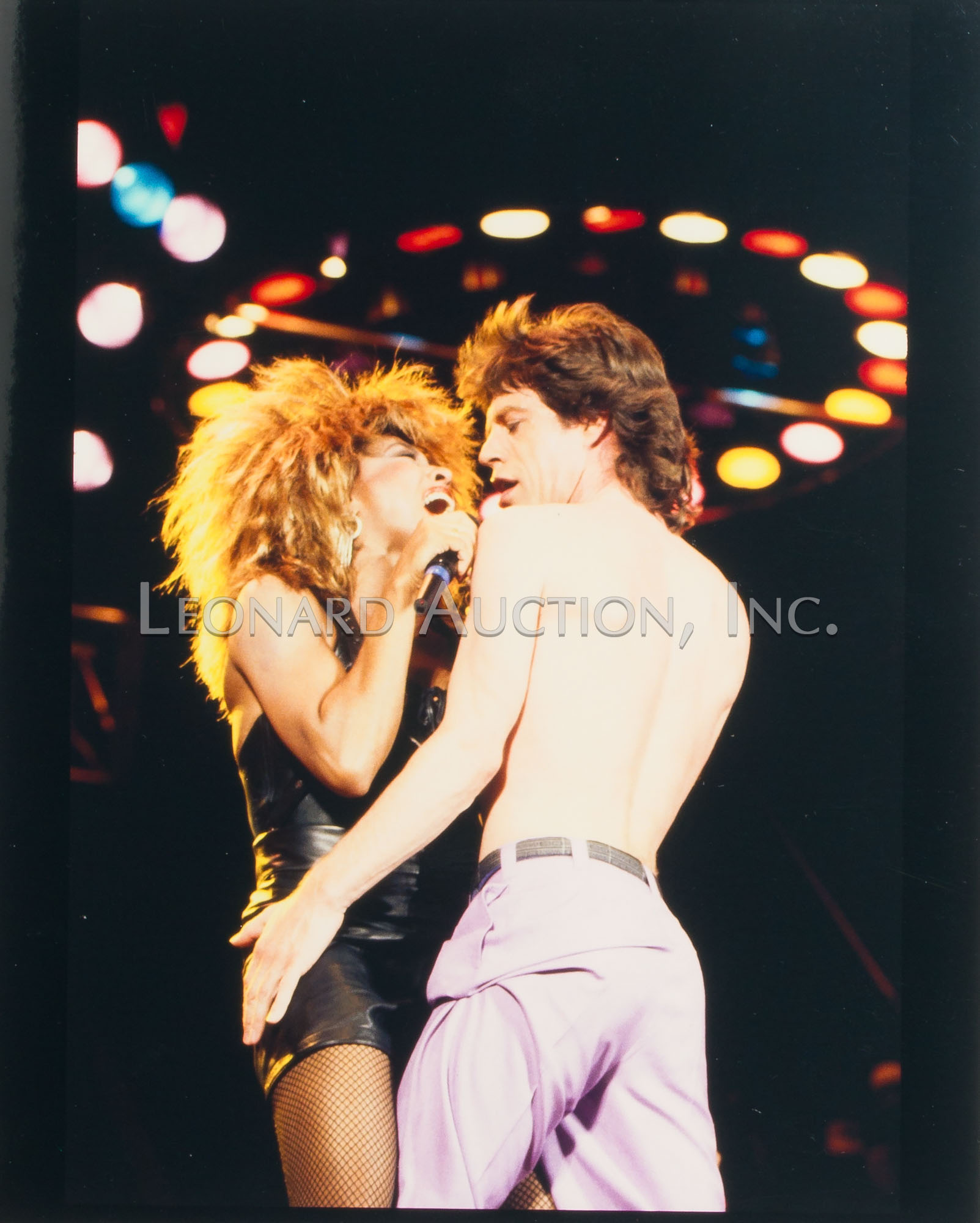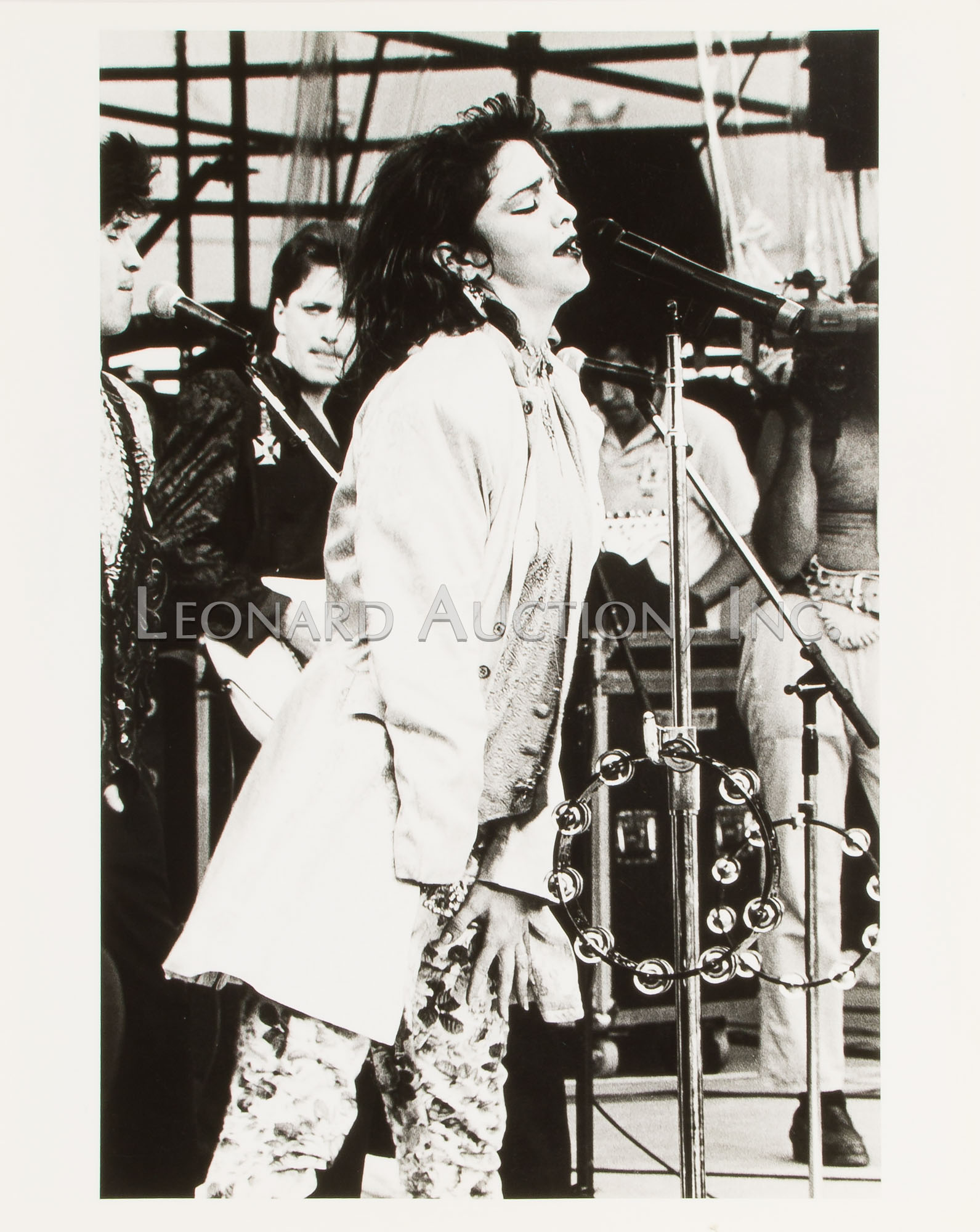 (6) items including (3) black and white photographs of Madonna and (3) photographs of Mick Jagger and Tina Turner practicing and performing for Live Aid 1985, two having photographer blind stamp, three having photographer annotations, color of Mick and Tina unmarked