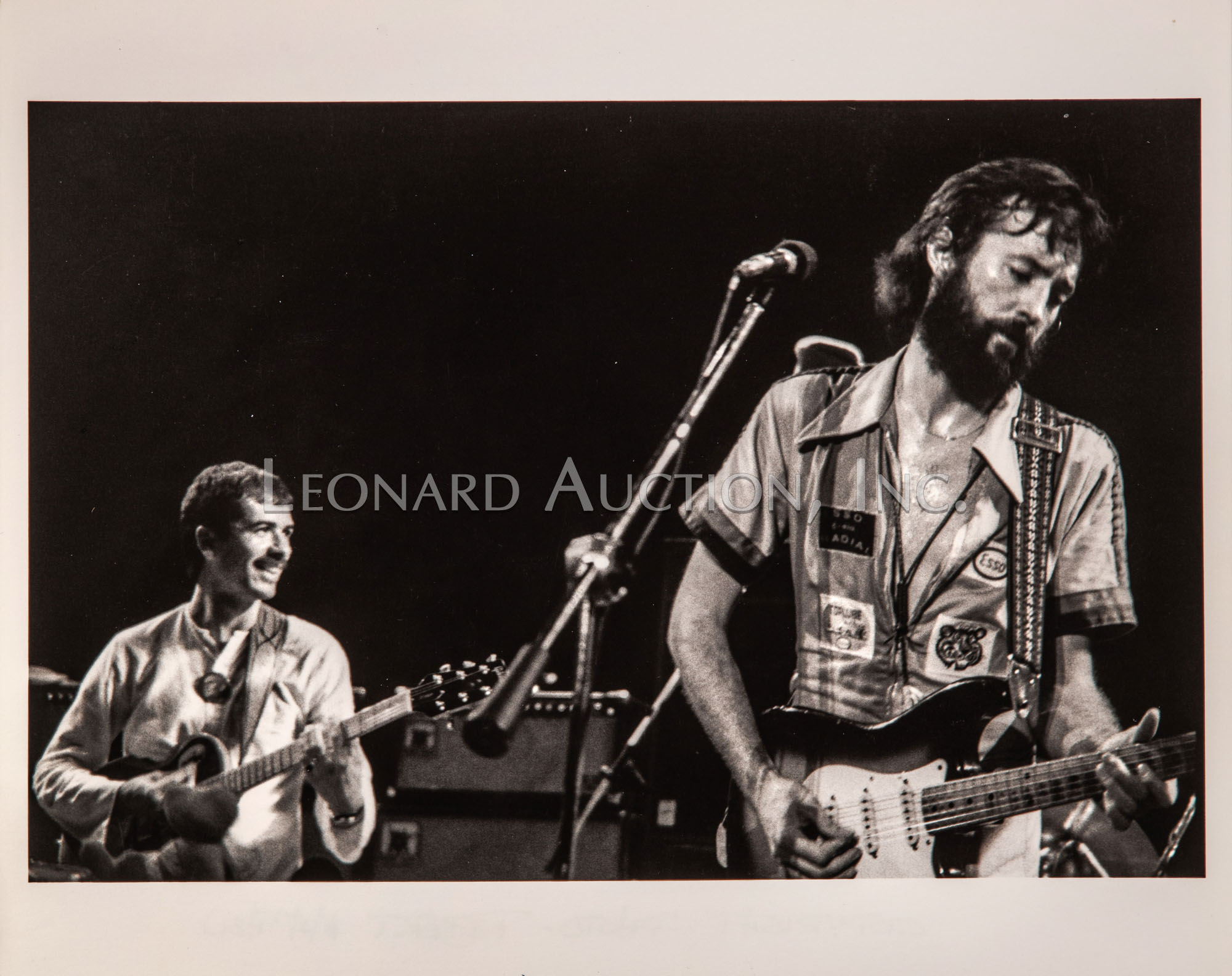 (6) black and white / color photographs of Eric Clapton performances including with Bing Faith and Carlos Santana, two color having photographer blind stamp, all other having photographer annotation, one with label