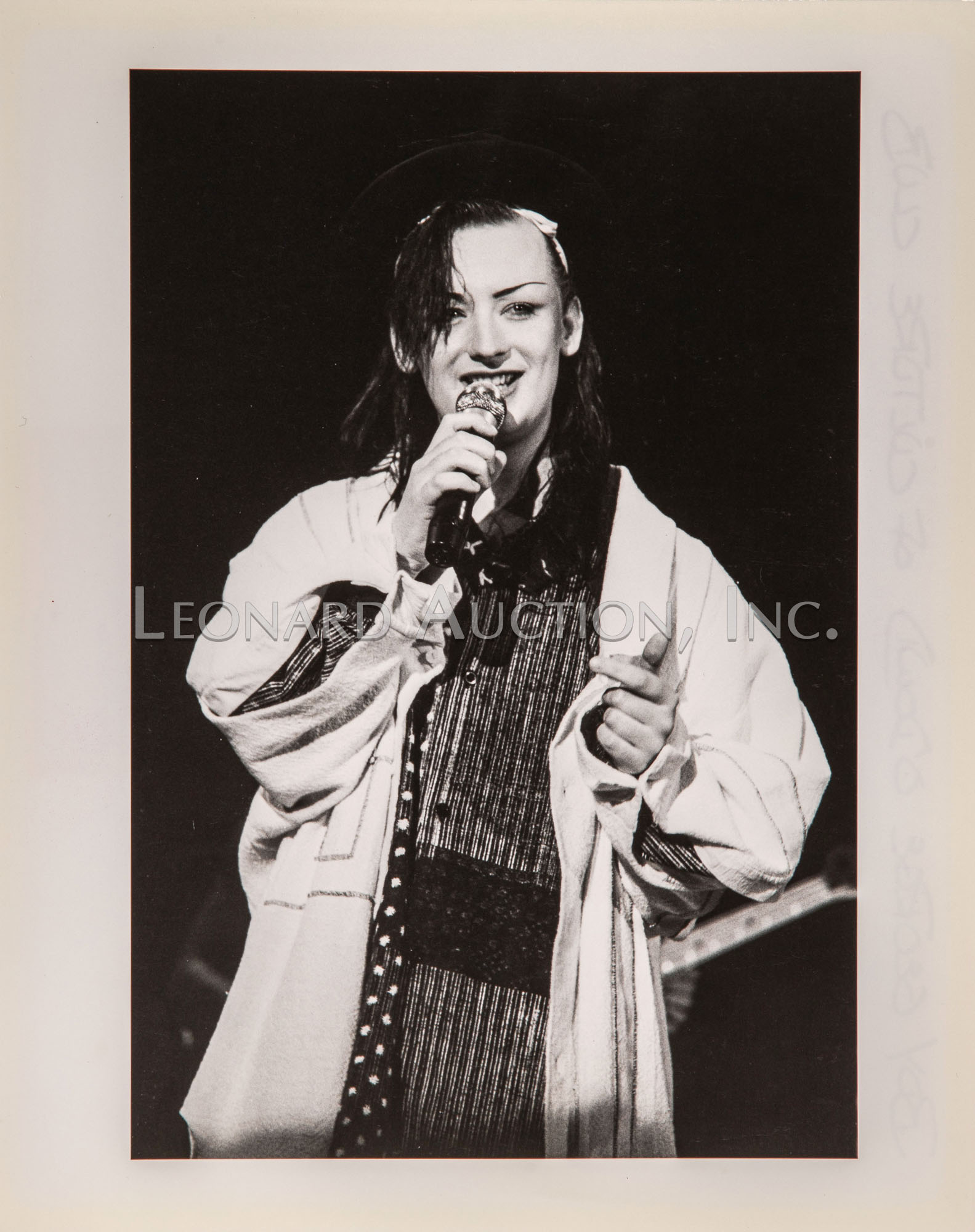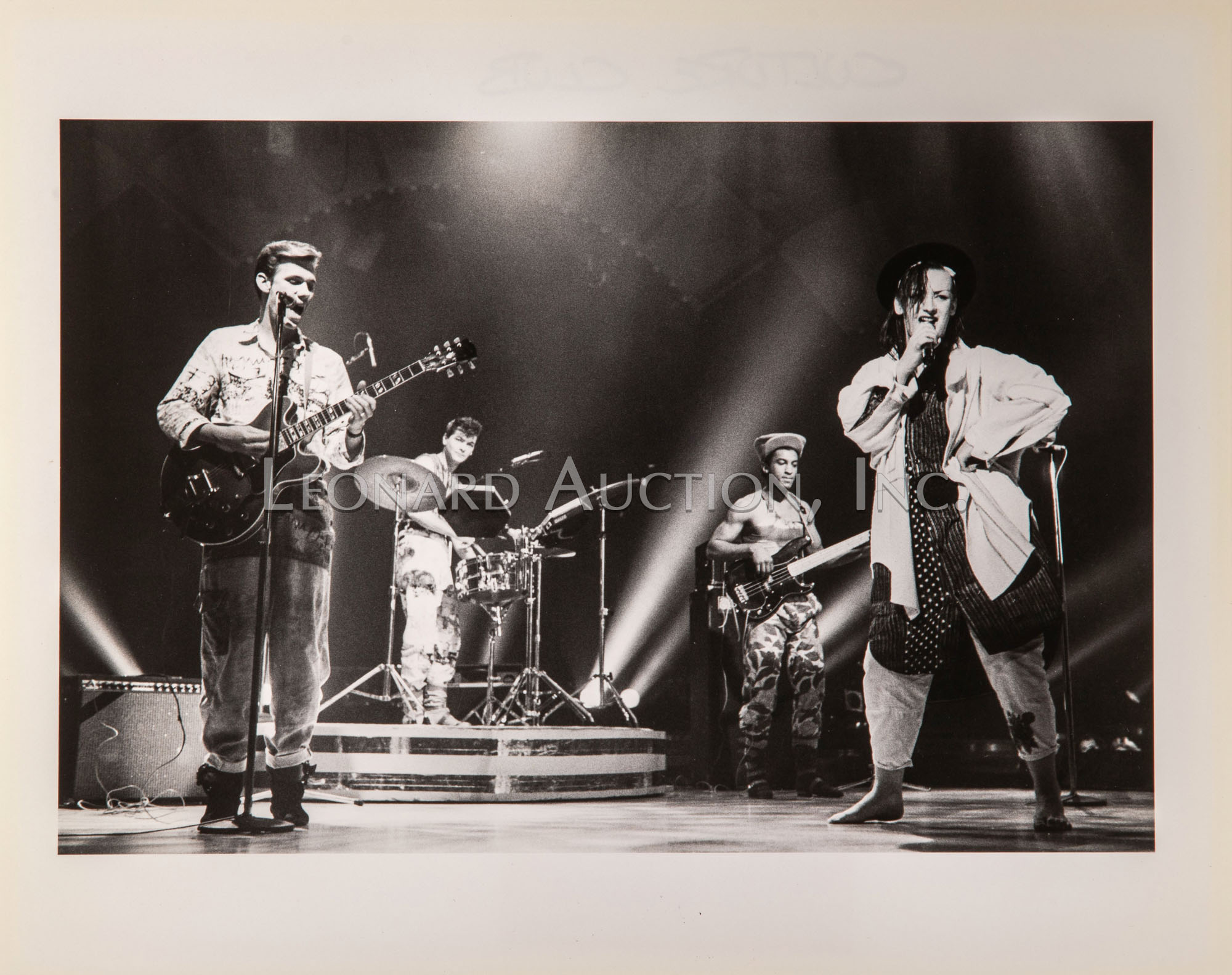 (4) black and white photographs of Boy George and Culture Club, having photographer annotations and label verso