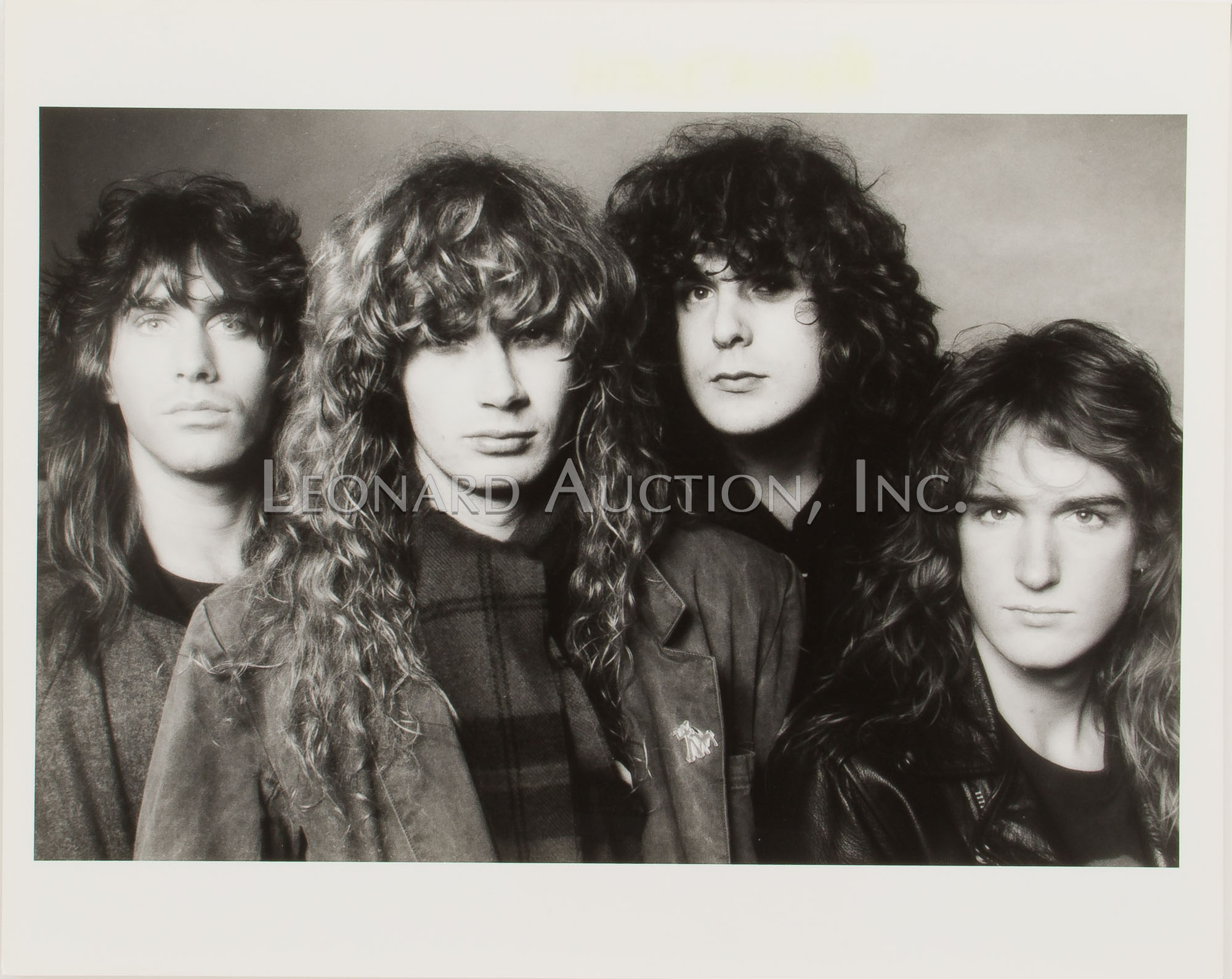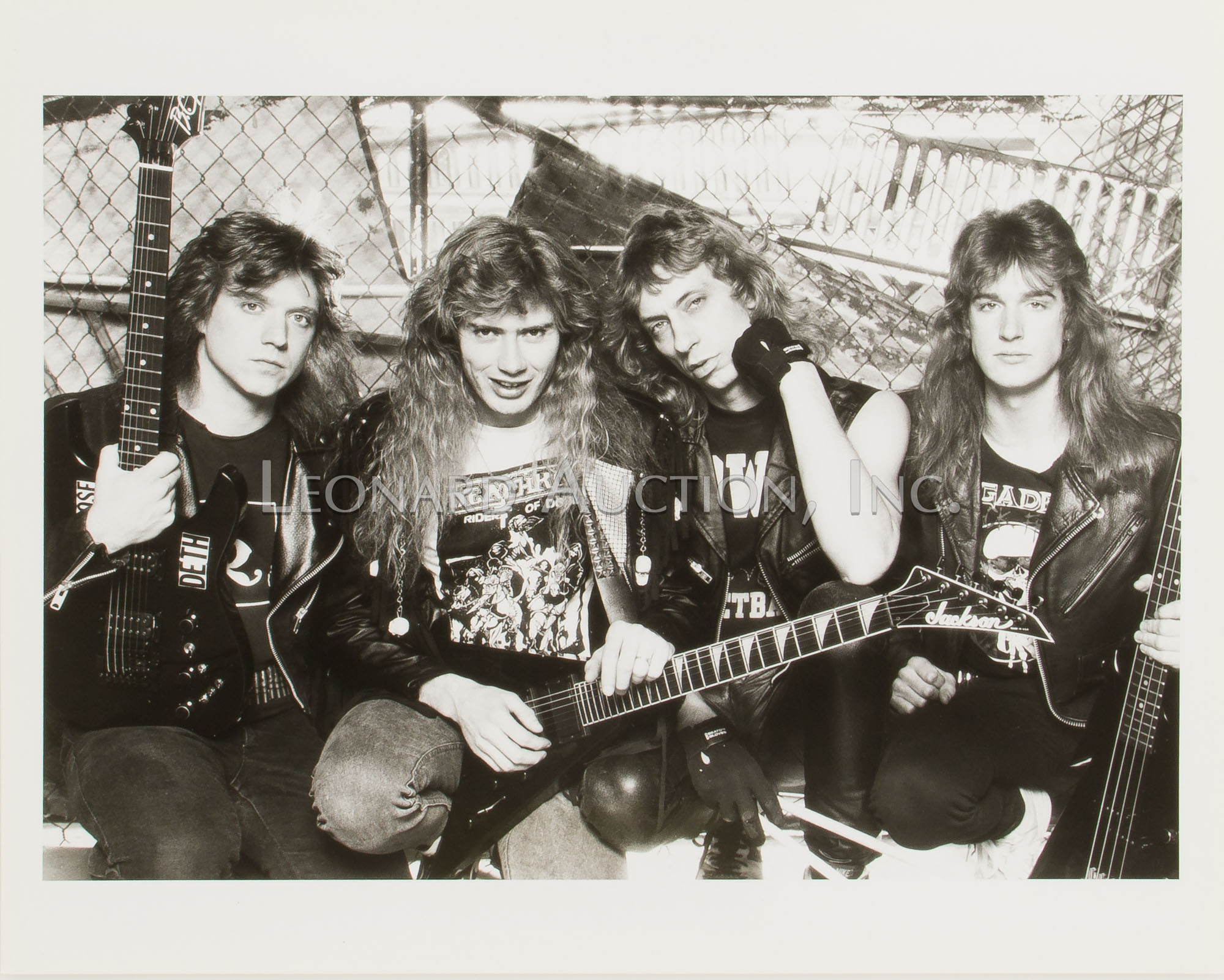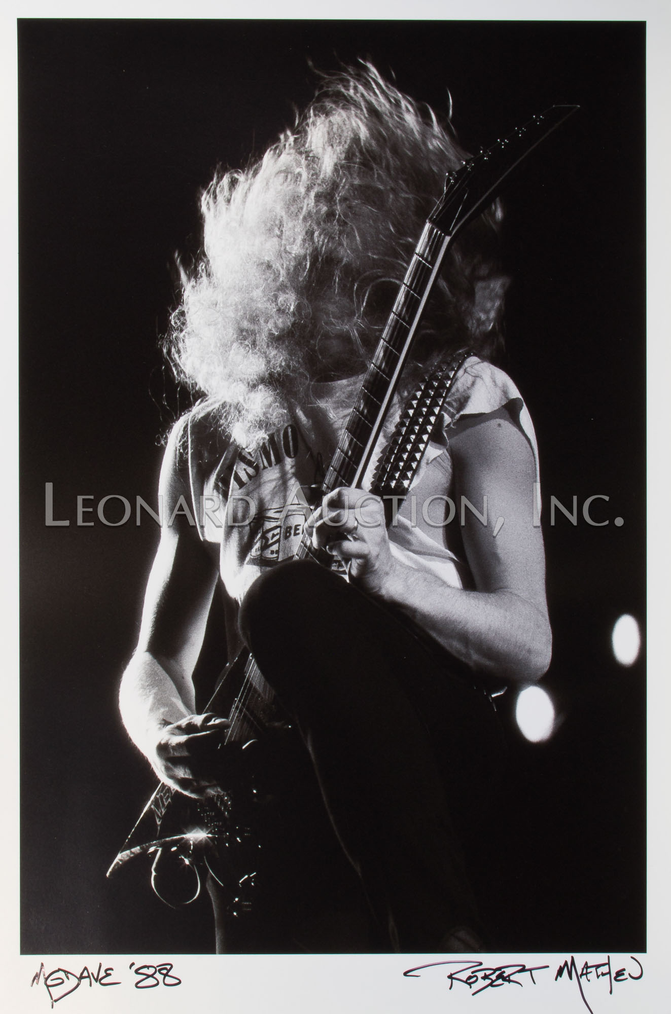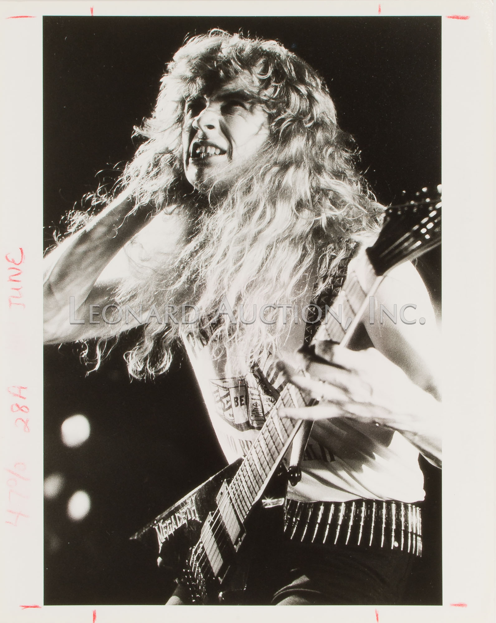 (9) items including a black and white image of Megadeth guitarist Dave Mustaine ink signed ‘MGDave ’88’ lower left and by photographer lower right, (4) black and white Megadeth images having photographer label verso, (2) color Metallica having blind stamp and (2) color Motley Crue having blind stamp and (1) black and white having label verso
