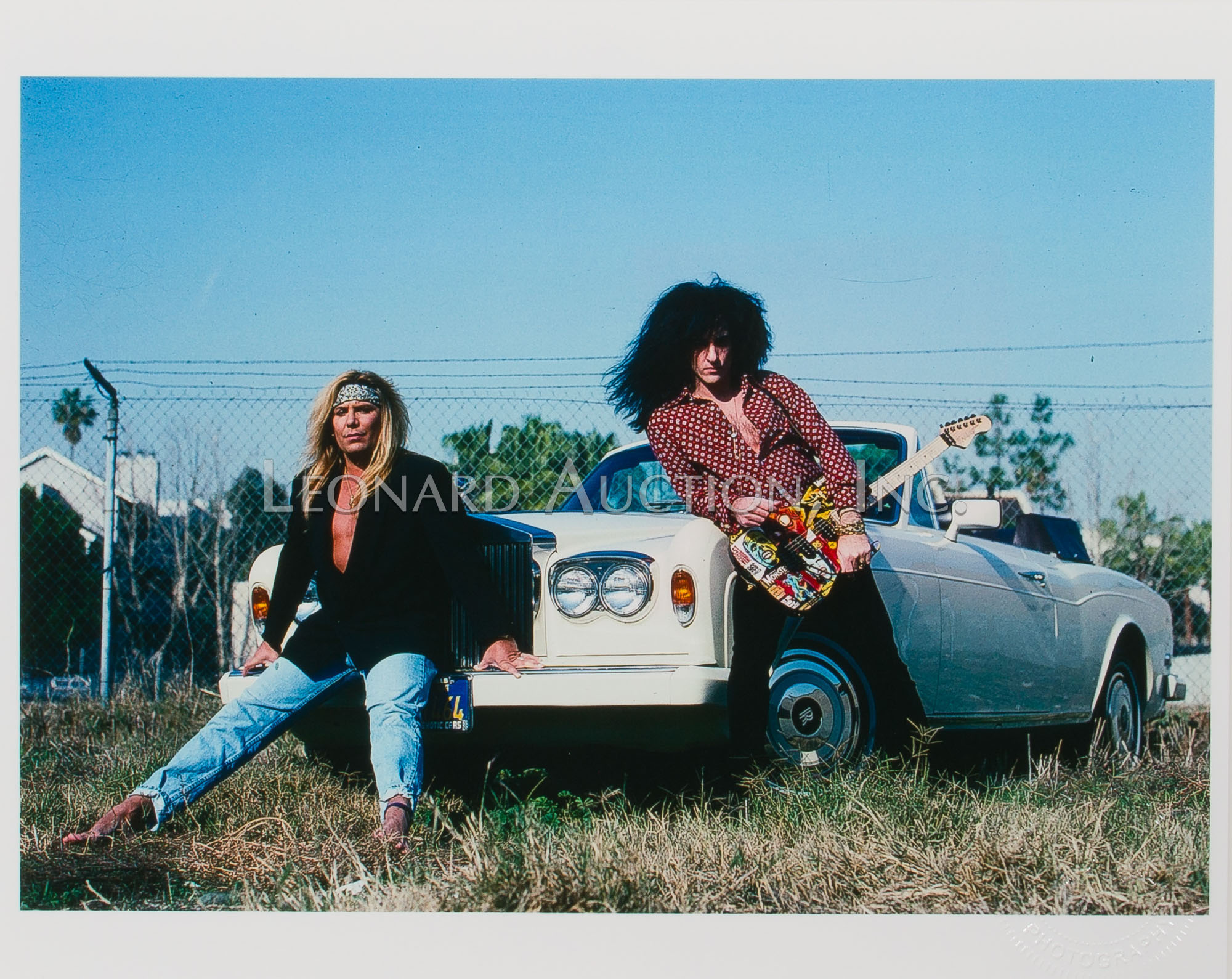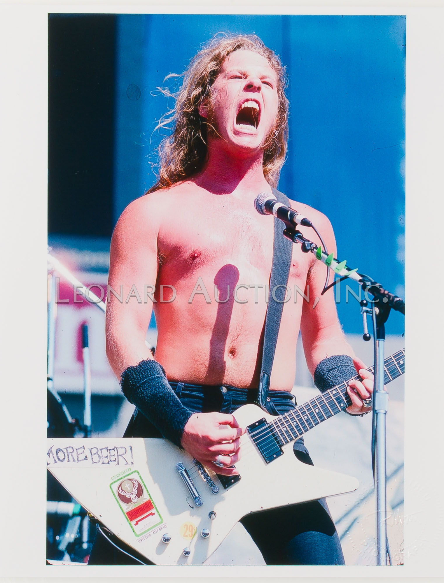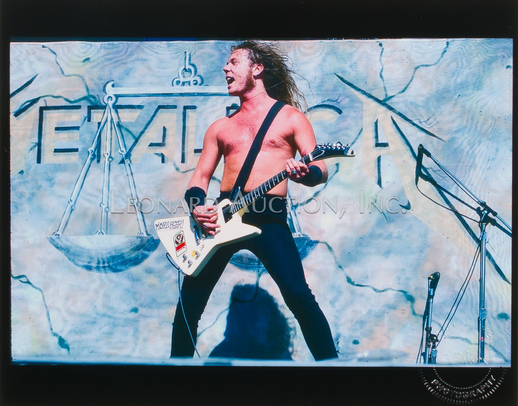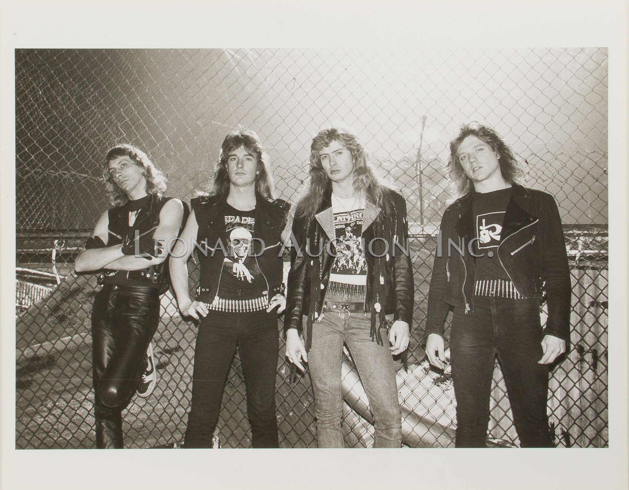 (9) items including a black and white image of Megadeth guitarist Dave Mustaine ink signed ‘MGDave ’88’ lower left and by photographer lower right, (4) black and white Megadeth images having photographer label verso, (2) color Metallica having blind stamp and (2) color Motley Crue having blind stamp and (1) black and white having label verso