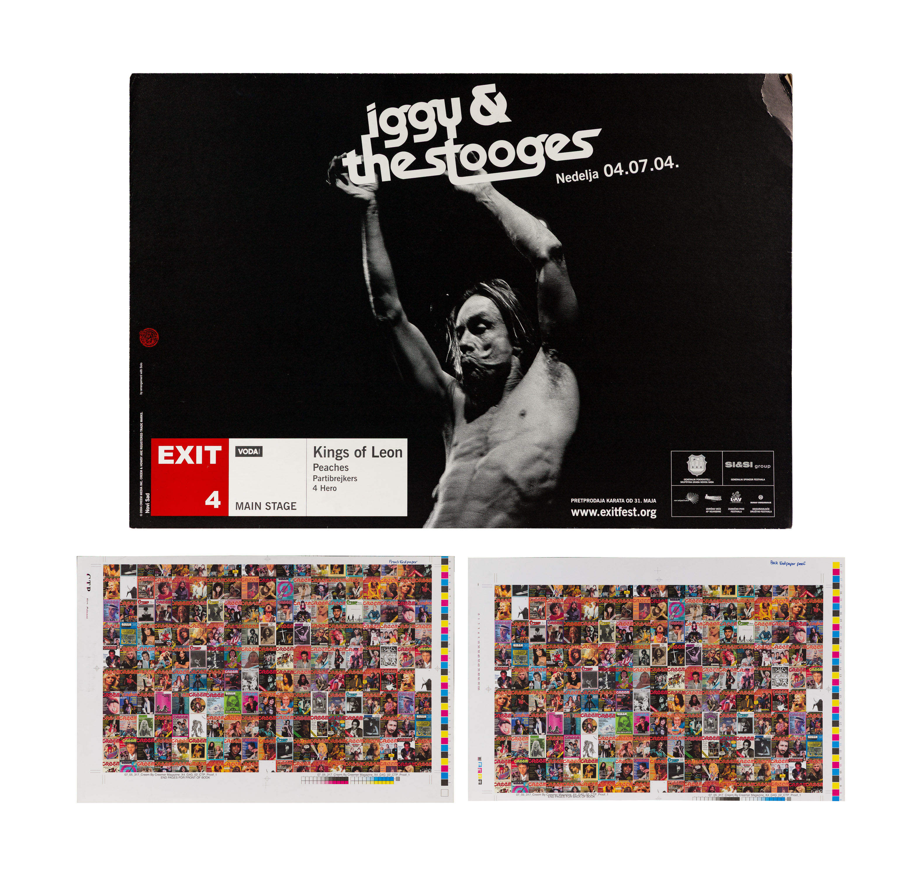 (3) items including (2) end page test printings, front and back, of ‘Creem: America’s Only Rock ‘N’ Roll Magazine’ by Brian J. Bowe and Robert Matheu, NY, 2007 and a 2004 Exit Festival, Novi Sad, Serbia poster featuring Iggy & the Stooges, mounted to board