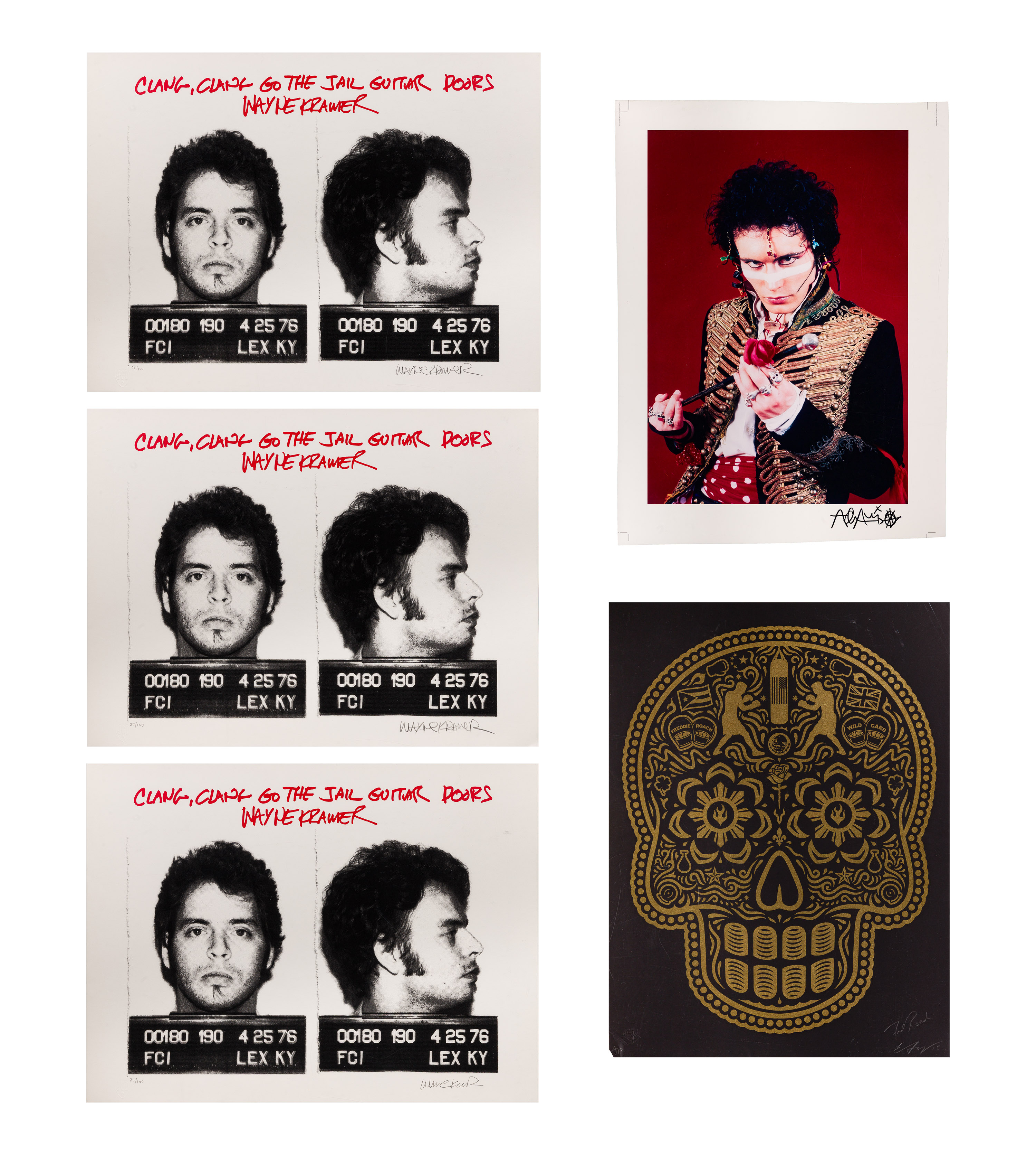 (5) items including a poster-size glossy image of singer Adam Ant, autographed as well as (3) hand-embellished and signed by Wayne Cramer of MC5, mug shot posters #20, 22, 25/100 having a blind stamp JDG and an ‘AP’ edition silkscreen print of a Dia de los Muertos inspired skull signed by artist Ernesto Yerena and boxing trainer Freddie Roach having a rose blind stamp