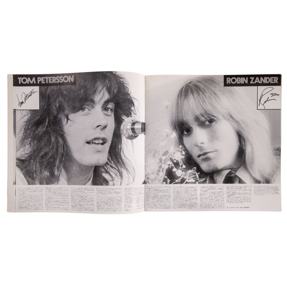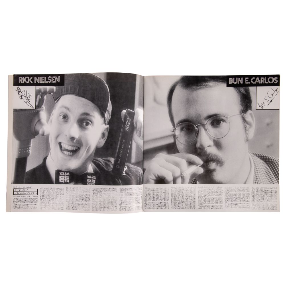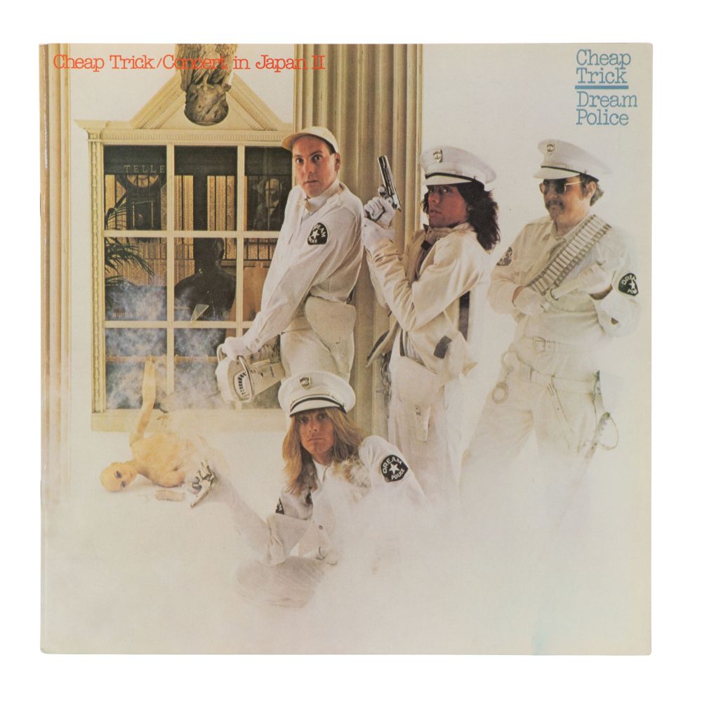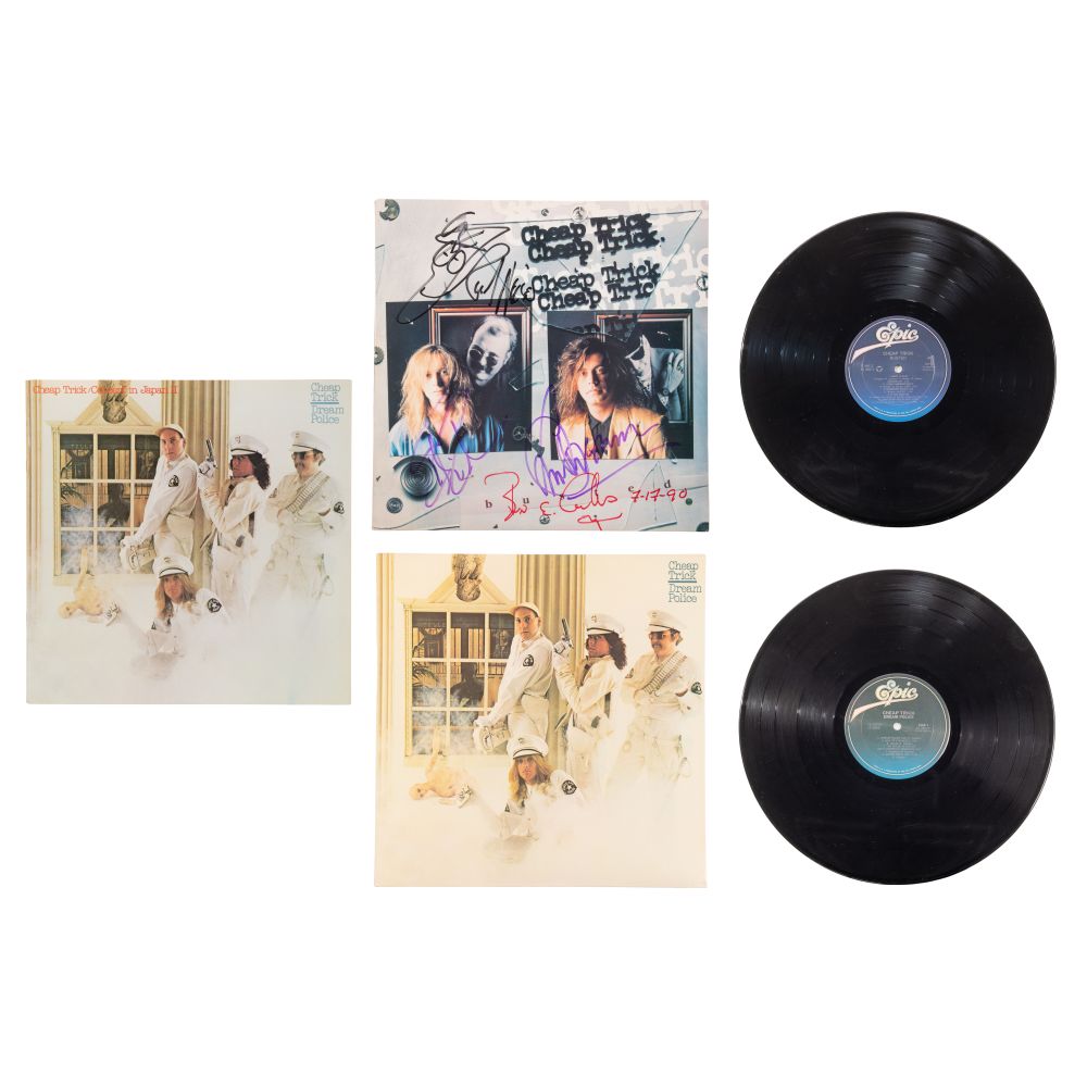 (3) items including a 1990 ‘Busted’ Epic #46013, having members’ signatures to front cover, a 1979 ‘Cheap Trick in Japan’ tour book / concert program (Japanese text) and a 1979 promotional copy of ‘Dream Police’ Epic #35773, records stored in plain sleeves out of original sleeves and covers