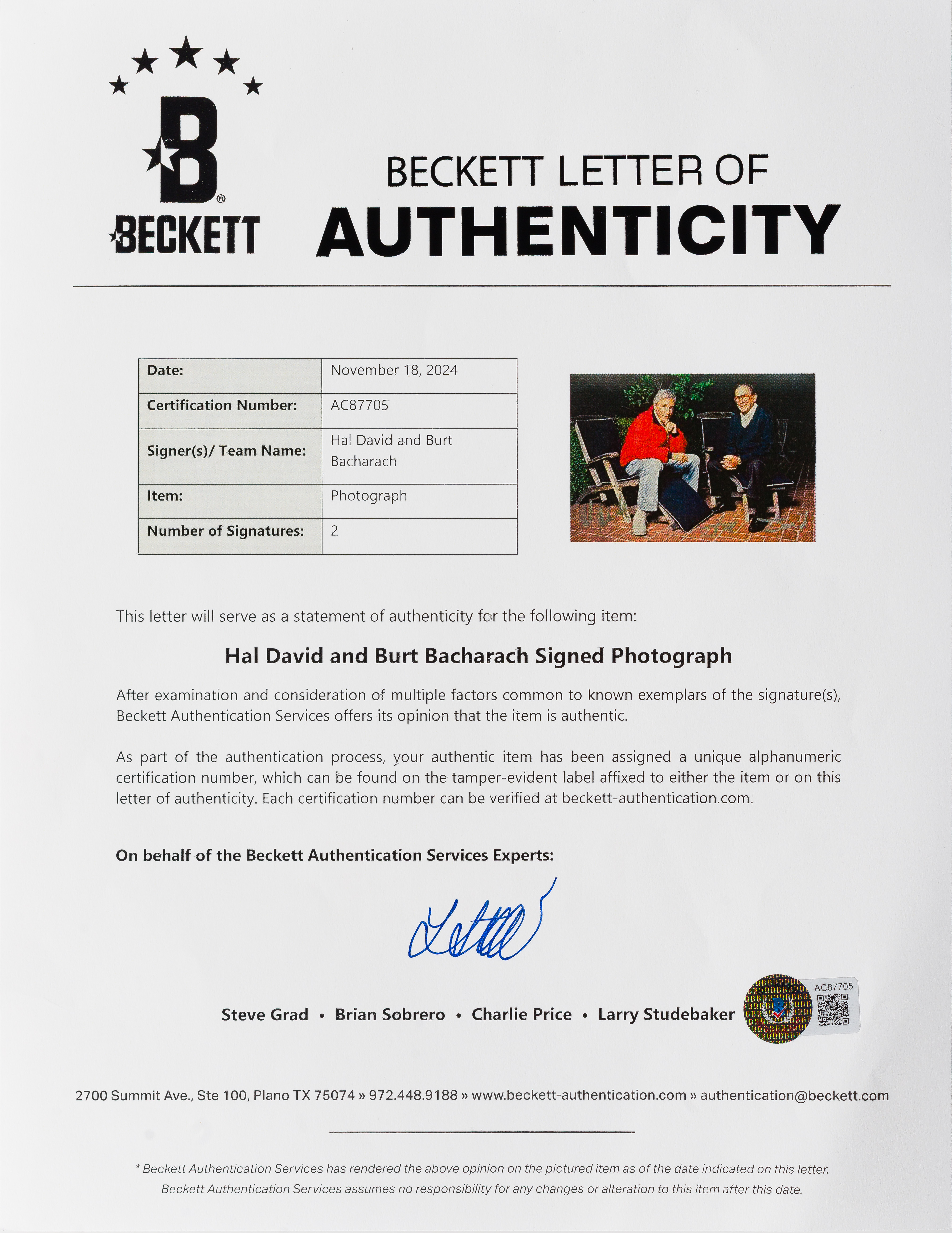 (9) items including an autographed photograph of Burt Bacharach and Hal David having COA #AC87705 and hologram from Beckett as well as (8) black and white / color photographs of Frank Sinatra, four also having Dean Martin and Sammy Davis Jr., seven having photographer blind stamp