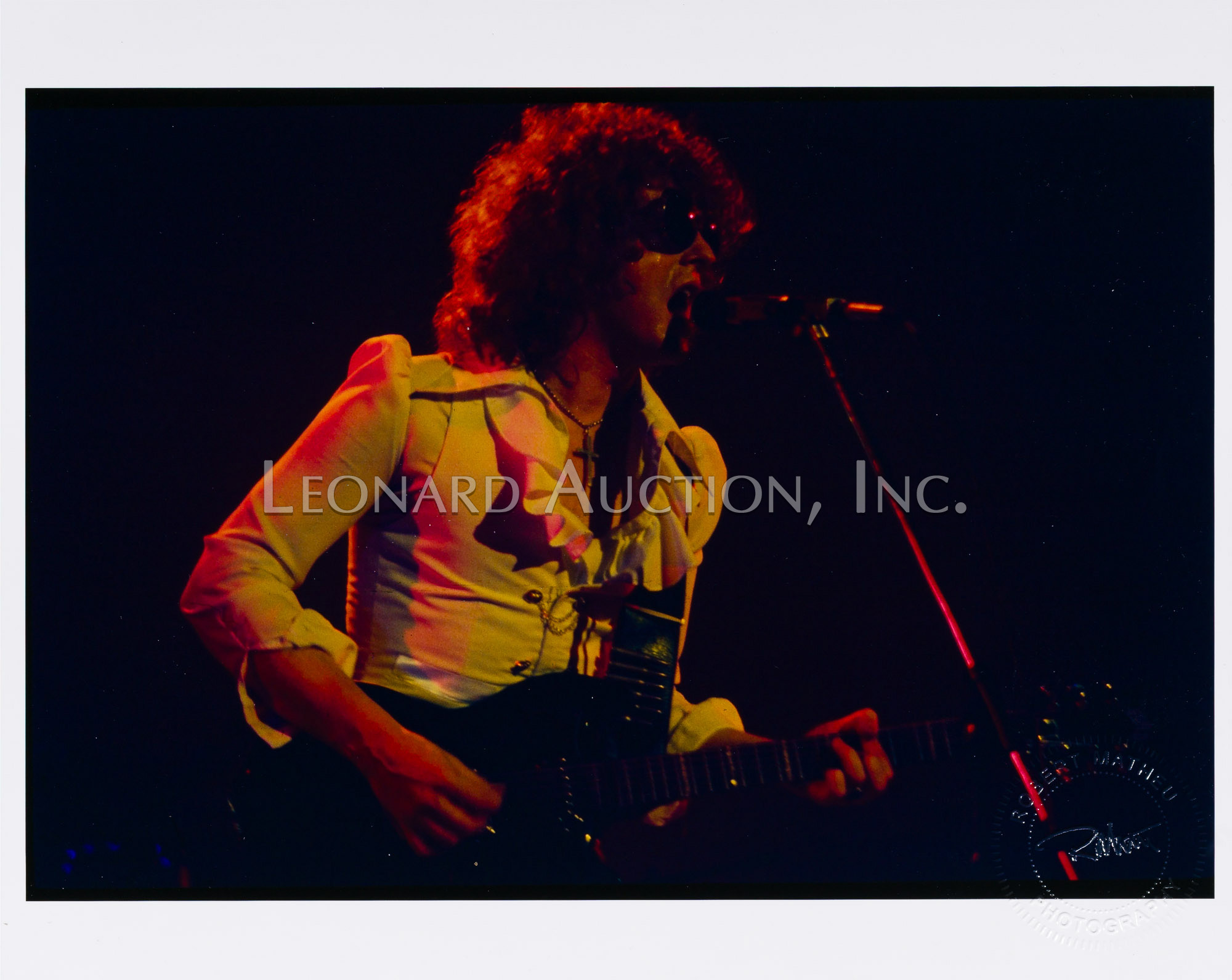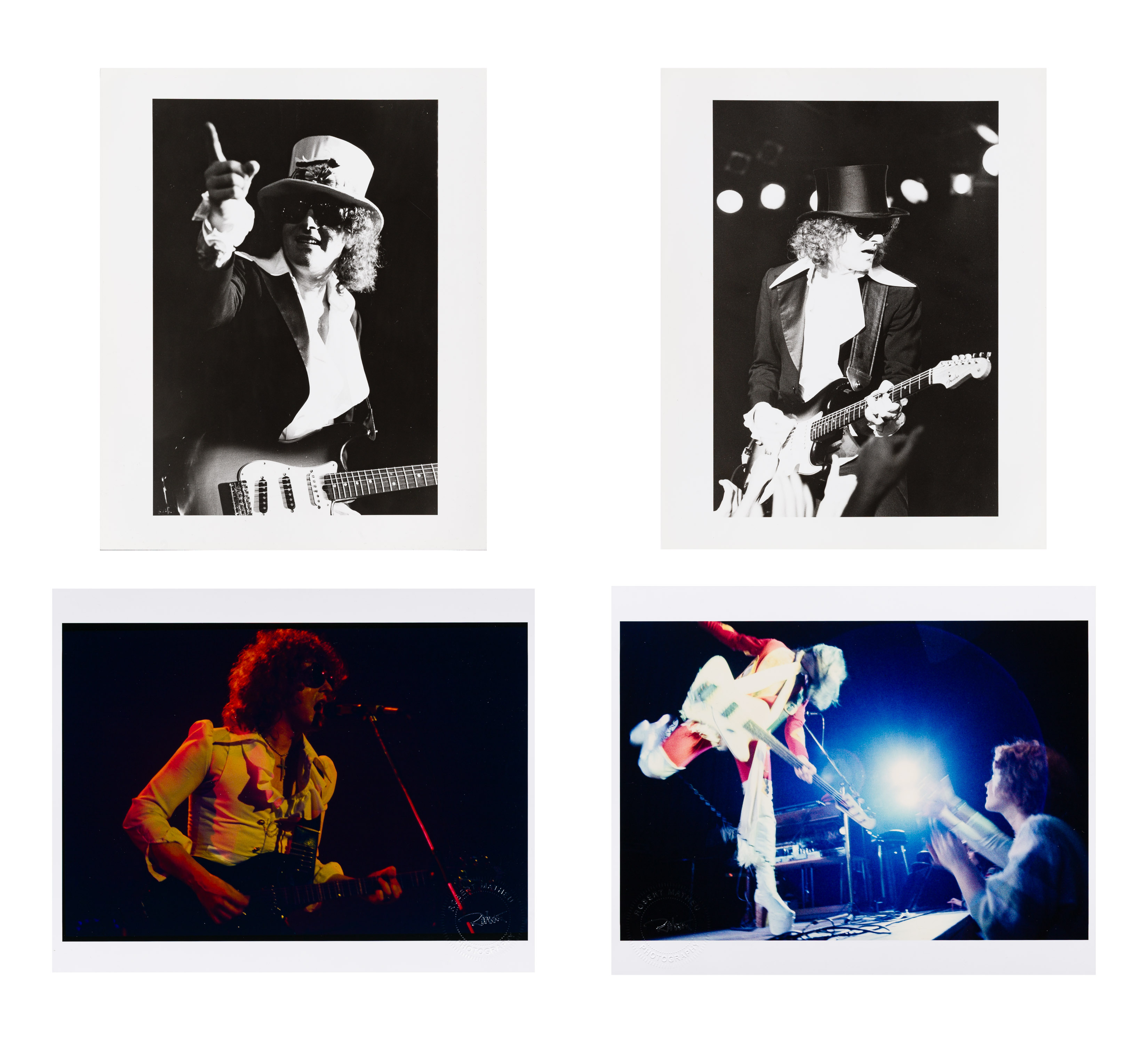 (4) black and white / color images including (3) of Ian Hunter performing having photographer blind stamp and annotations verso and (1) Mott the Hoople performing having photographer blind stamp