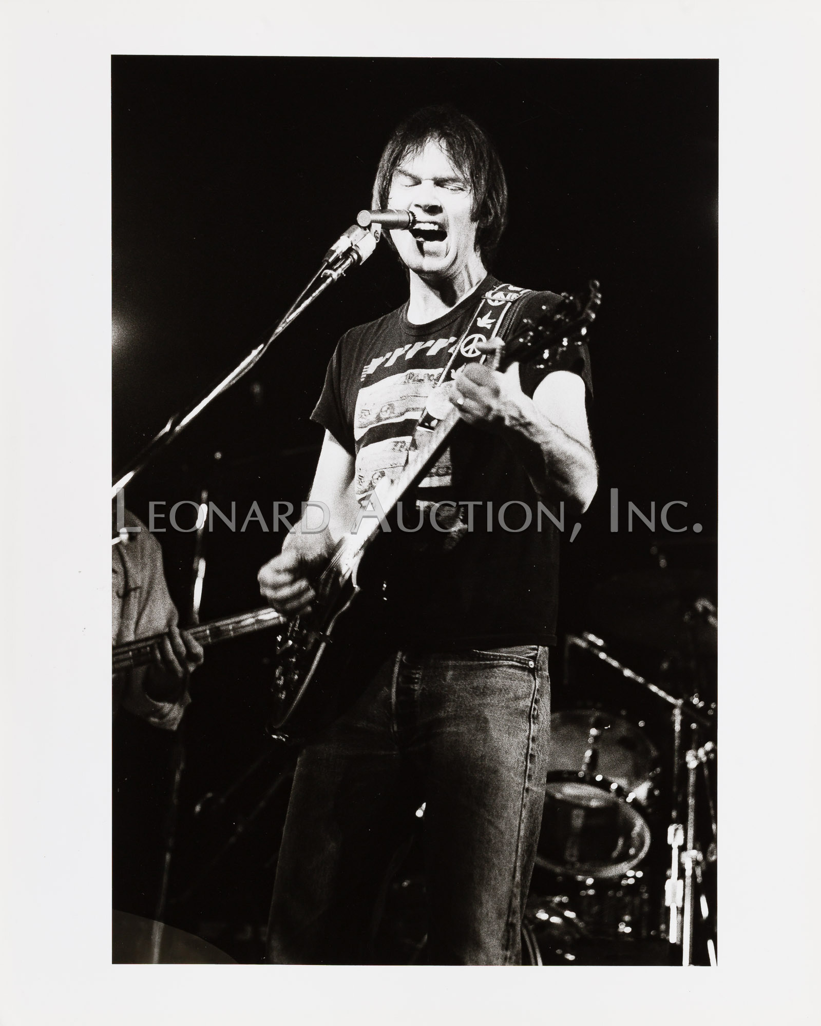 (7) black and white / color photographs of Neil Young performing, three having photographer blind stamp, four having annotations