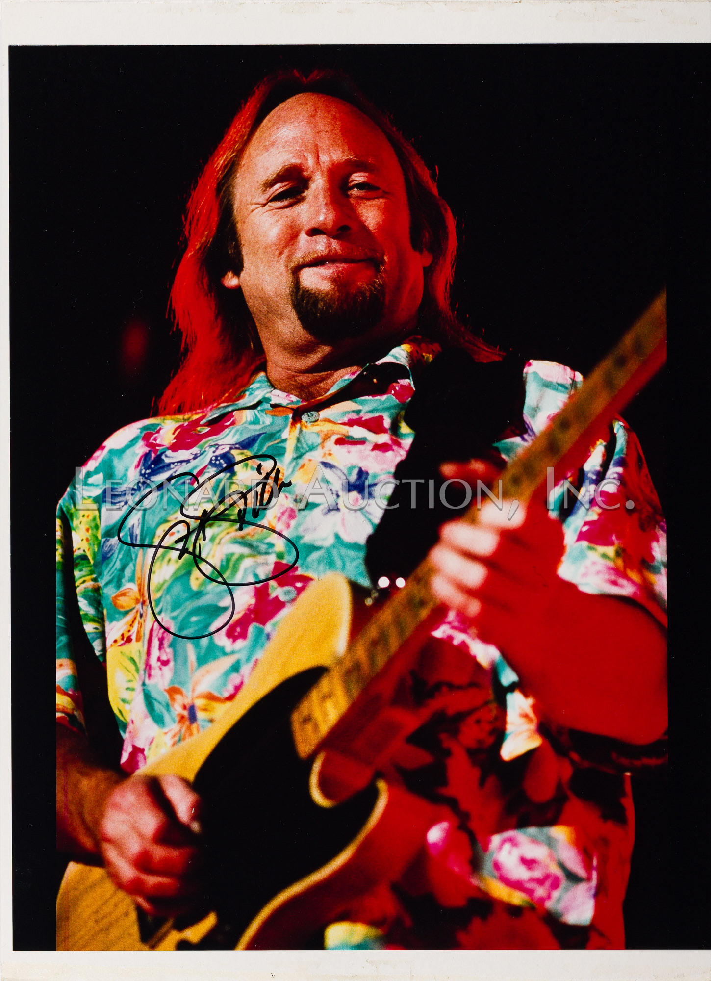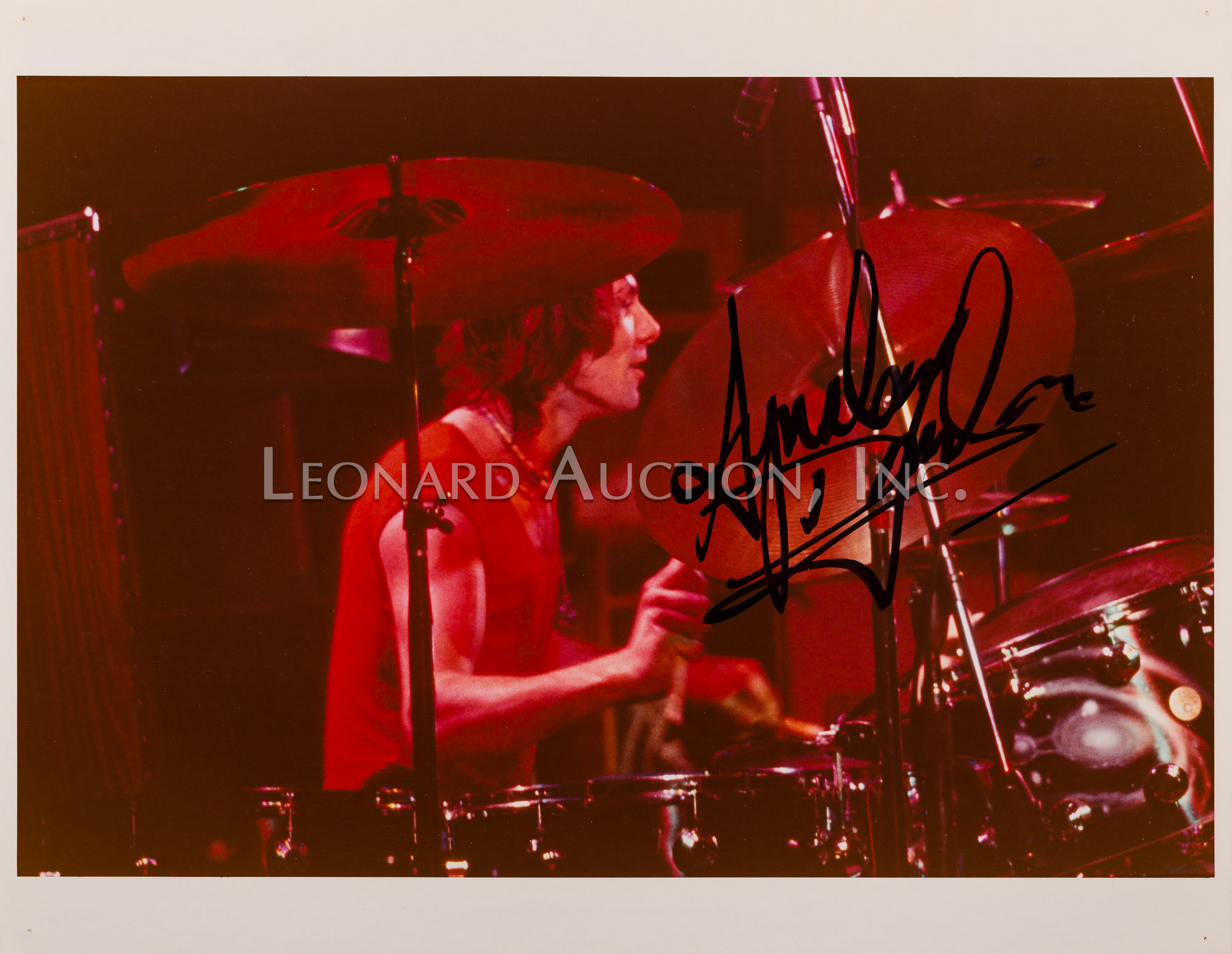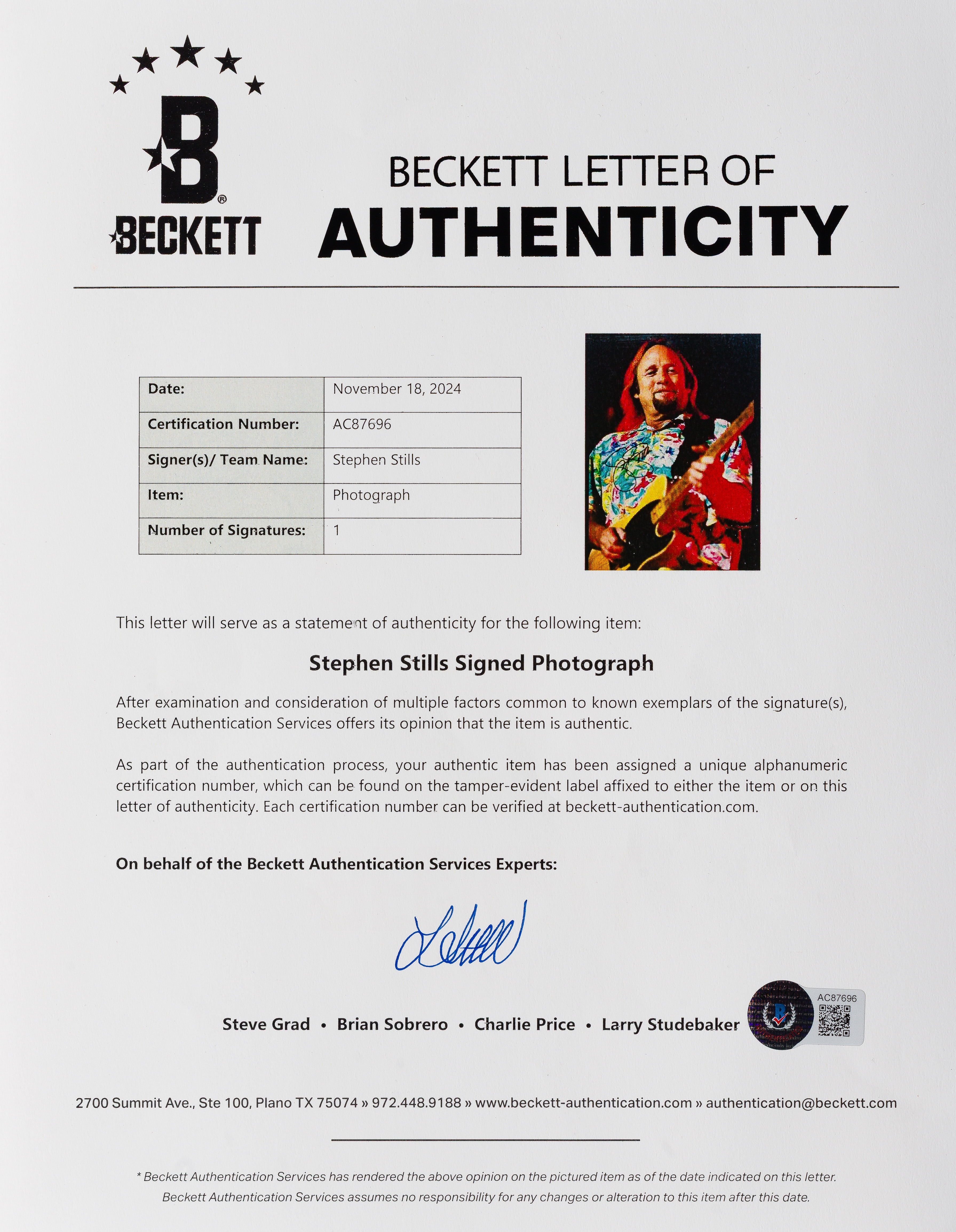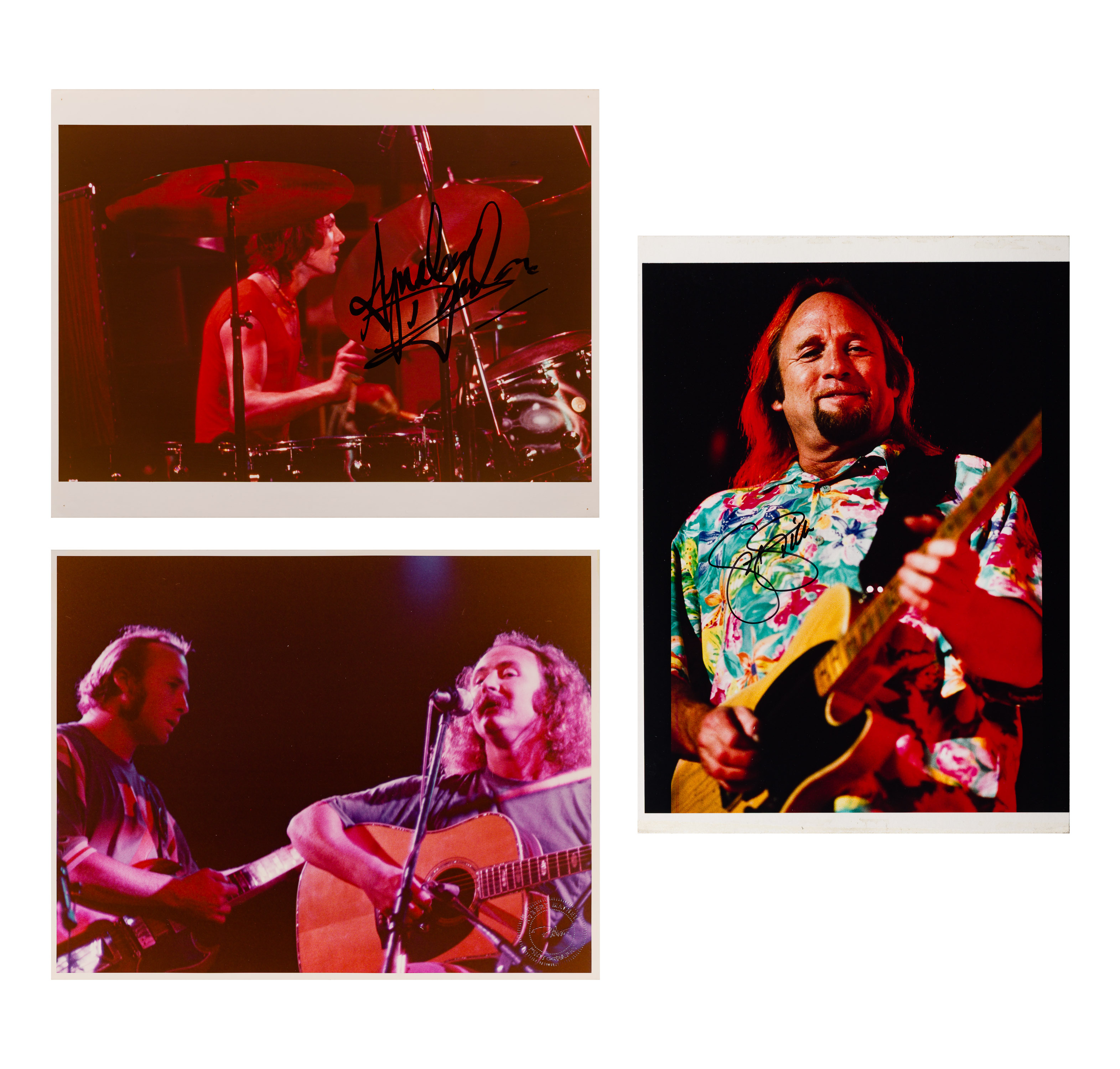 (3) total items including an autographed image of Stephen Stills and an image of Stephen Stills and David Crosby performing, having photographer blind stamp; together with an Aynsley Dunbar autographed image, unmarked