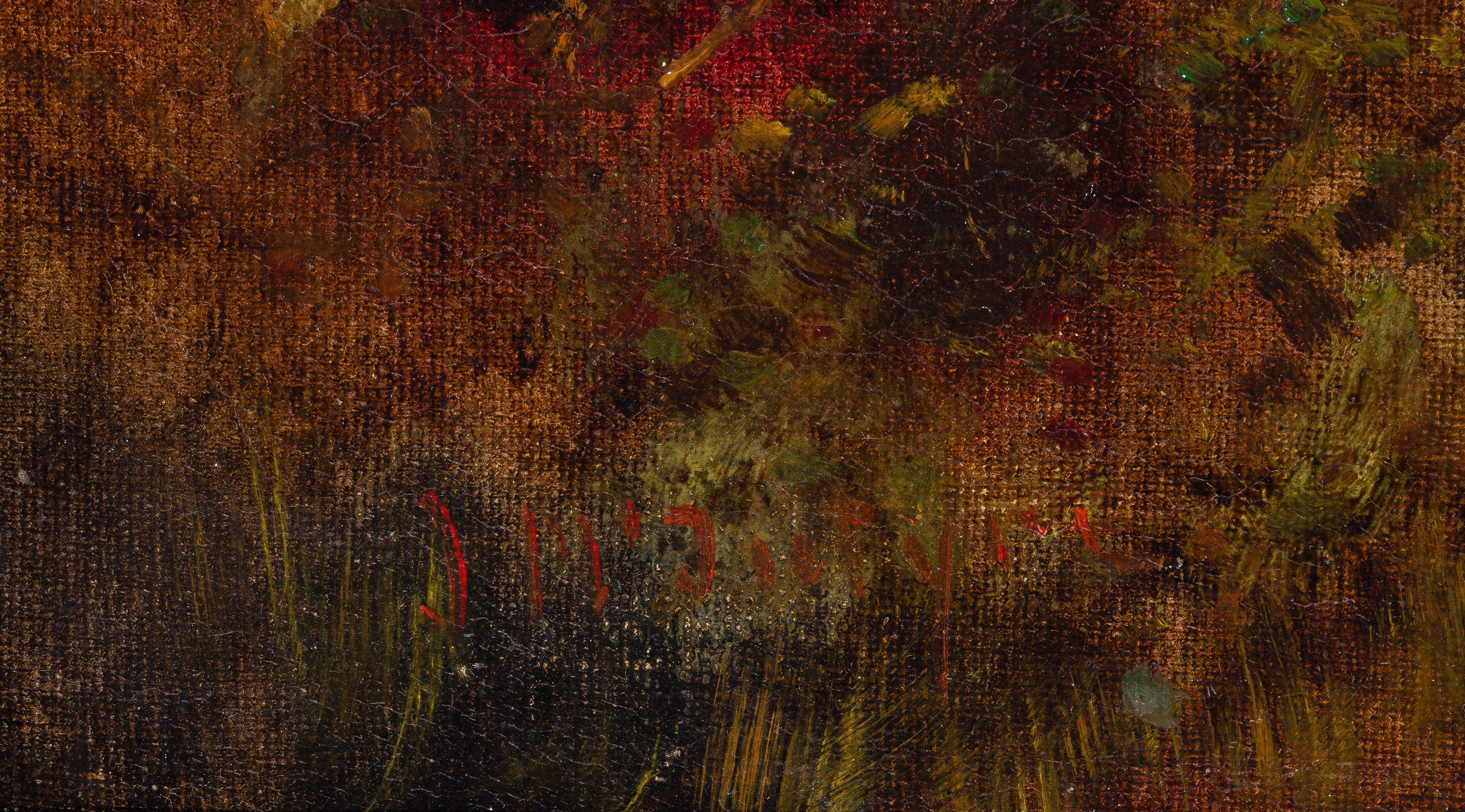 Condition: craquelure overall, slack canvas, puncture at stretcher mark lower right edge patched verso, frame having moderate wear and a loss to lower edge