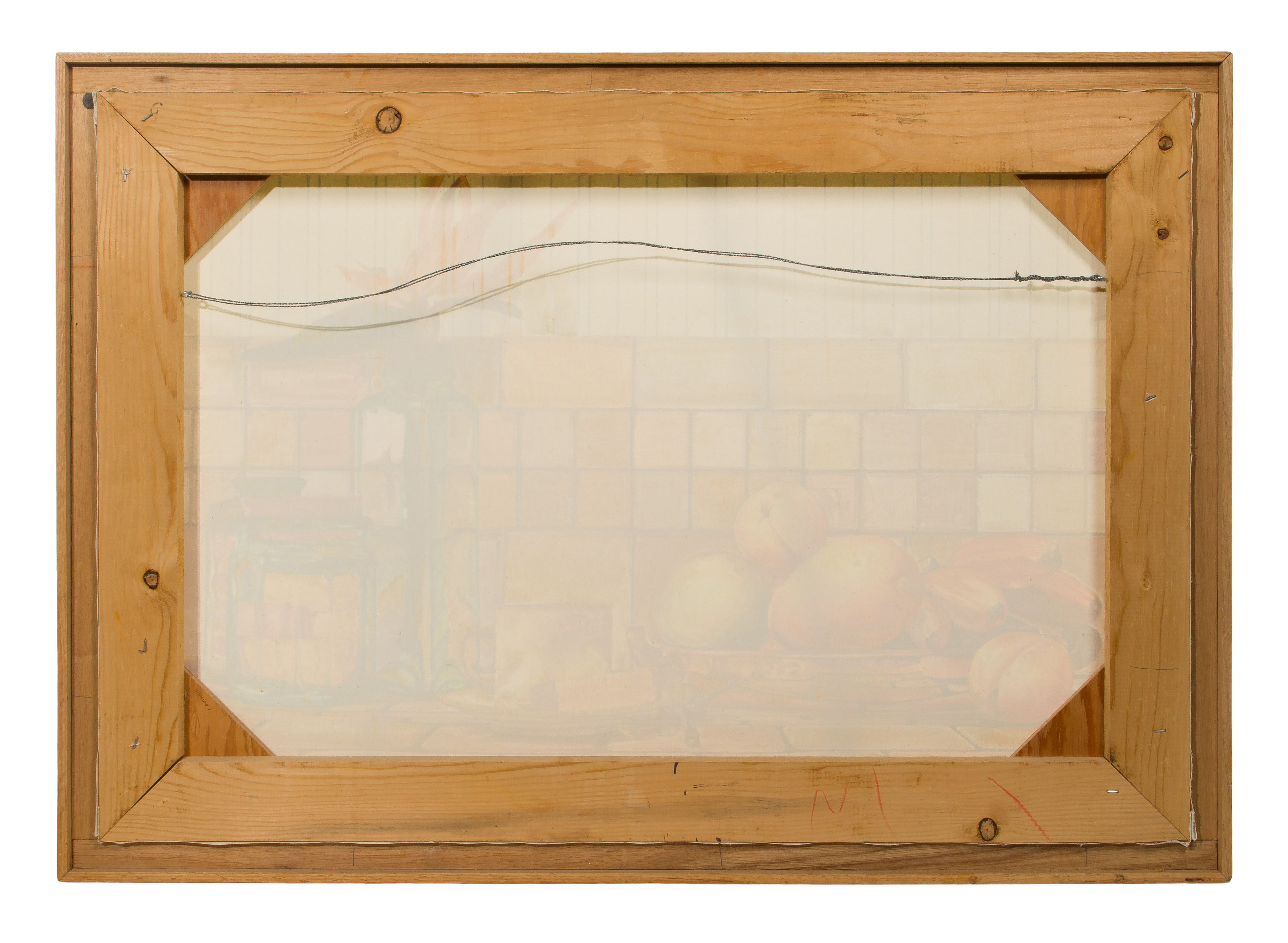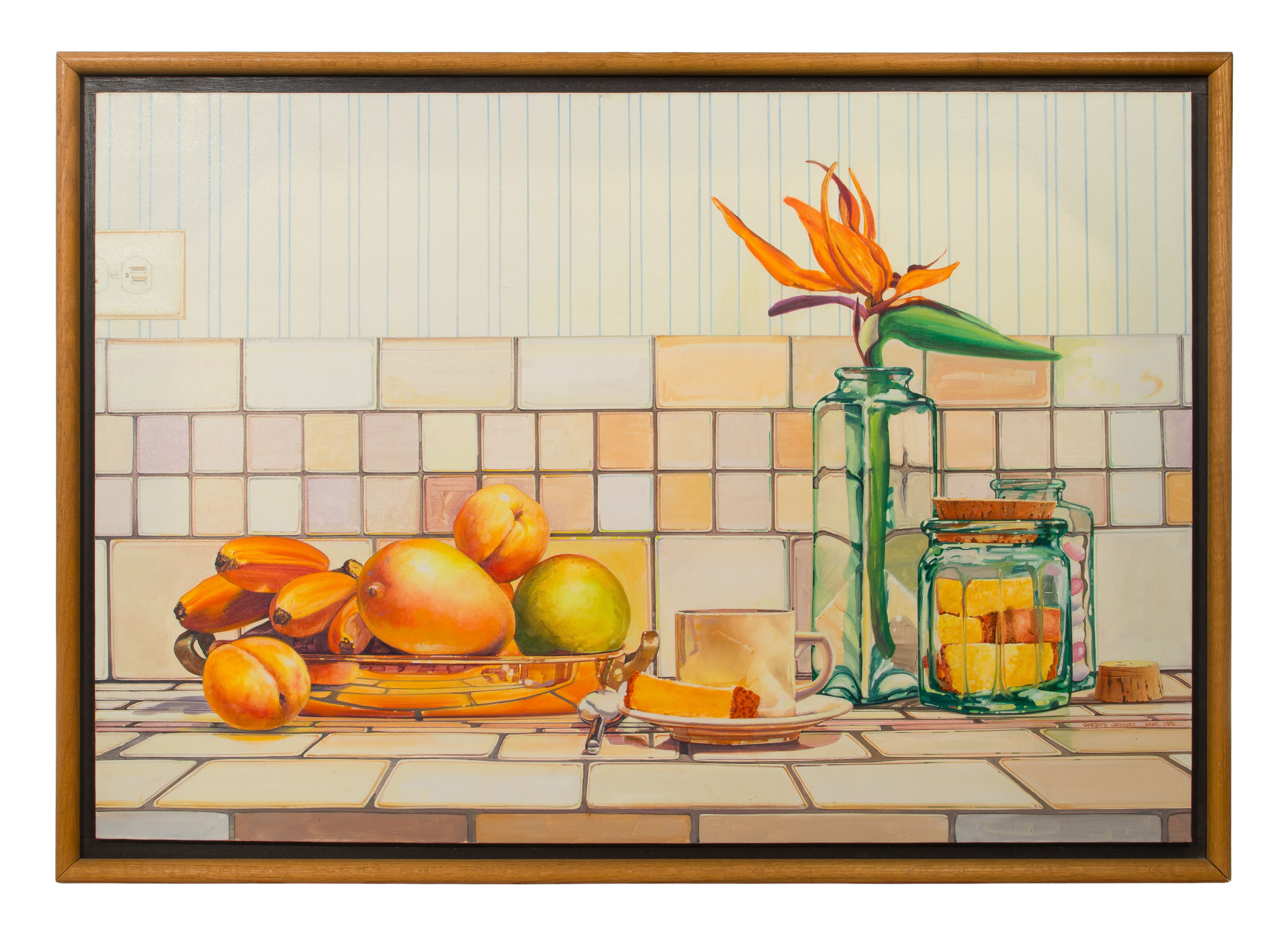 1991, signed lower right, depicting a still life, float mounted in a wood frame