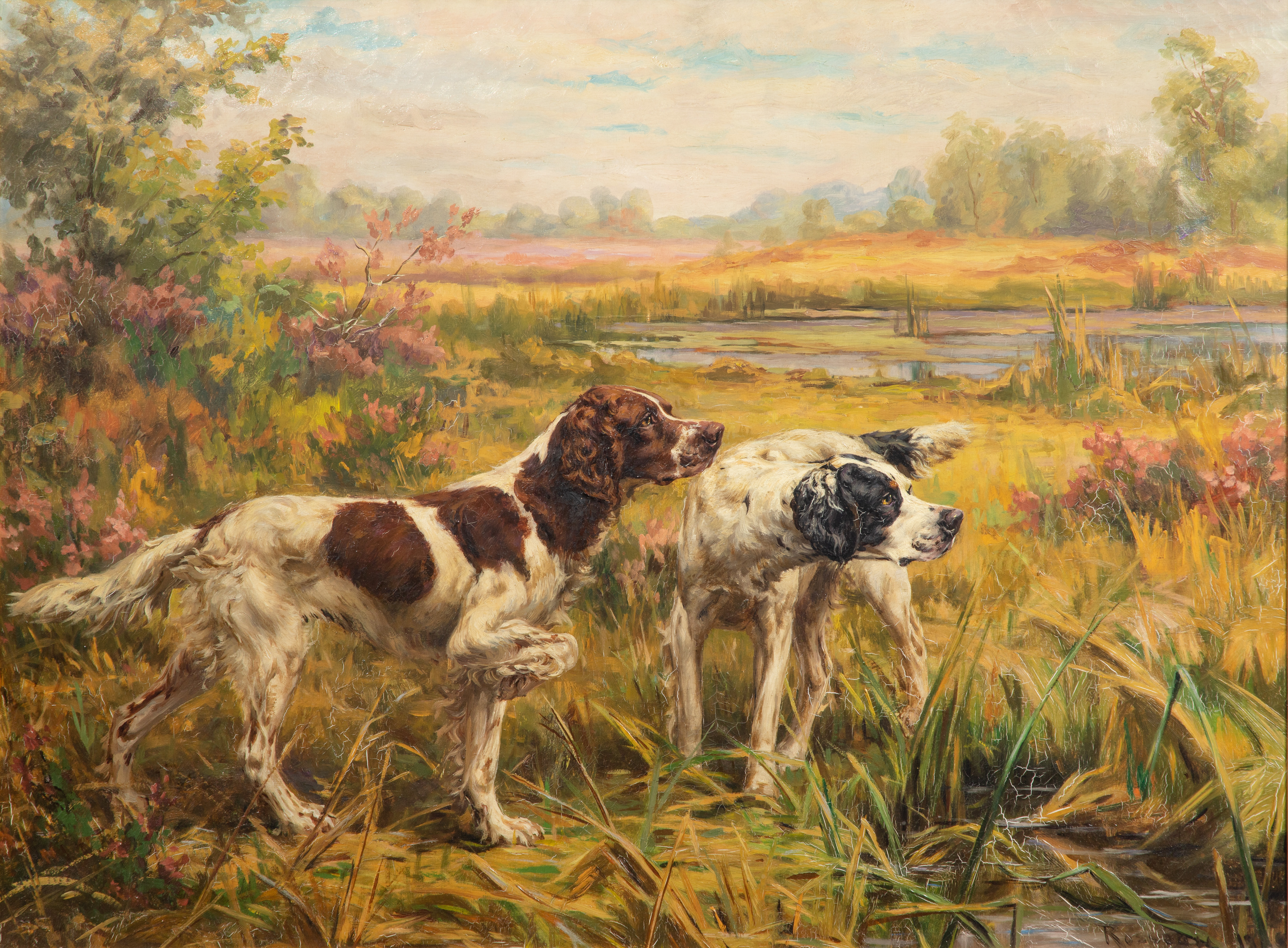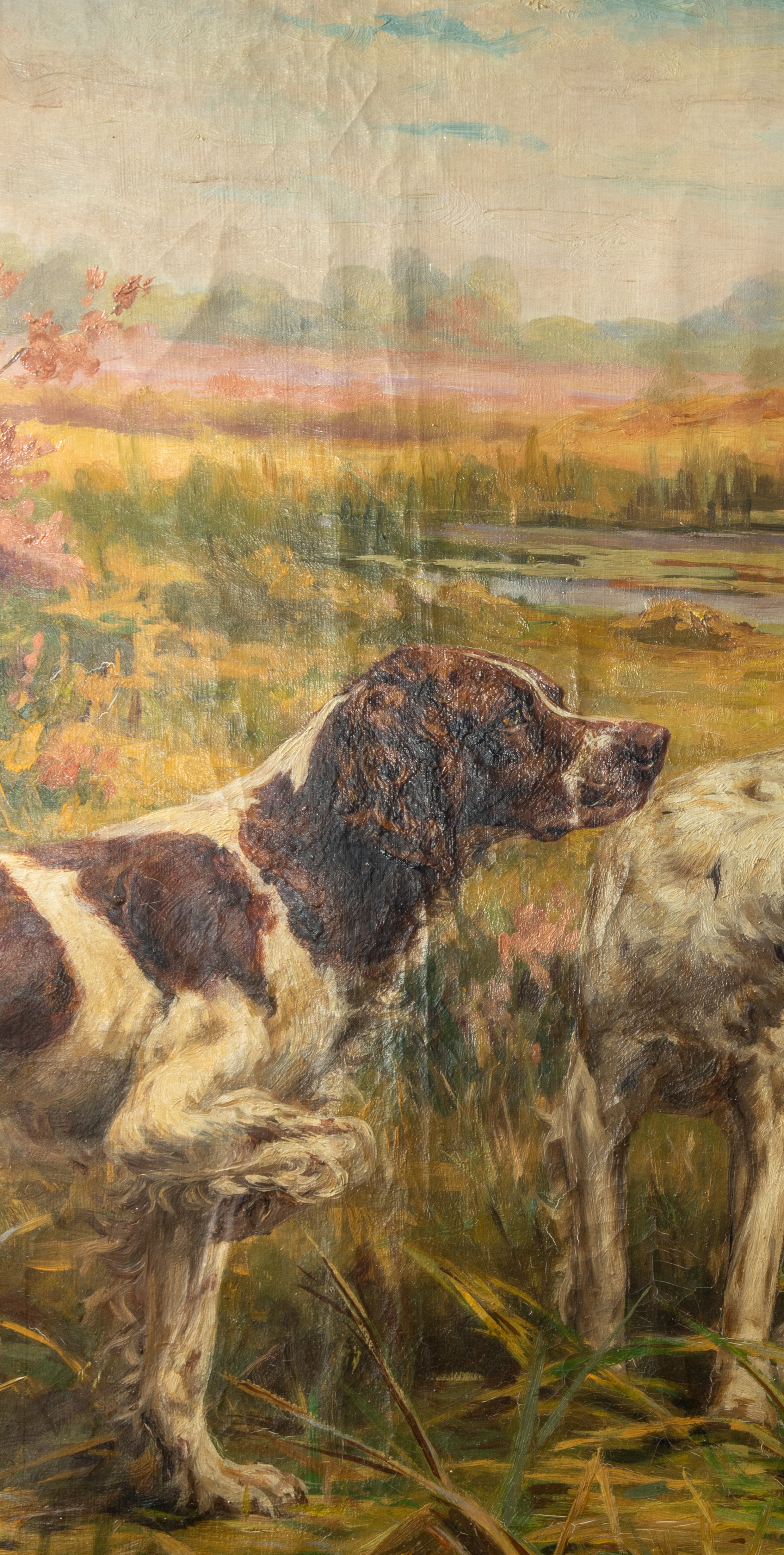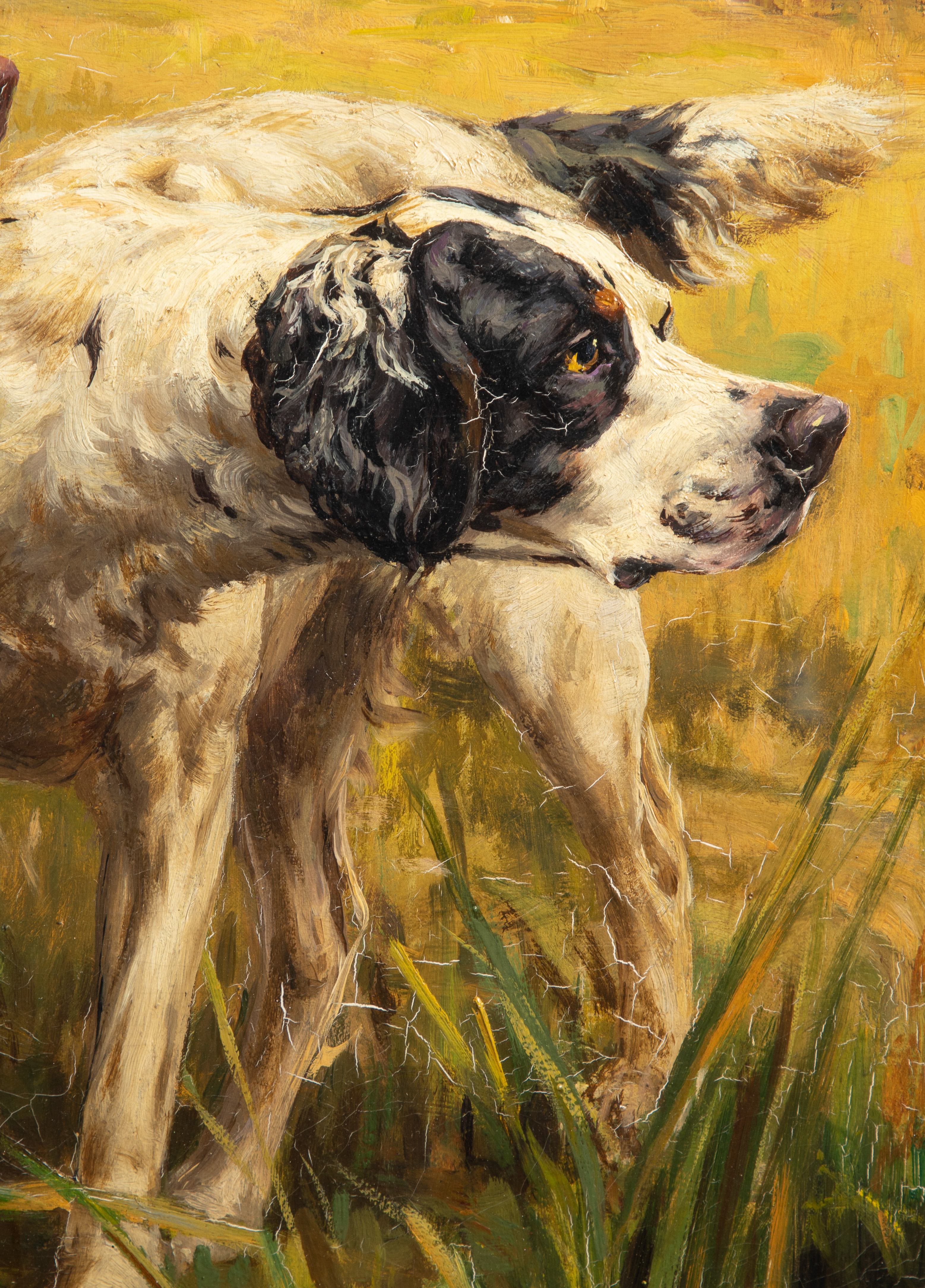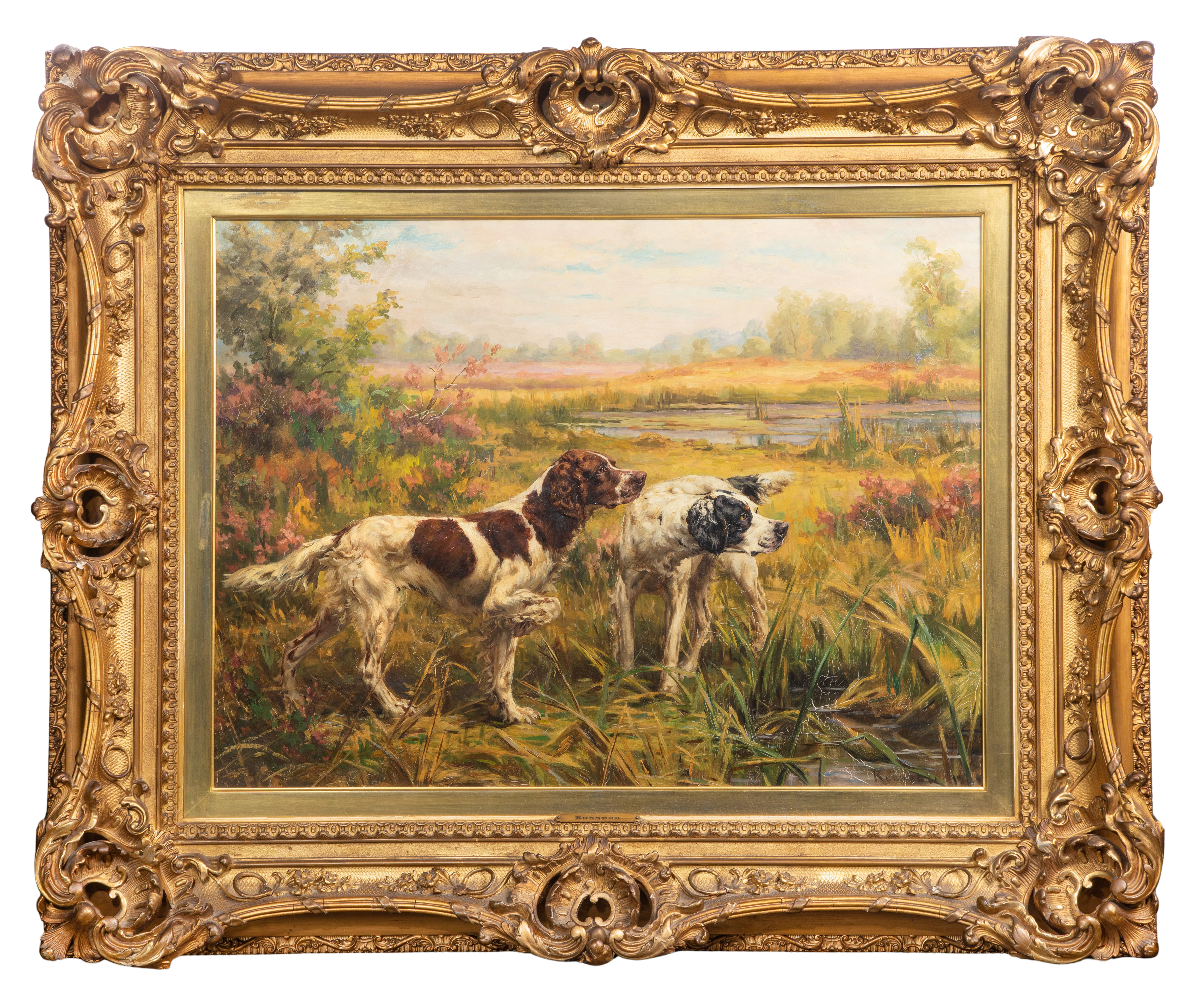 1906, signed lower right, depicting two hunting dogs in a field, under glass in a gilt gesso on wood frame