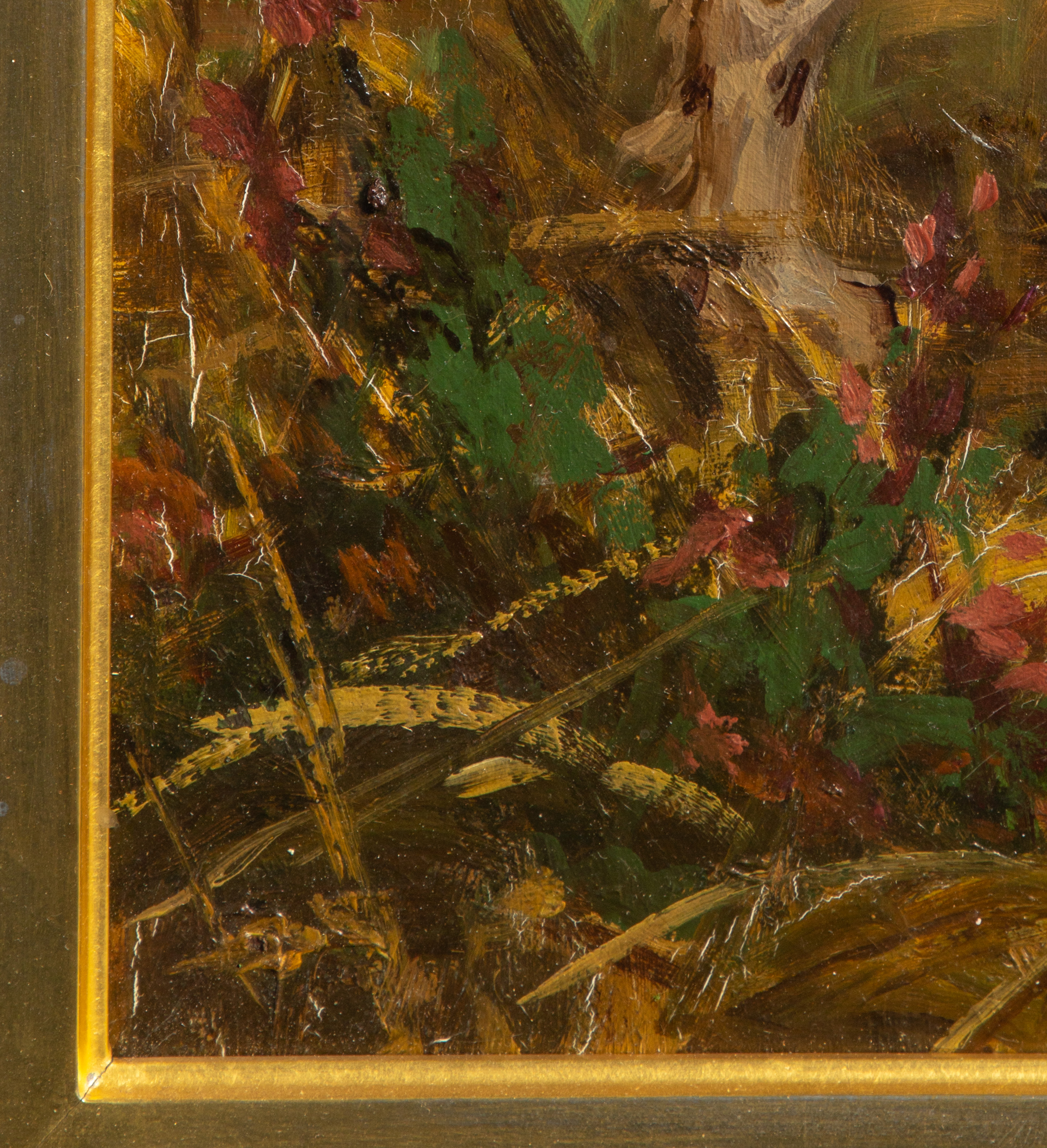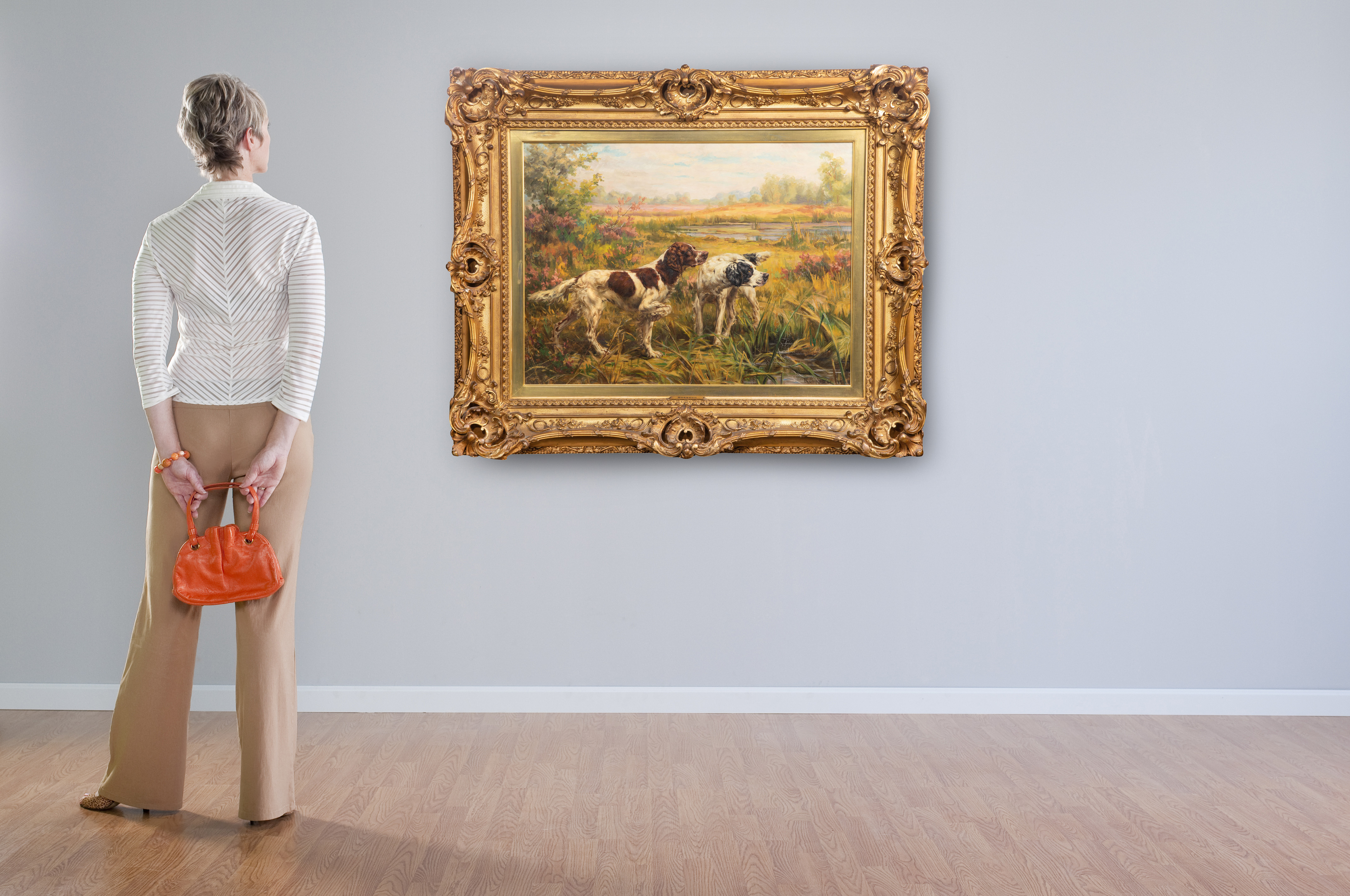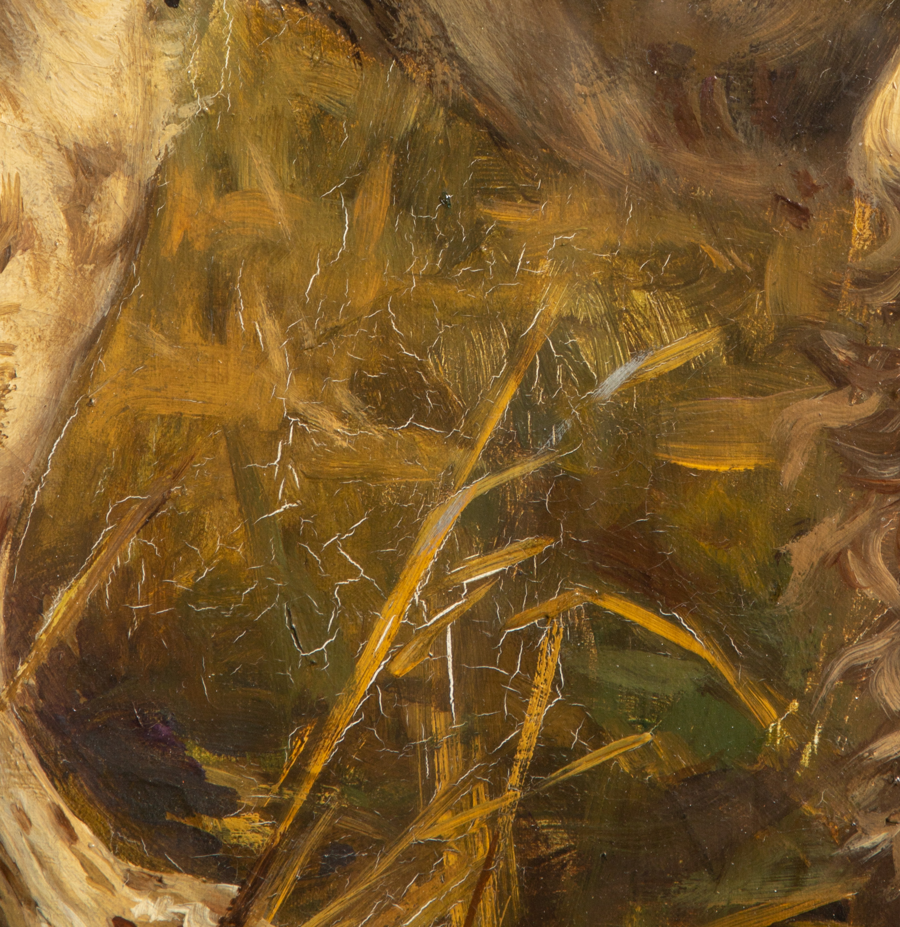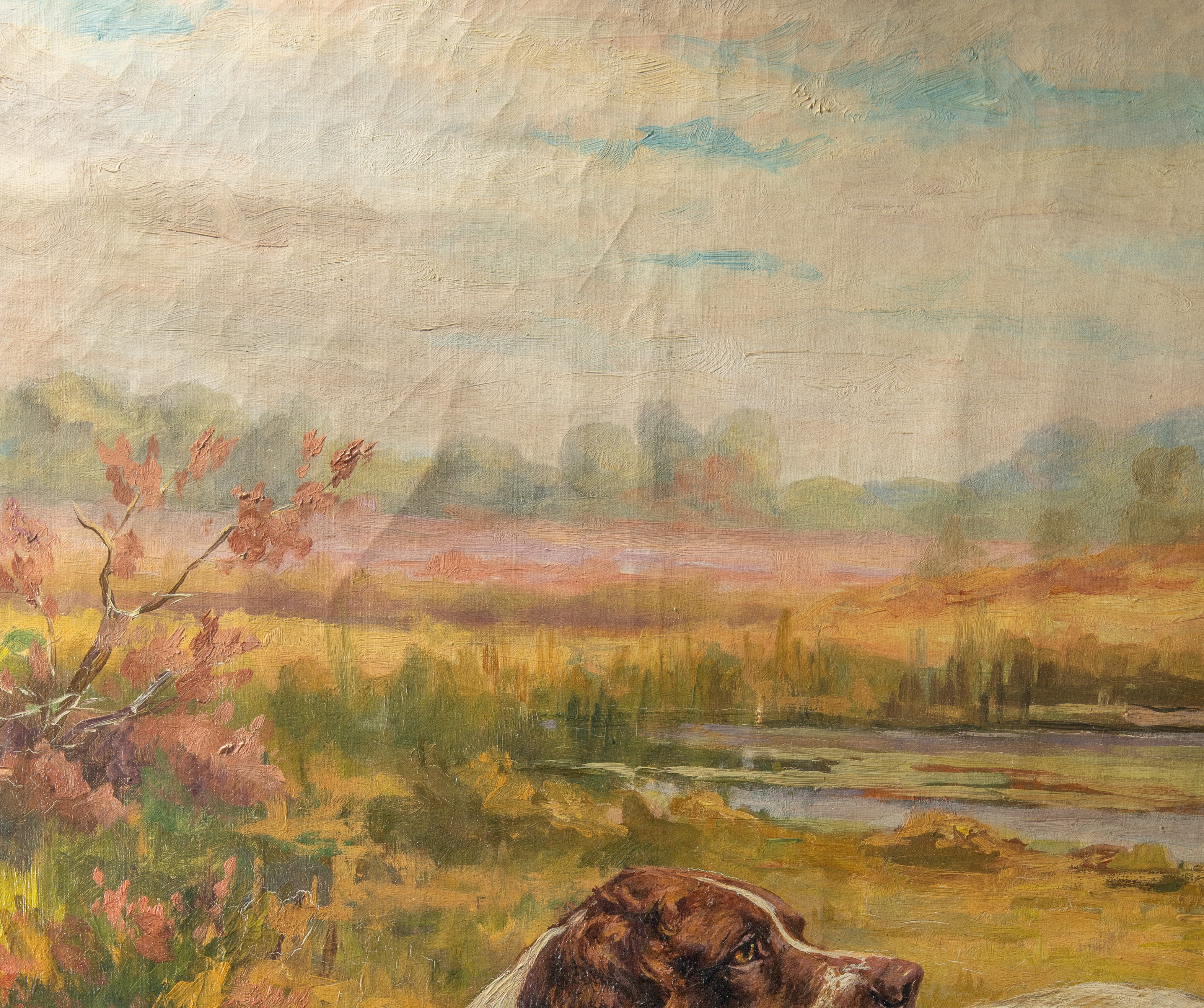 1906, signed lower right, depicting two hunting dogs in a field, under glass in a gilt gesso on wood frame