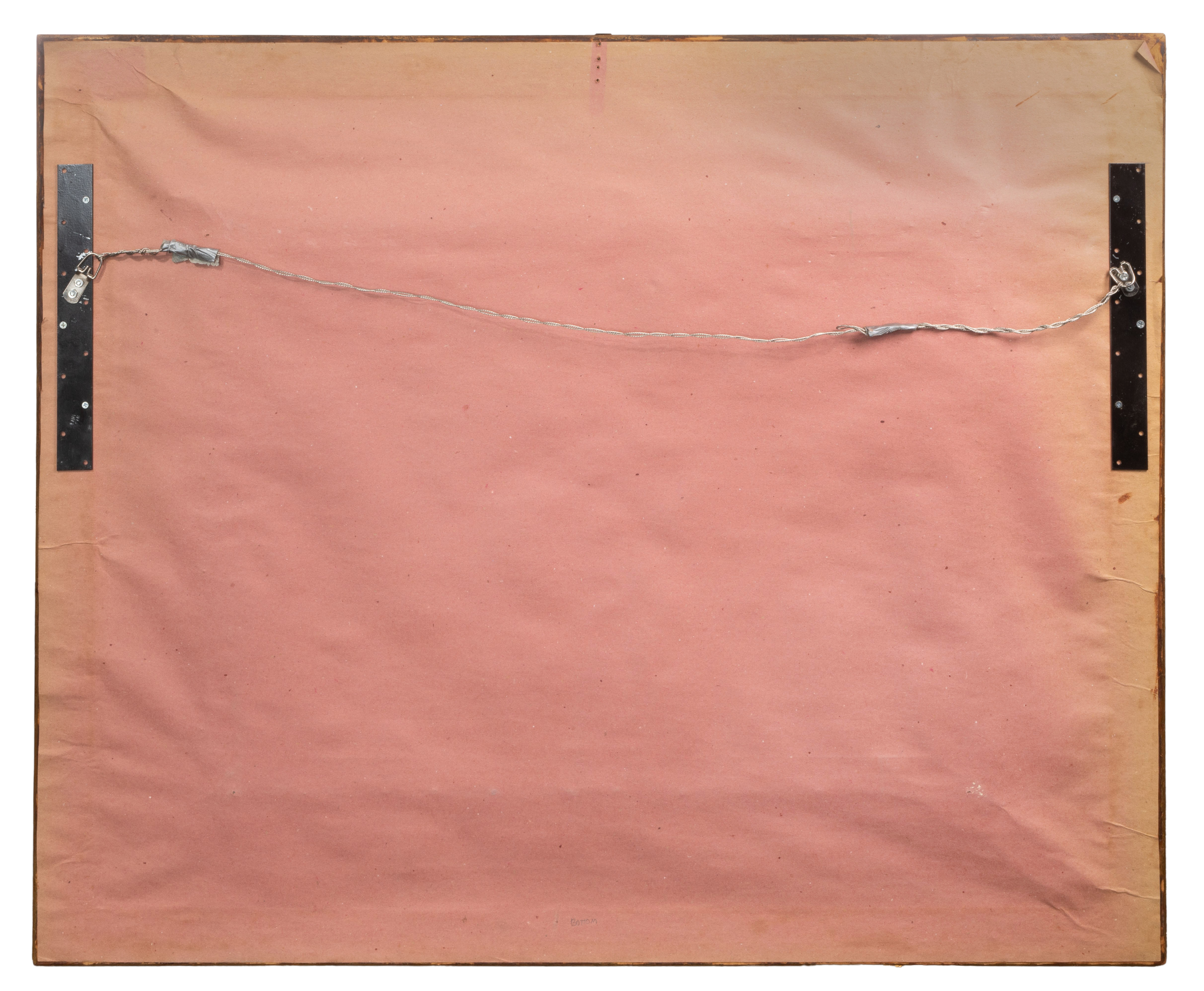 Condition: craquelure, alligatoring, stretcher lines though center, frame missing gesso on upper left corner, cracks and chips