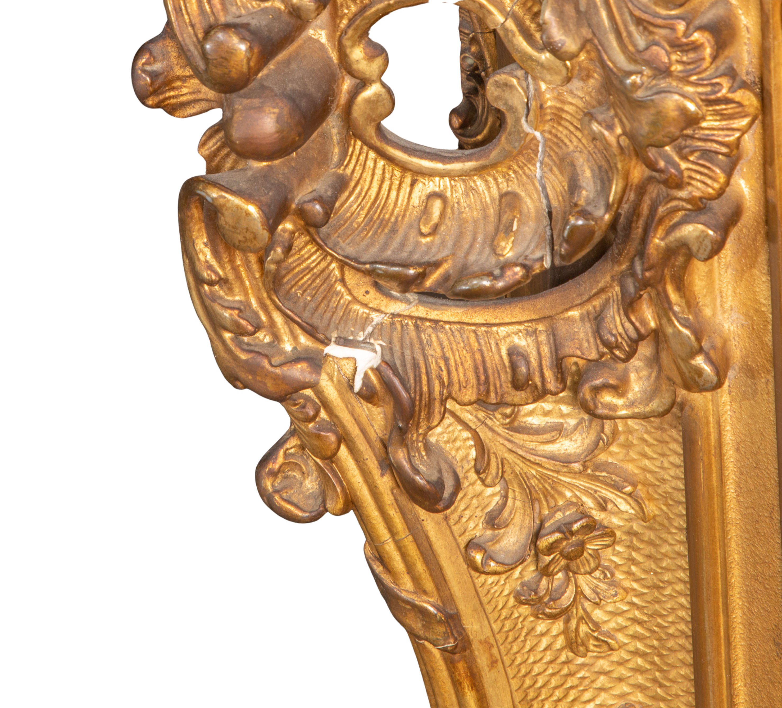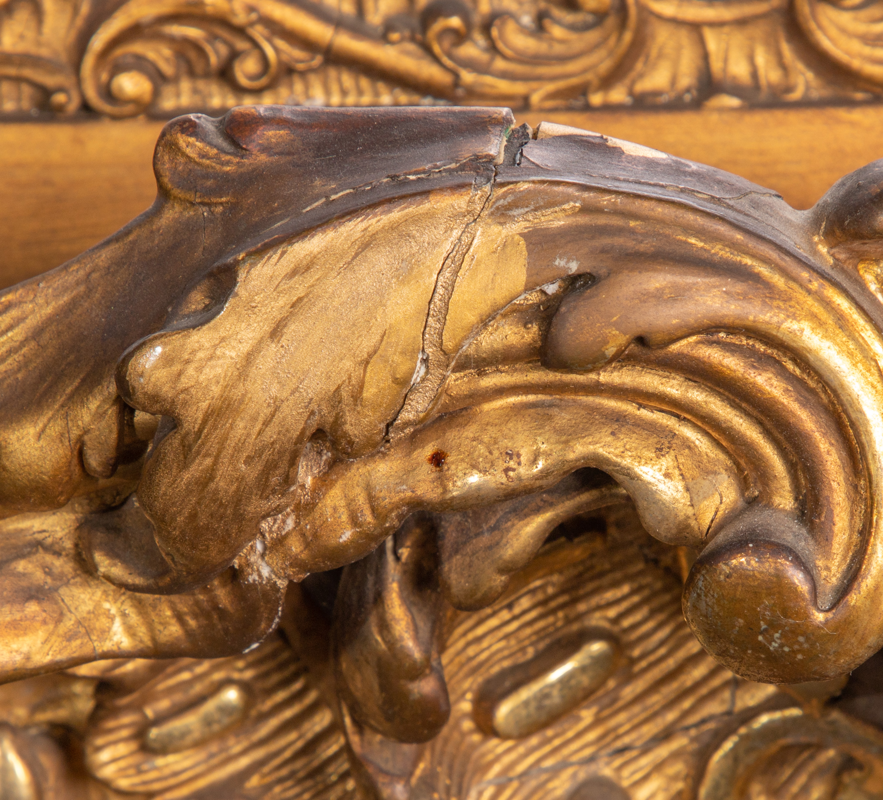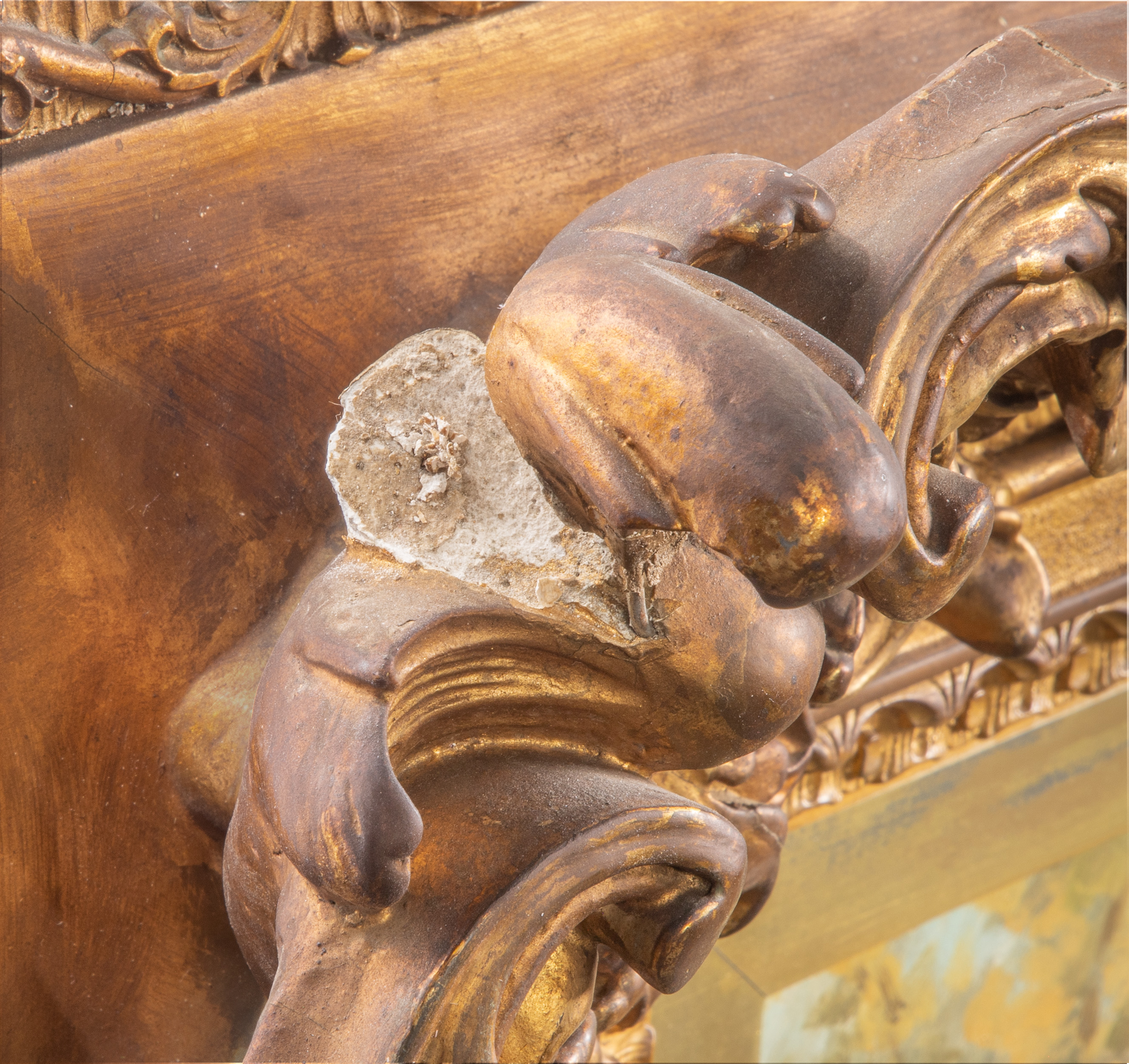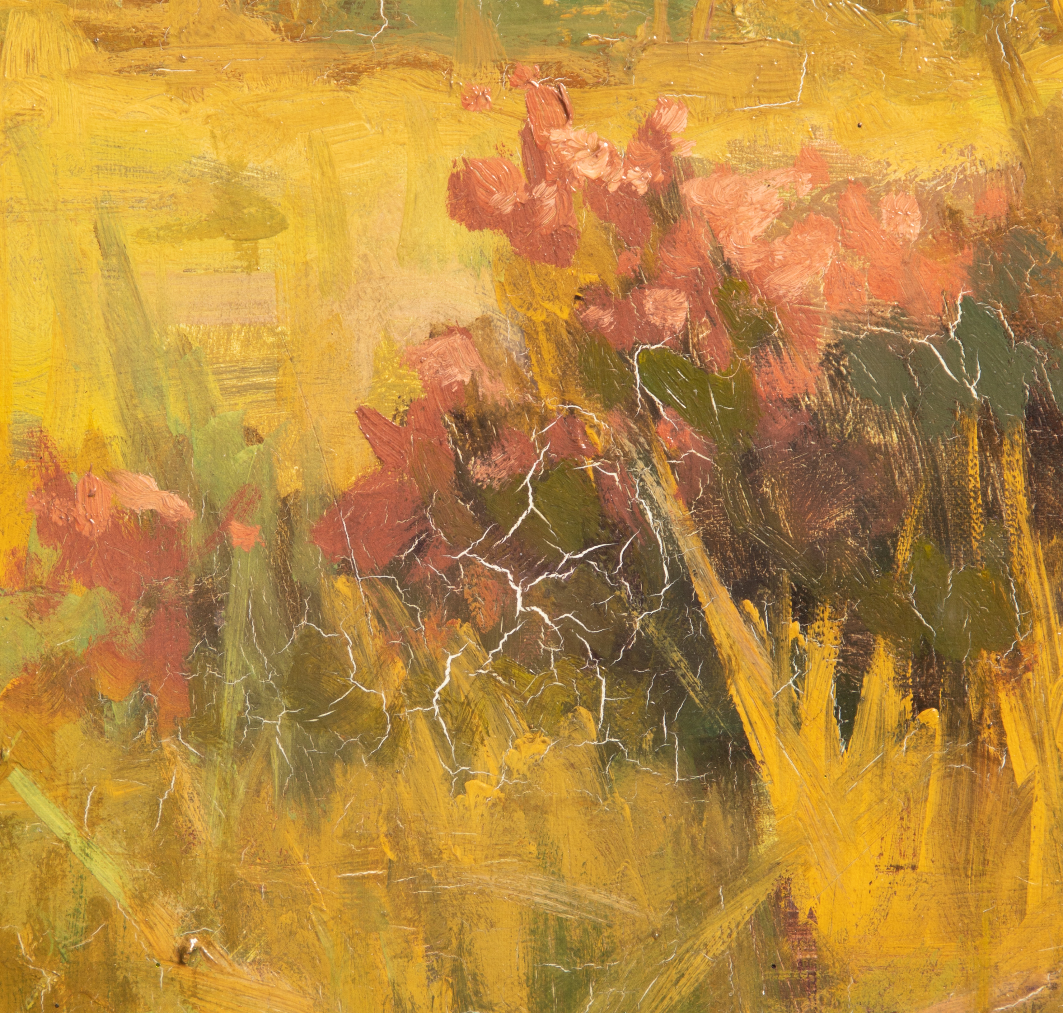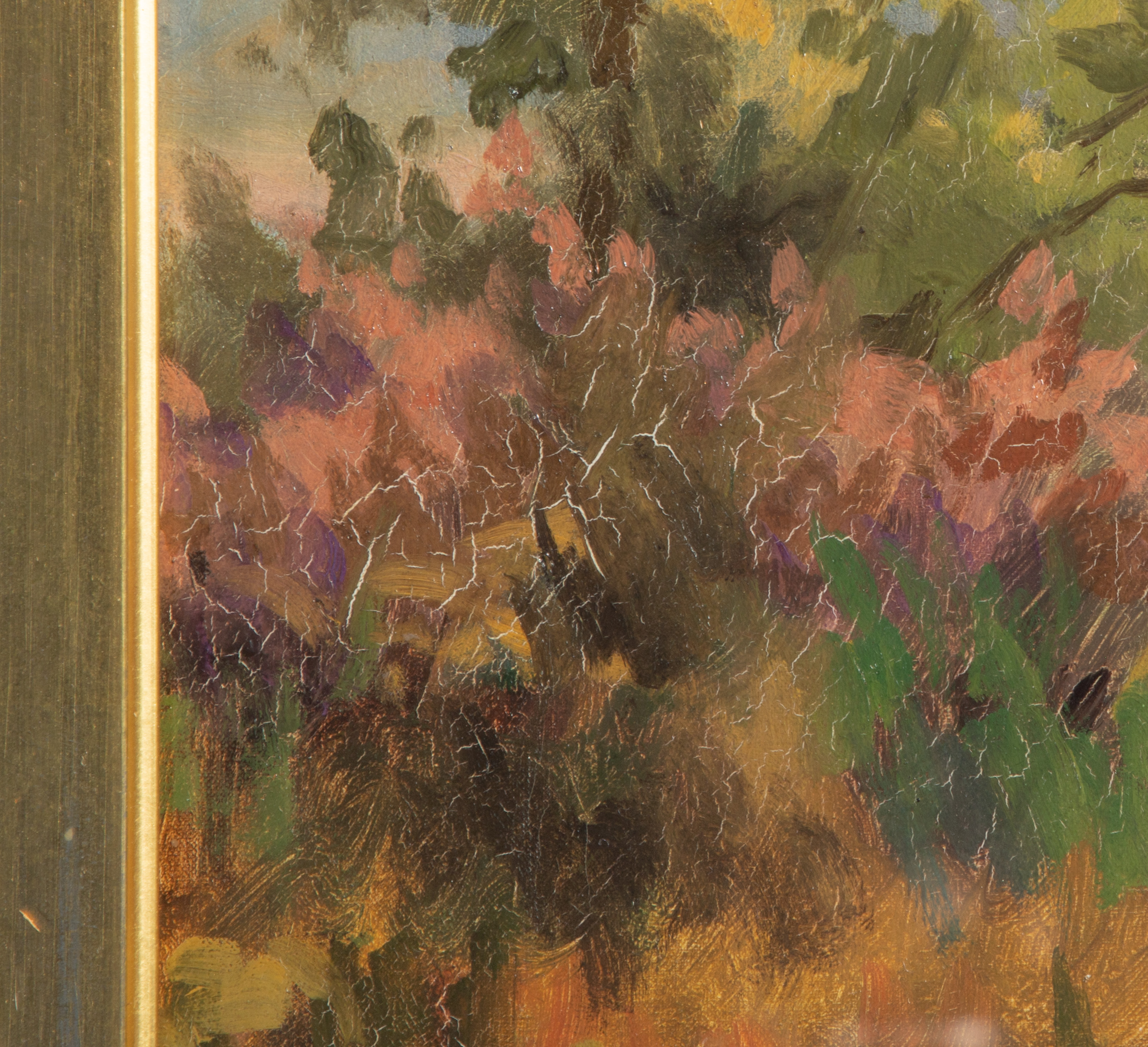 craquelure, alligatoring, stretcher lines though center, frame missing gesso on upper left corner, cracks and chips