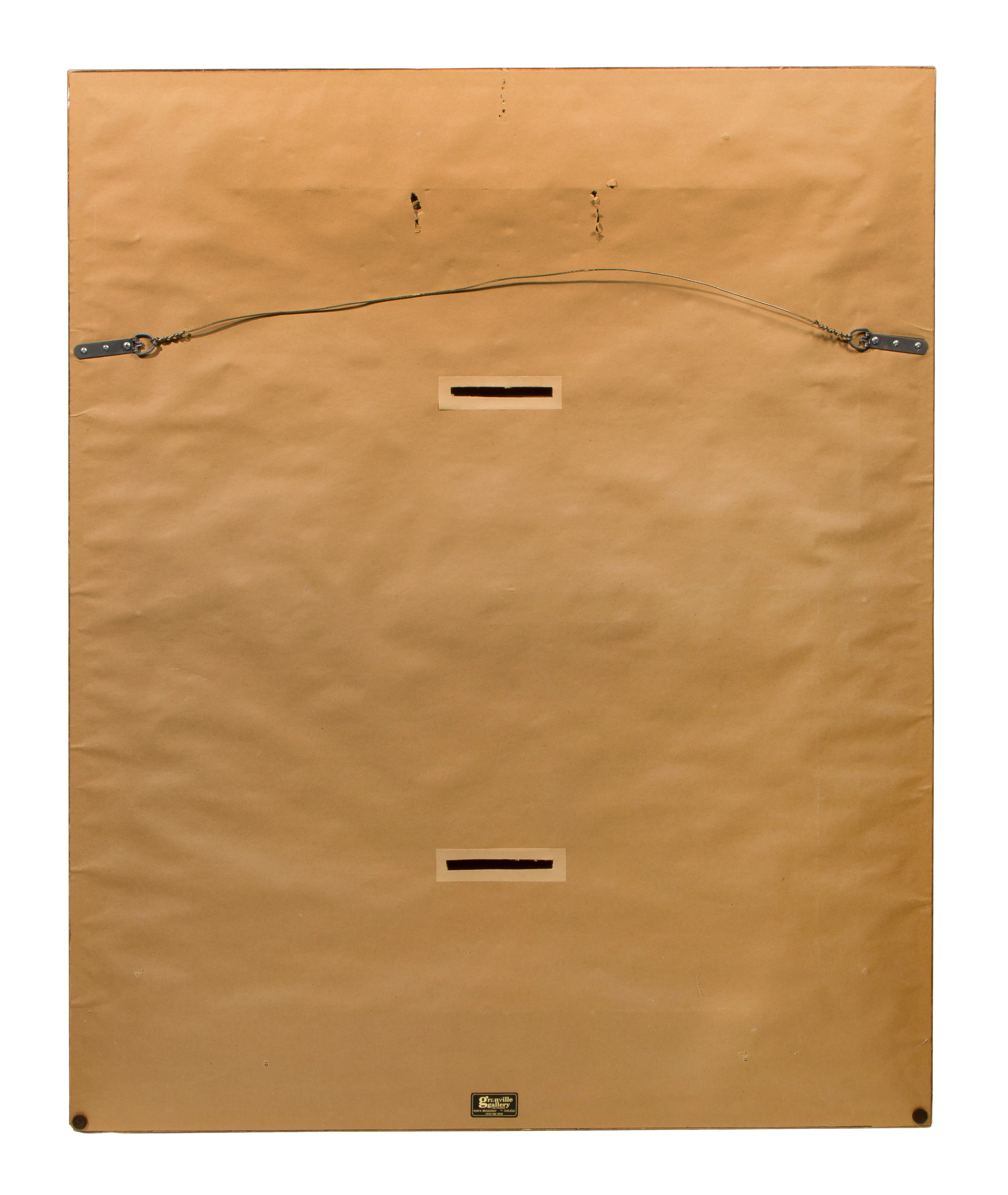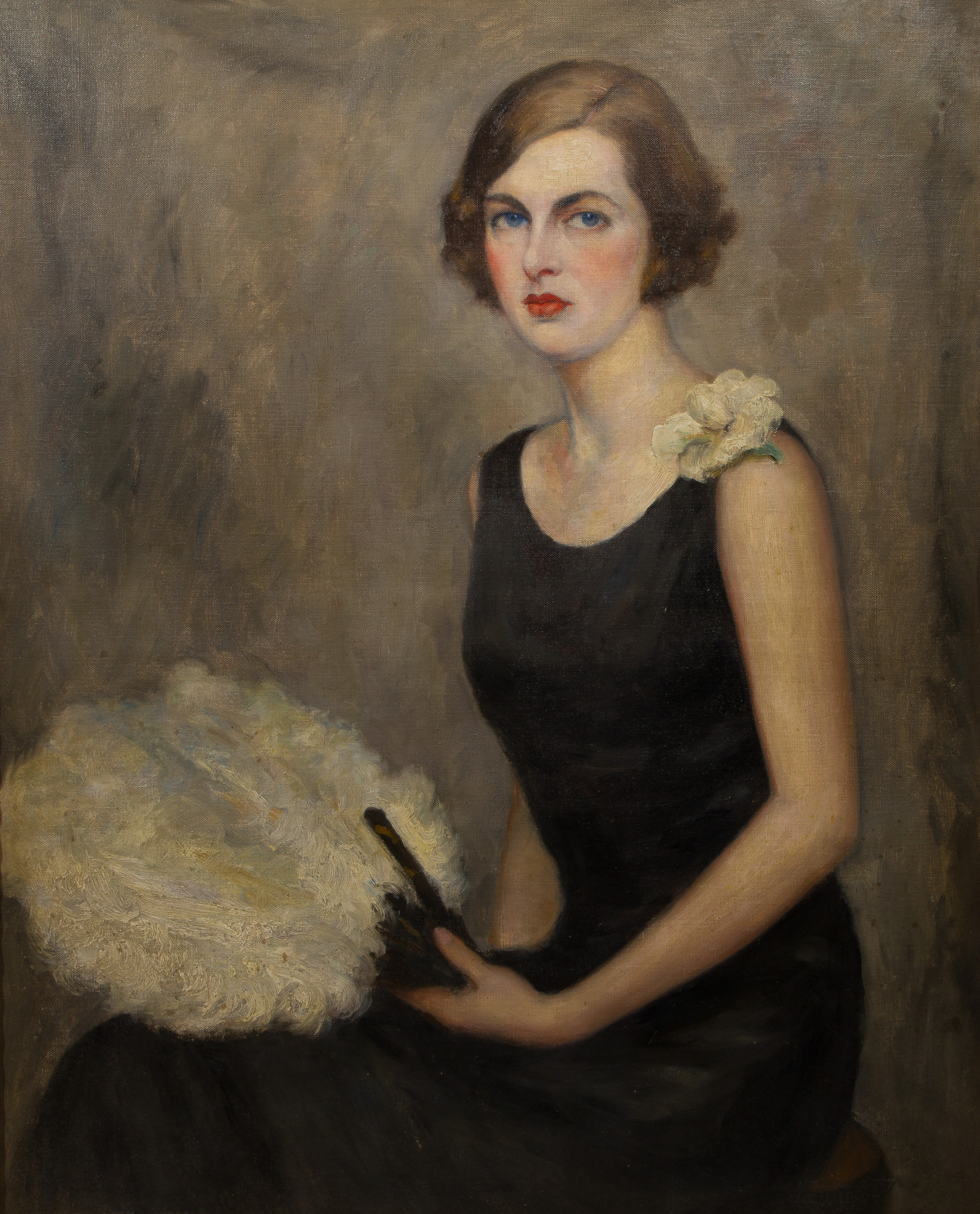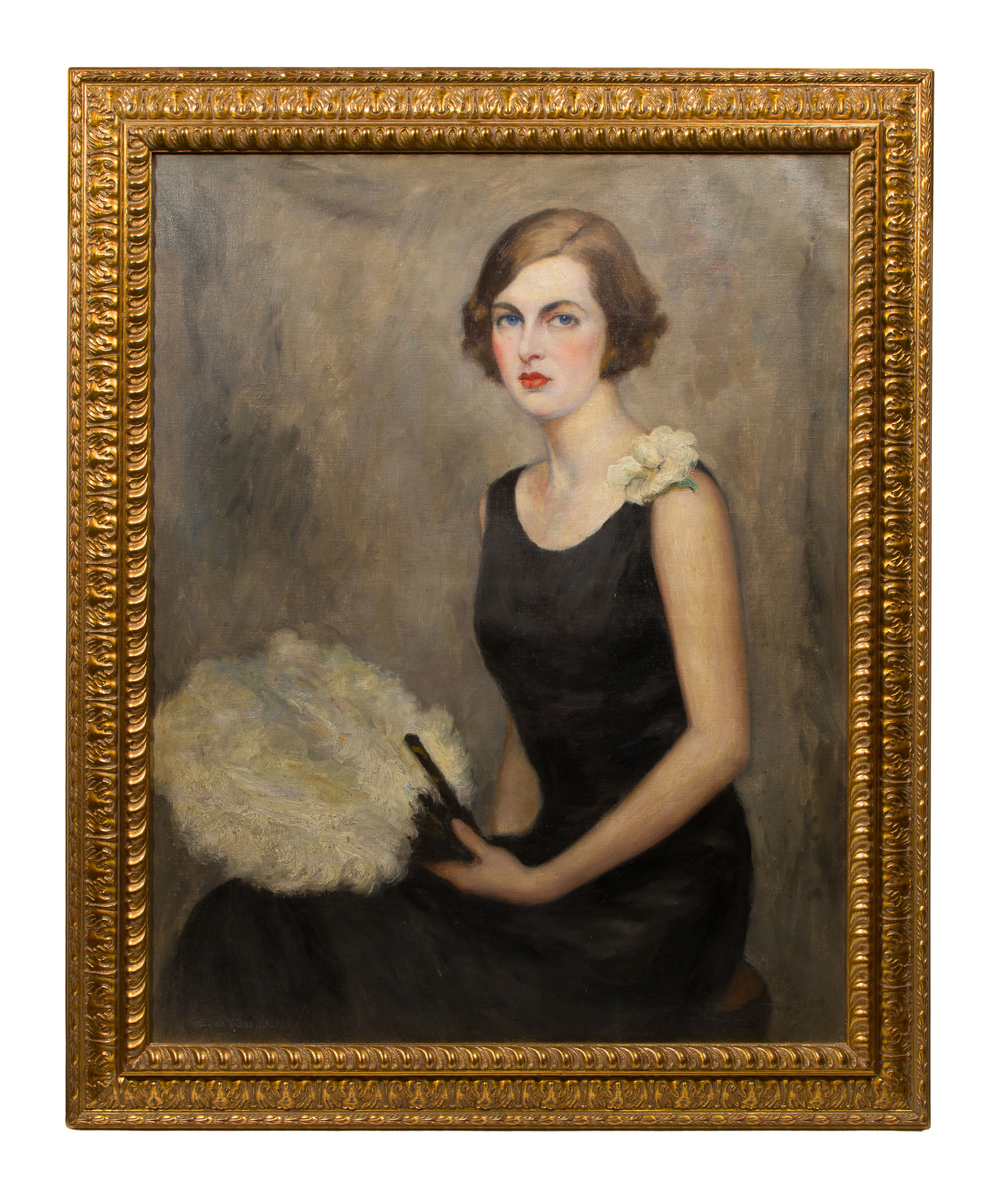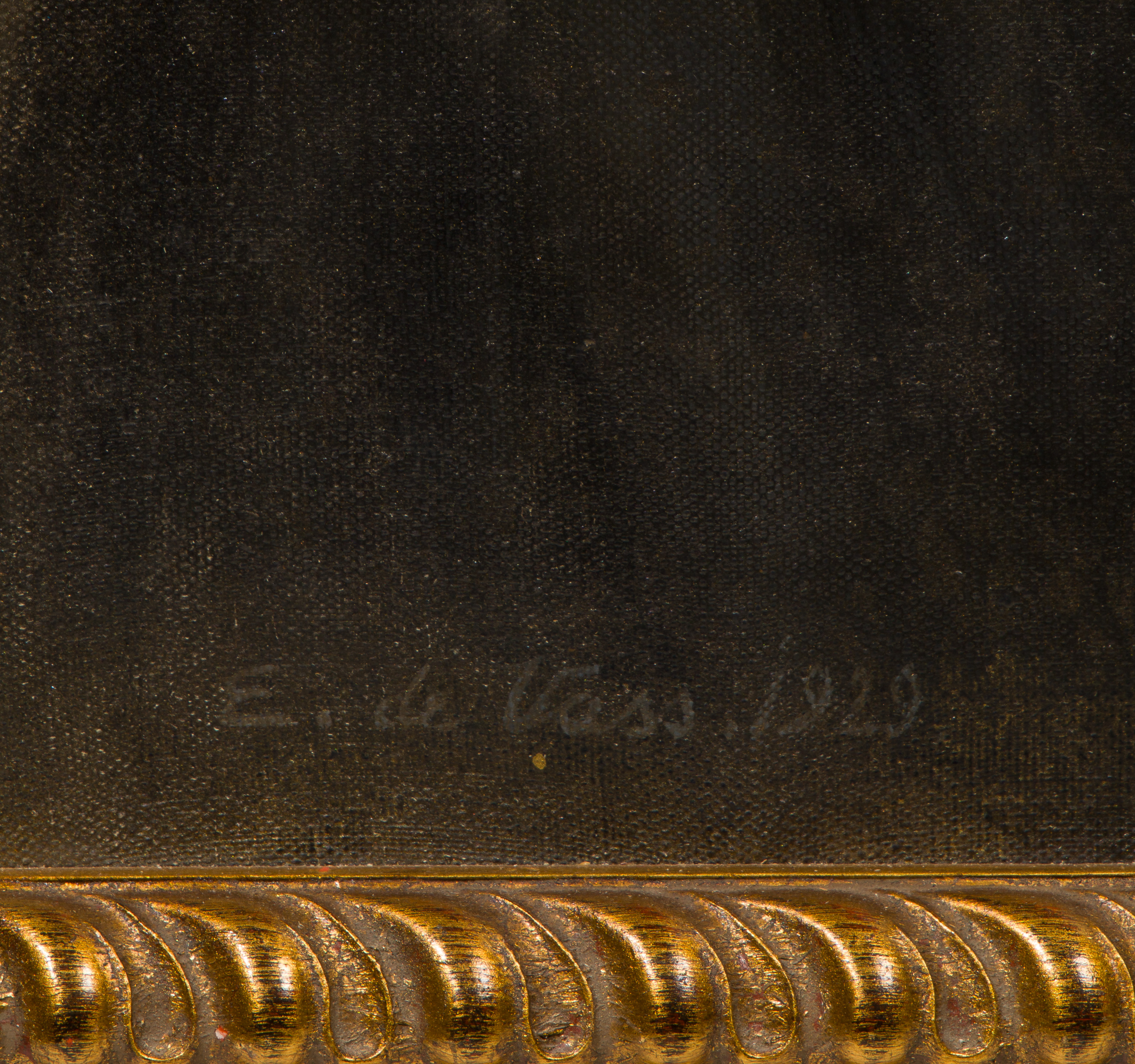 1929, signed ‘E. de Vass’ and dated lower left, depicting a young woman holding a feathered fan, in a gold-tone gesso on carved wood frame