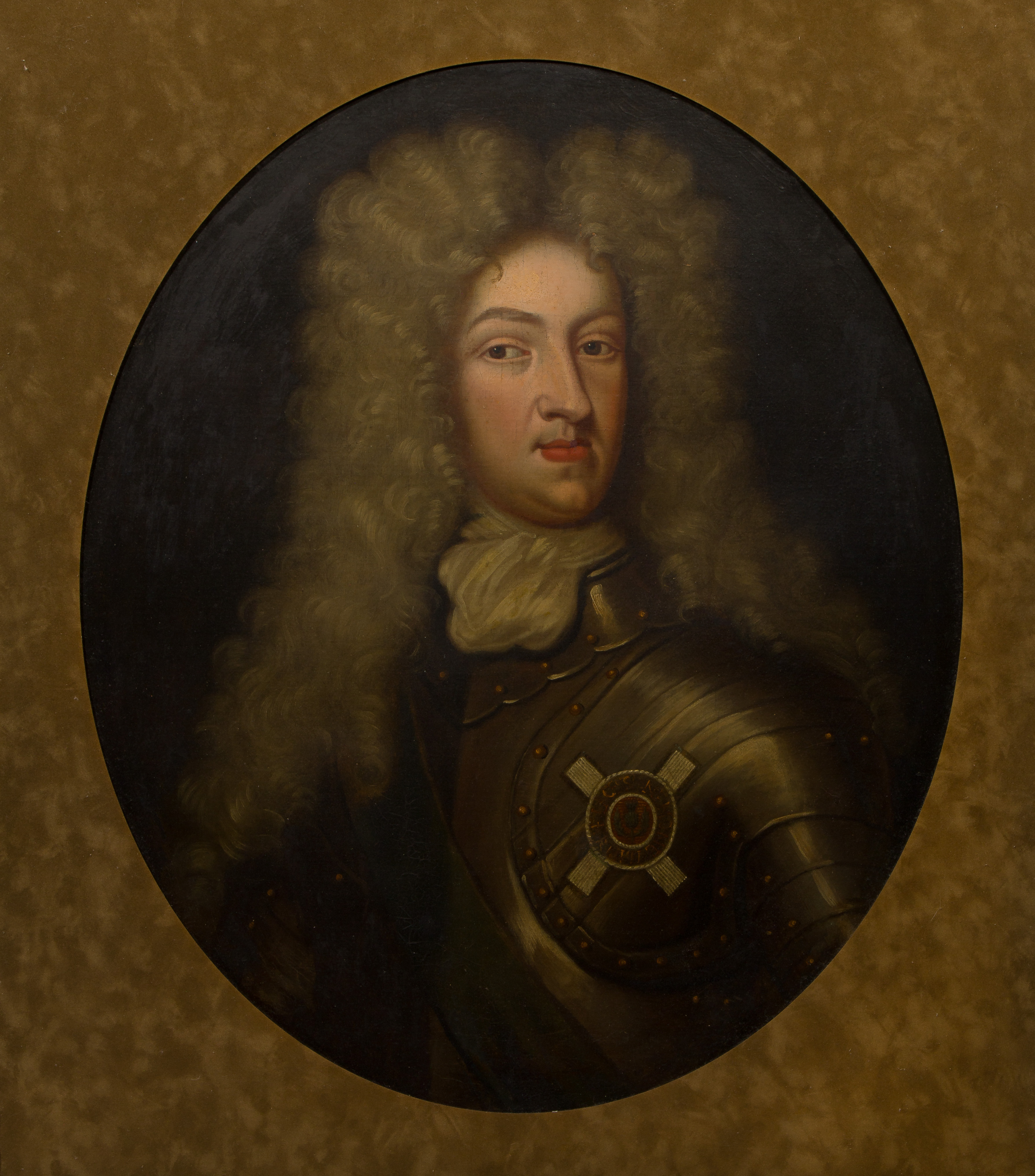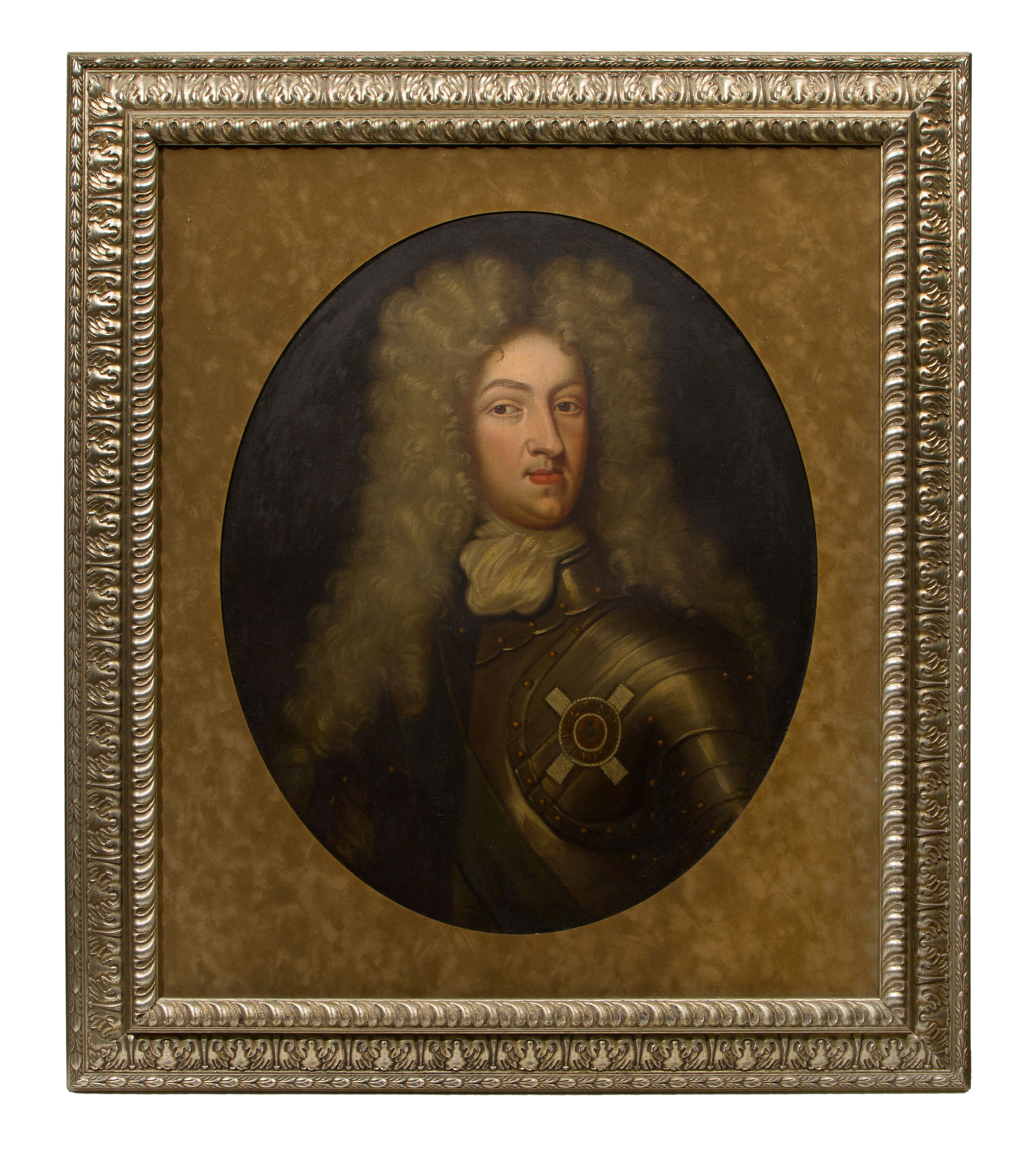 Undated and unsigned portrait of a Baroque era gentleman in armor, wearing what appears to be a medal of the Scottish Order of the Thistle, oval format, having a faux suede mat in a gold-tone gesso on carved wood frame