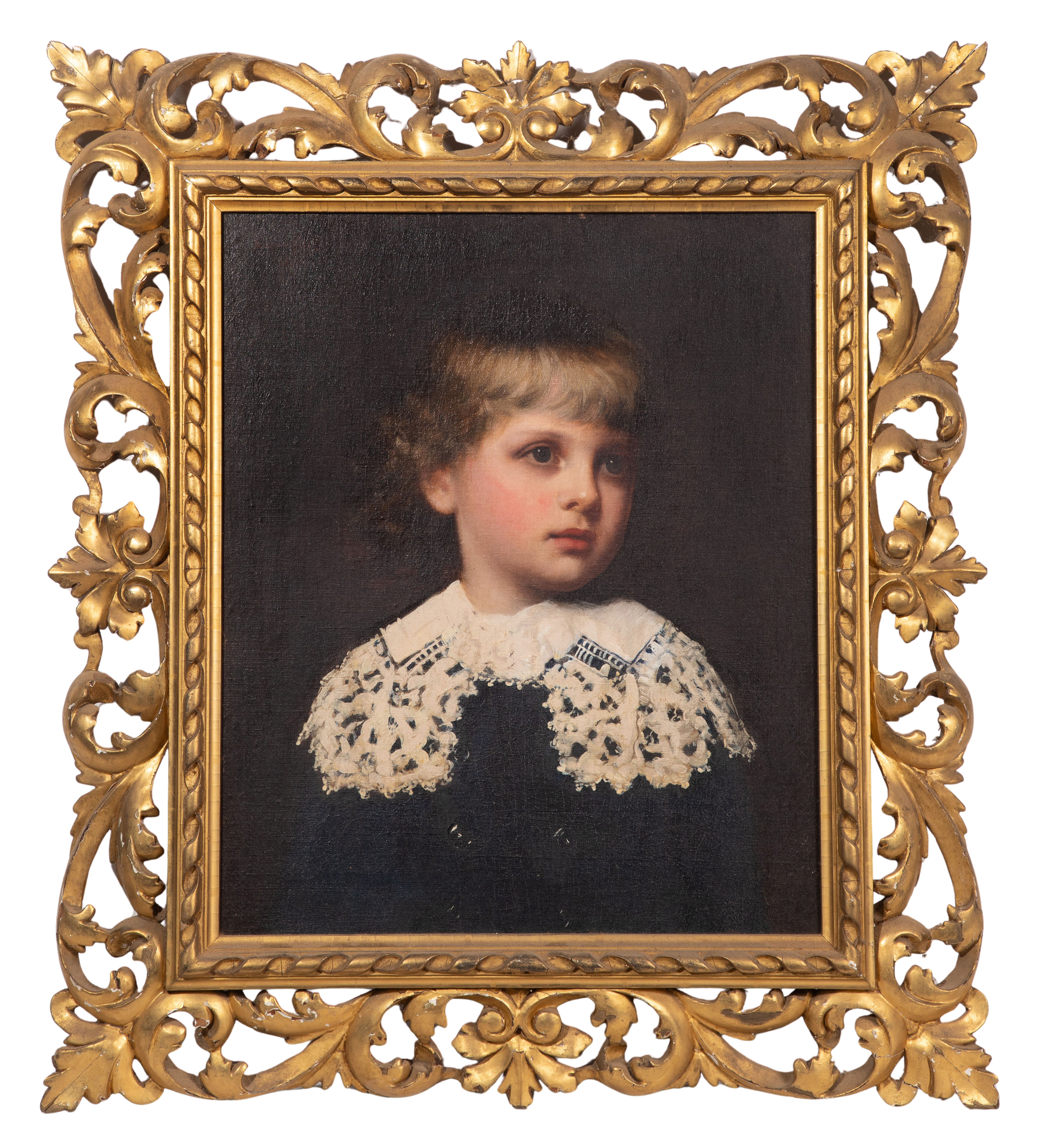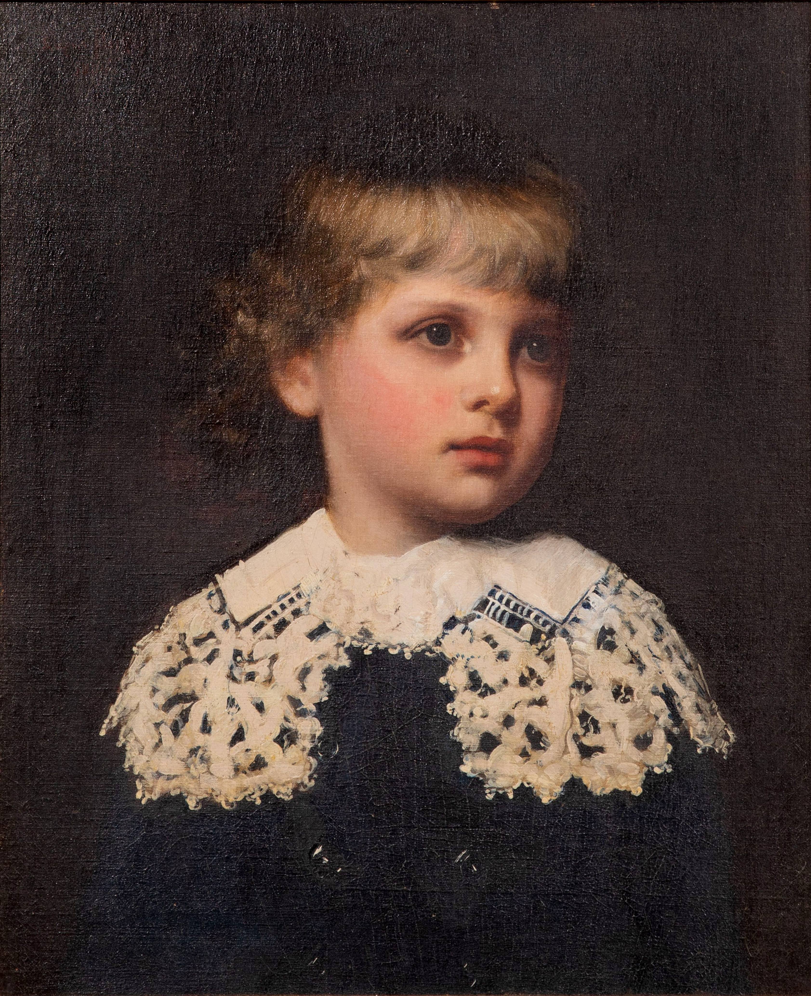 1884, signed upper left, portrait of a young child in a white lace collar, in a gold-tone gesso on wood frame