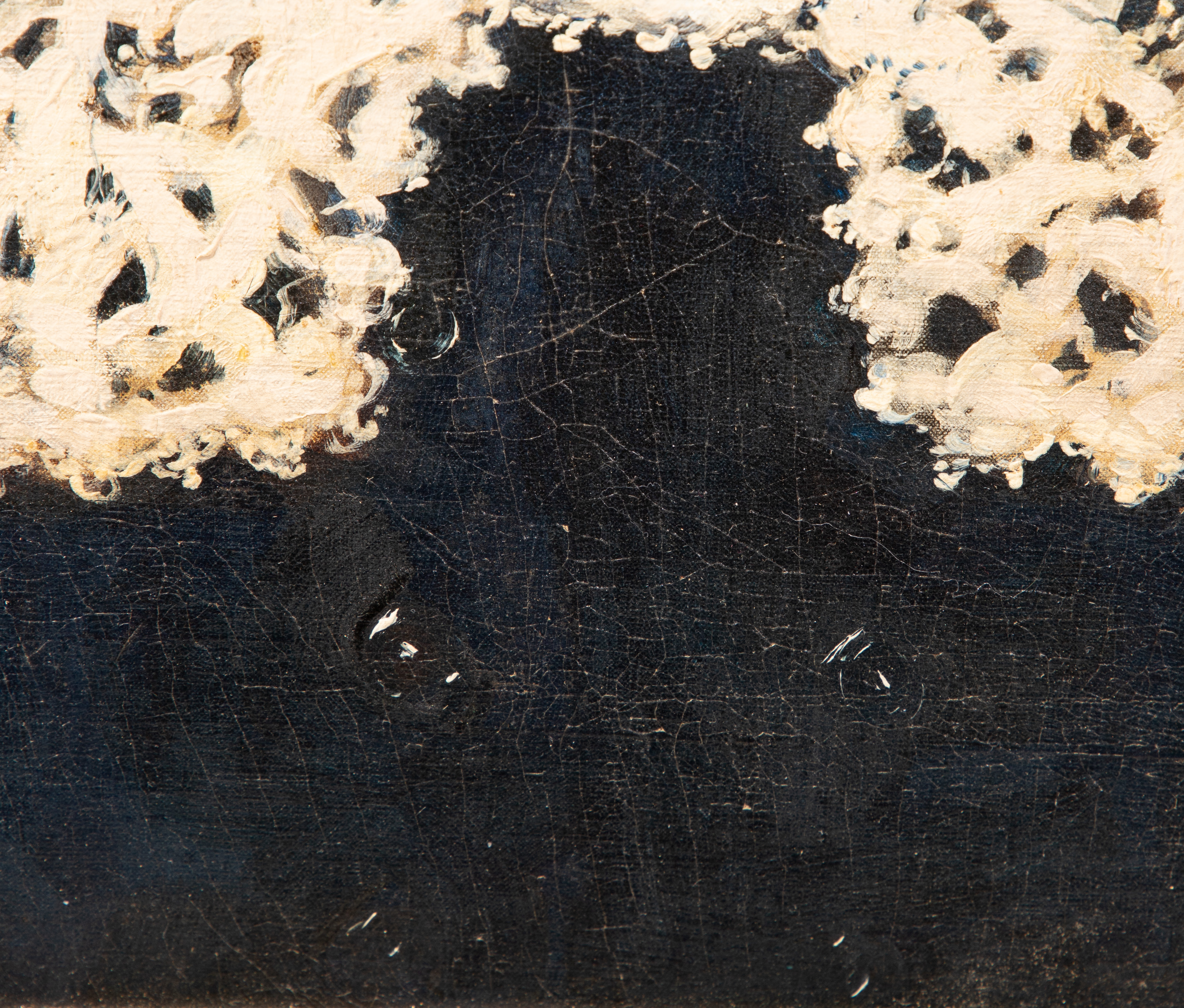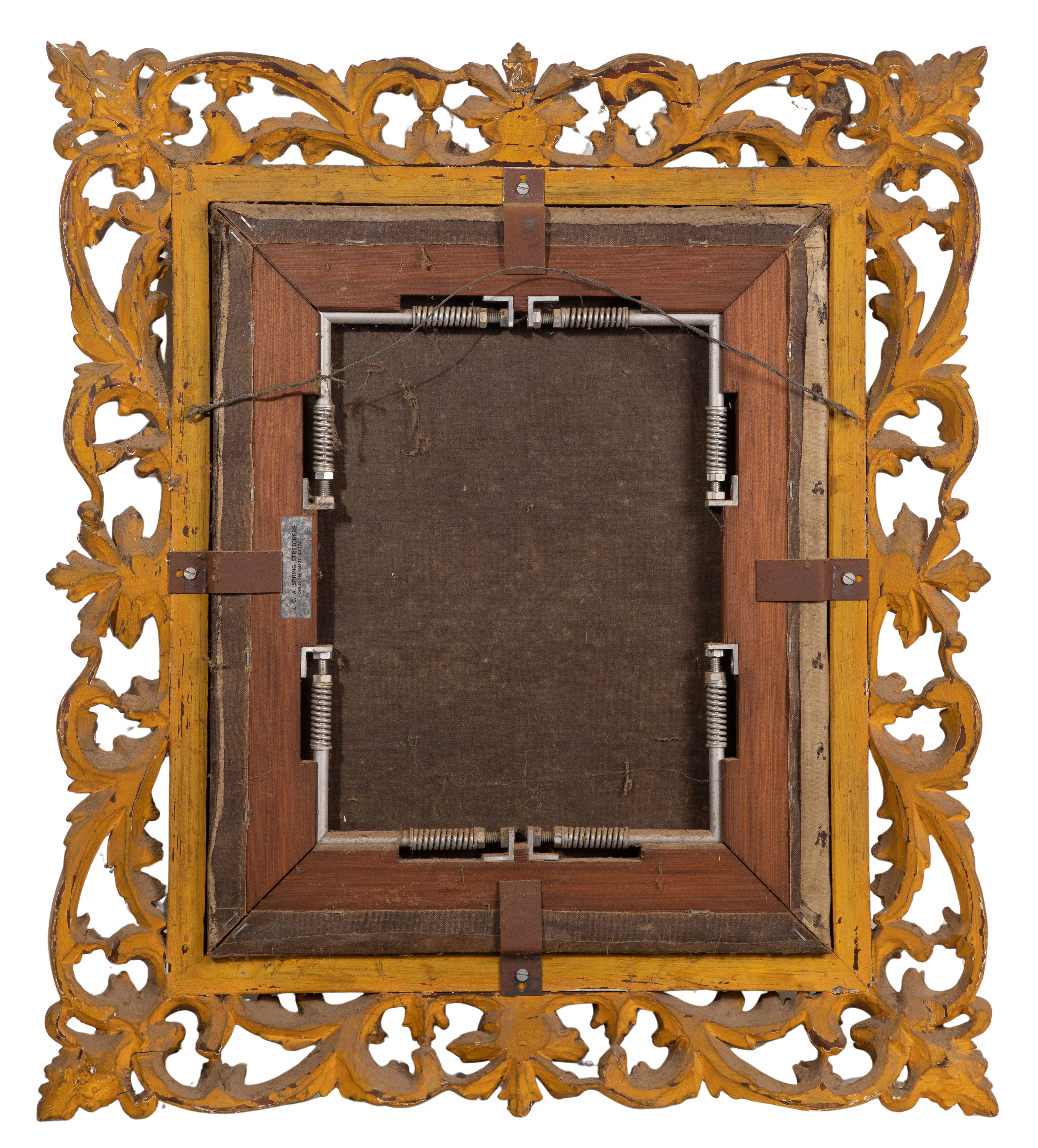 Condition: craquelure overall, minor area of missing paint top center edge, light dirt and dust accumulation, appearing relined and re-stretched, frame having wear including nicks, chips, cracks, missing gesso