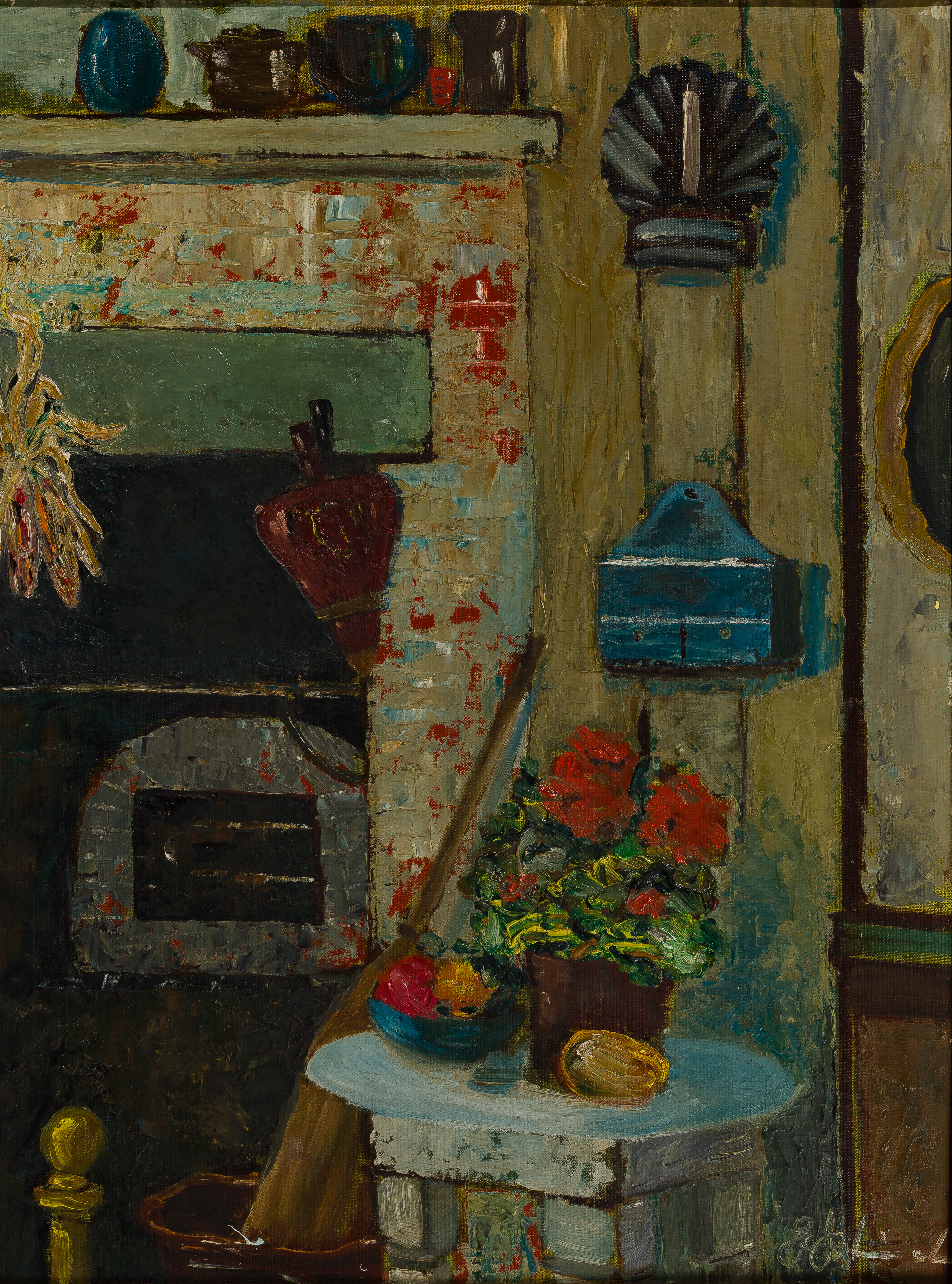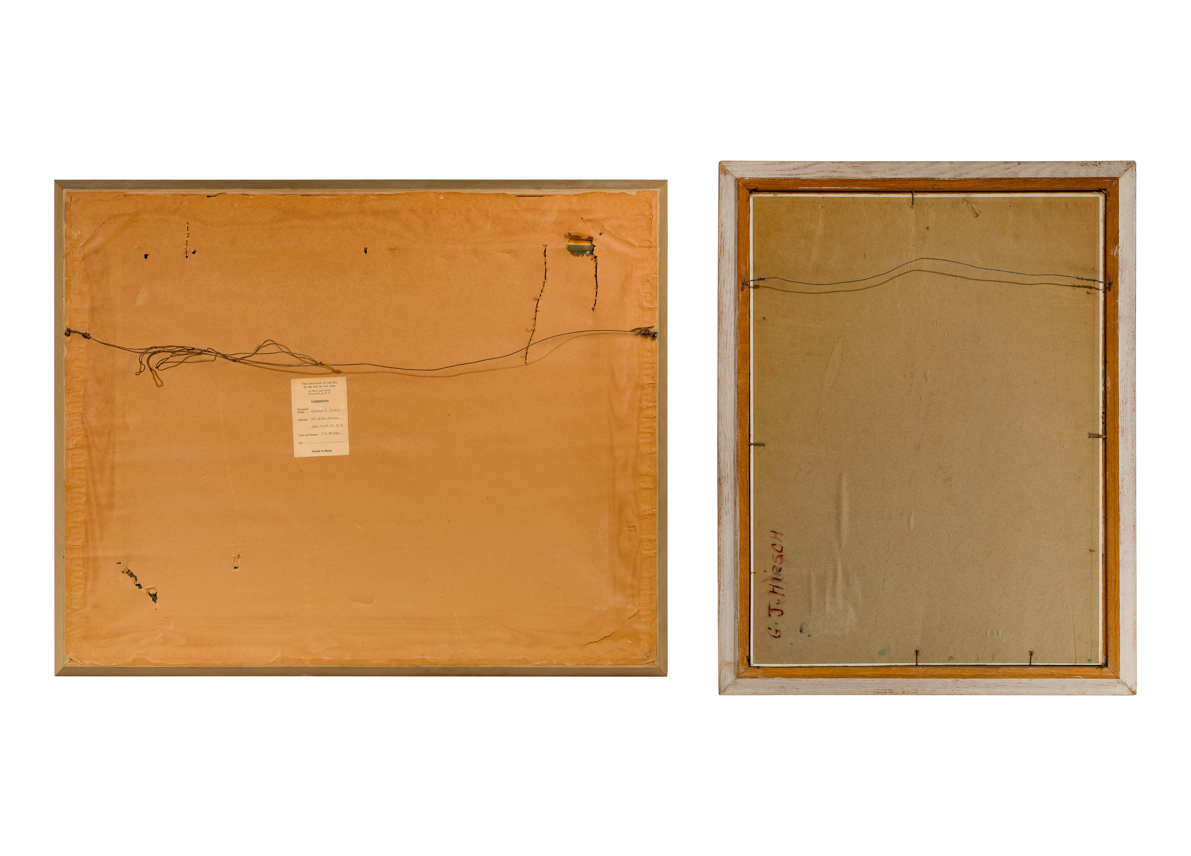 (2) items including a 1956 ‘The Bridge’, signed lower right and titled verso, depicting a New York City scene in winter near a bridge, retaining an exhibition label verso and an undated, signed lower right depicting an interior scene, both in painted wood frames