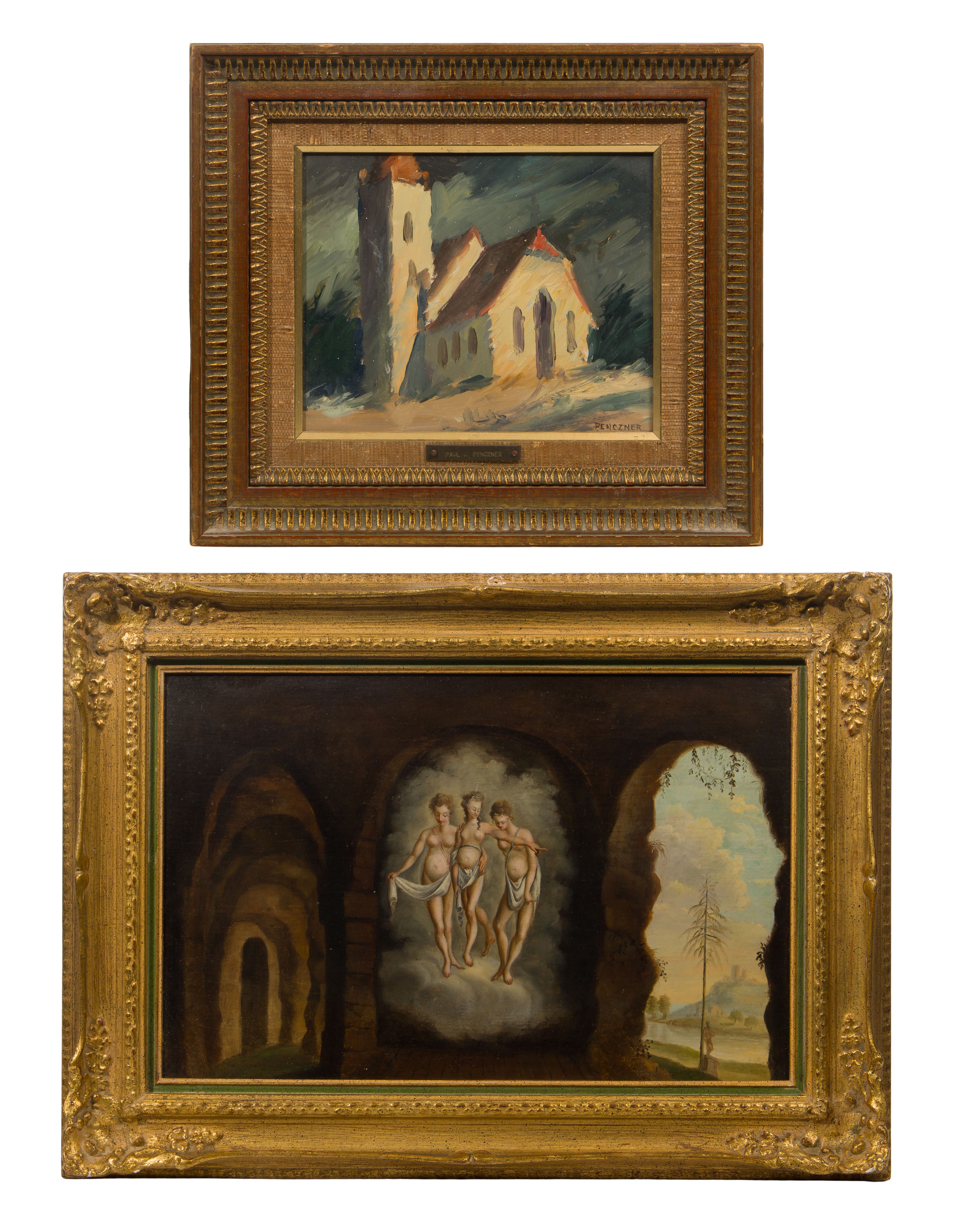 (2) total items including an undated Penczner, signed lower right, an impressionistic view of a church in a burlap lined gold-tone carved wood frame having a brass name plaque; together with an undated, unsigned symbolist oil on board depicting an apparition of the Three Graces between a dark passageway and a view out an open window, in a gold-tone gesso on carved wood frame