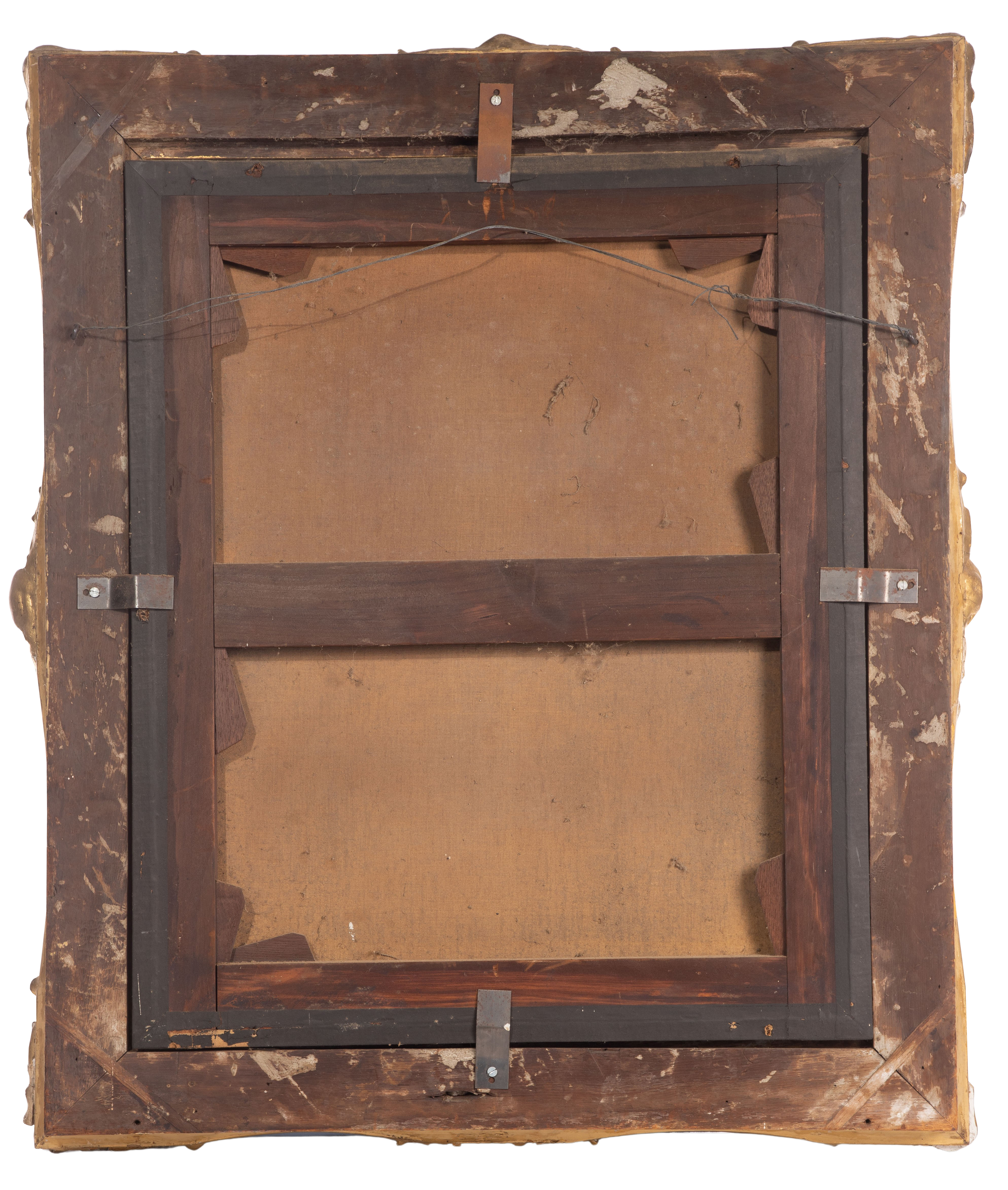 Condition: canvas slipped in frame, occasional specks of white paint, moderate dirt accumulation, frame having moderate wear, cracks and losses to gesso