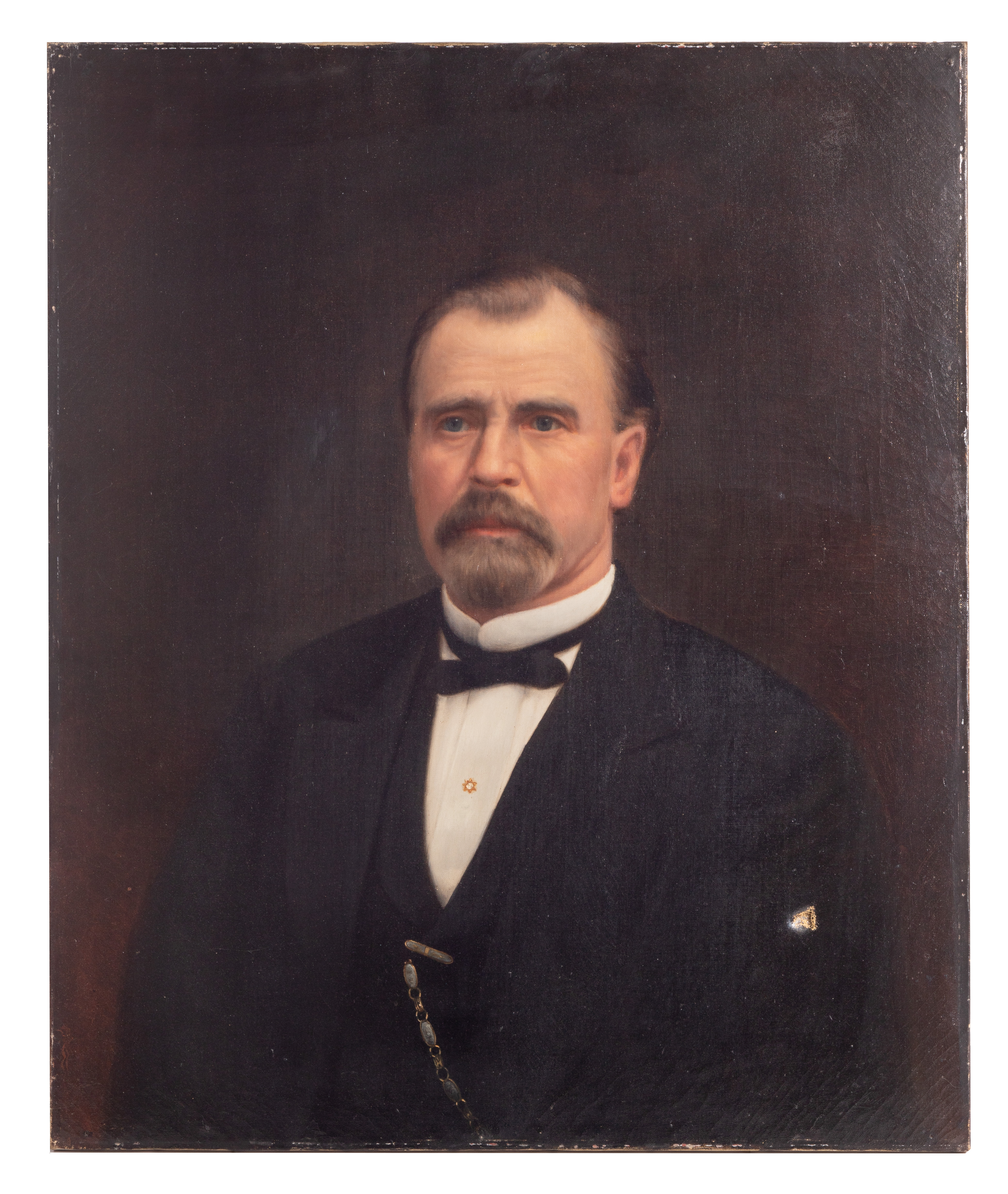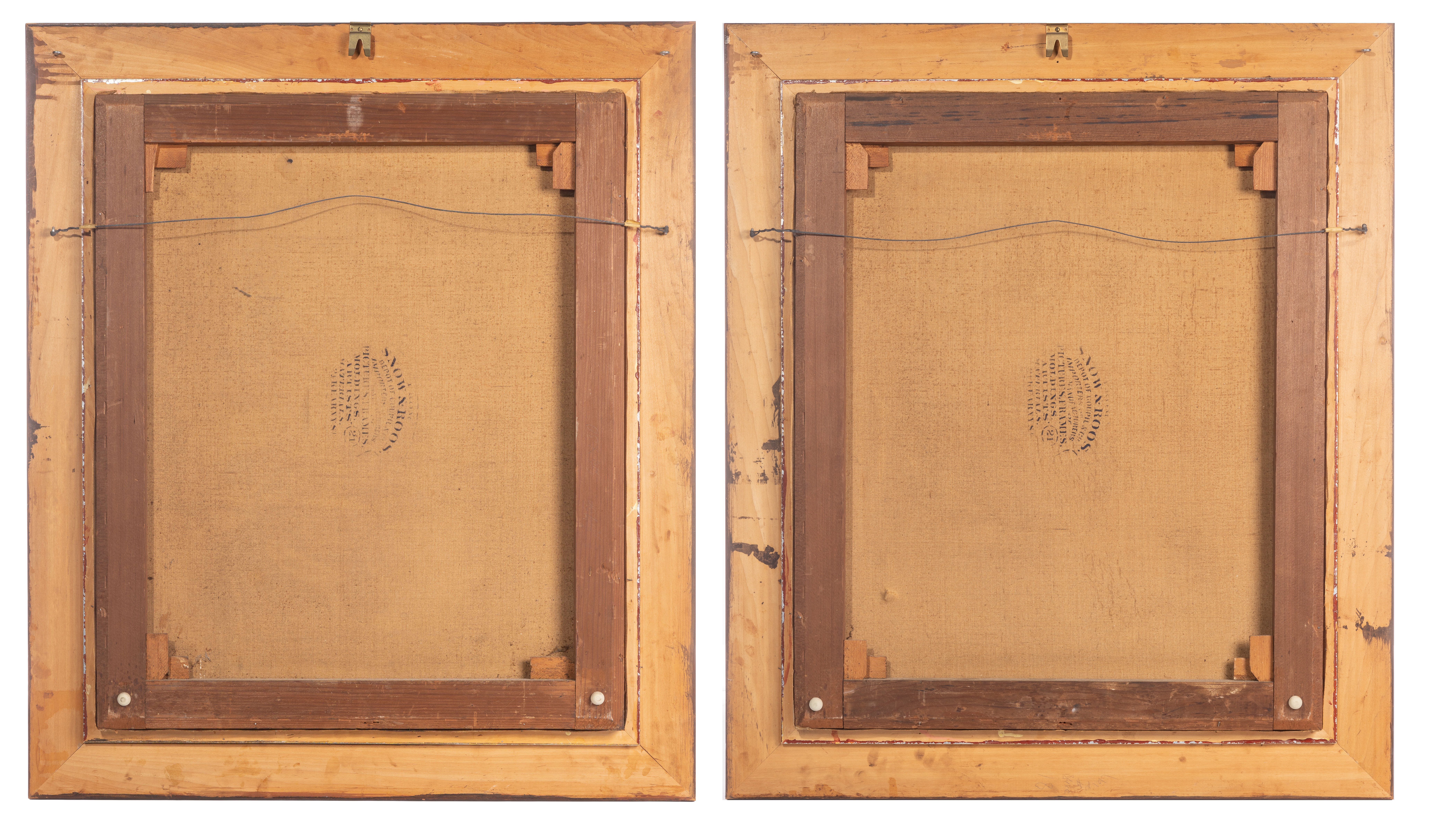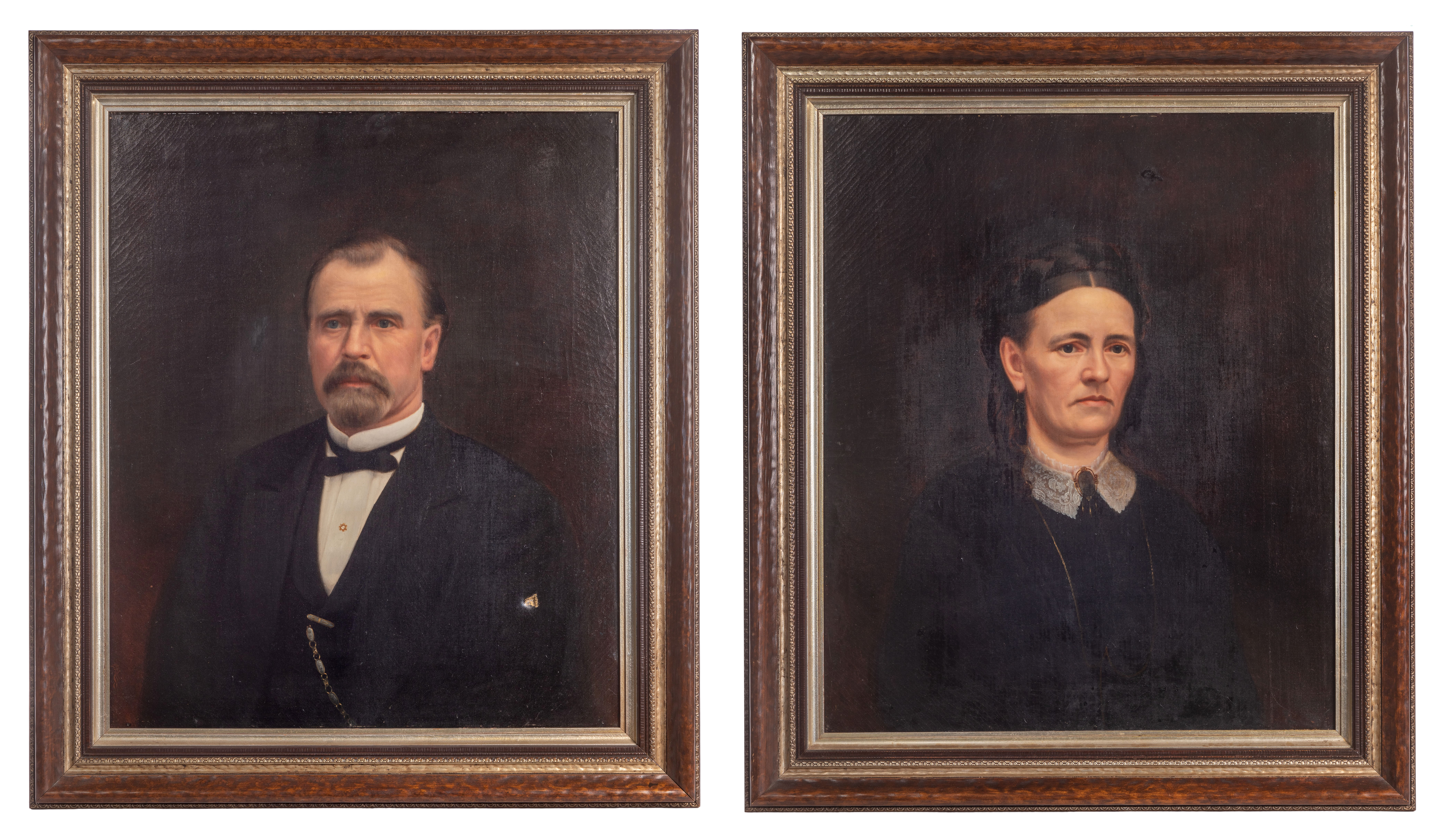 (2) undated items, unsigned portraits of a prosperous couple, both canvases having stamp verso reading ‘Snow & Roos / Depot of Goupil & Co. / Importers & Manufacturers of / Pictures, Frames, / Moldings and Artists’ Materials. / 21 Kearny St.’ in San Francisco, California, uniformly framed in gold-tone accented faux burl wood
