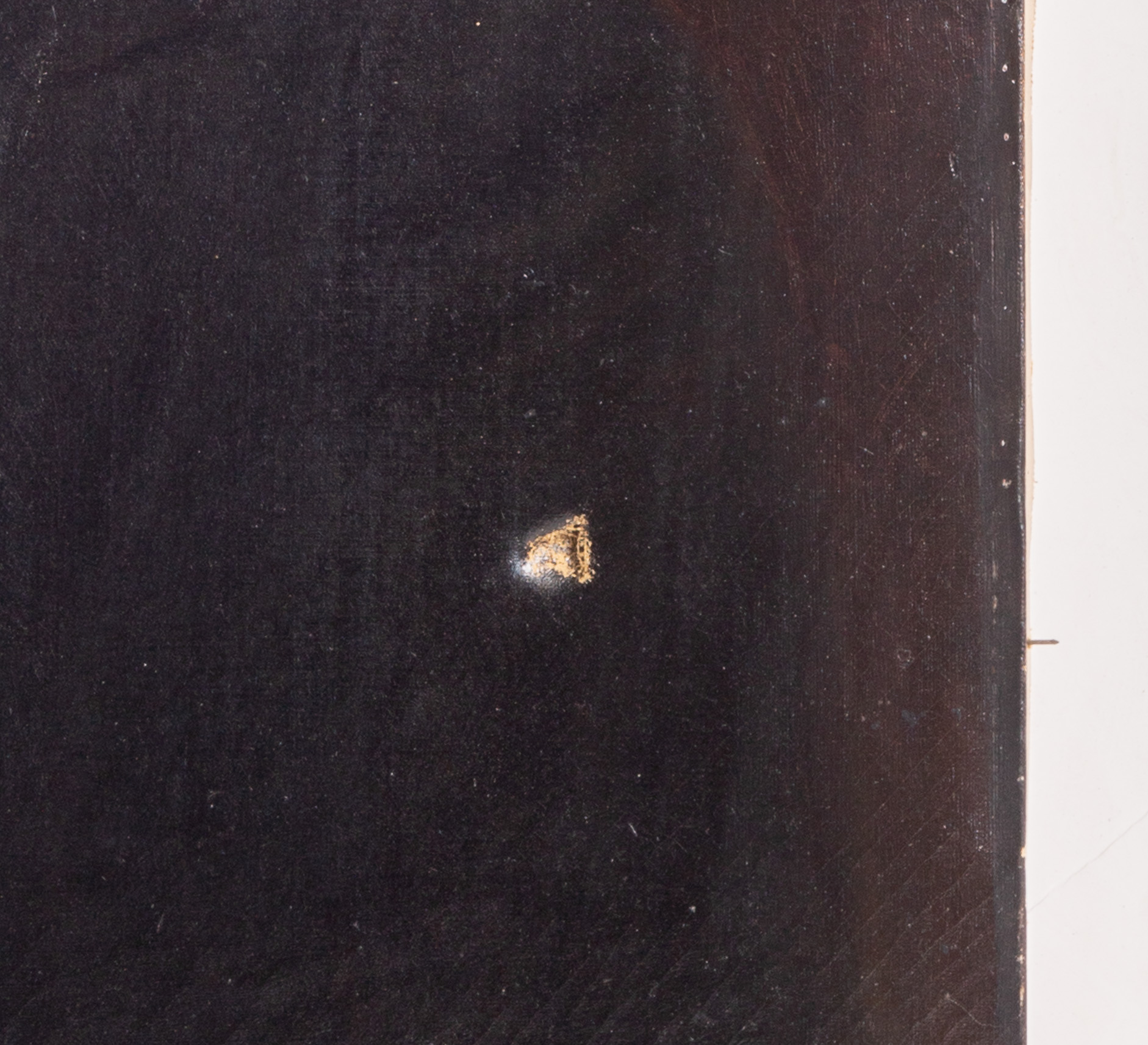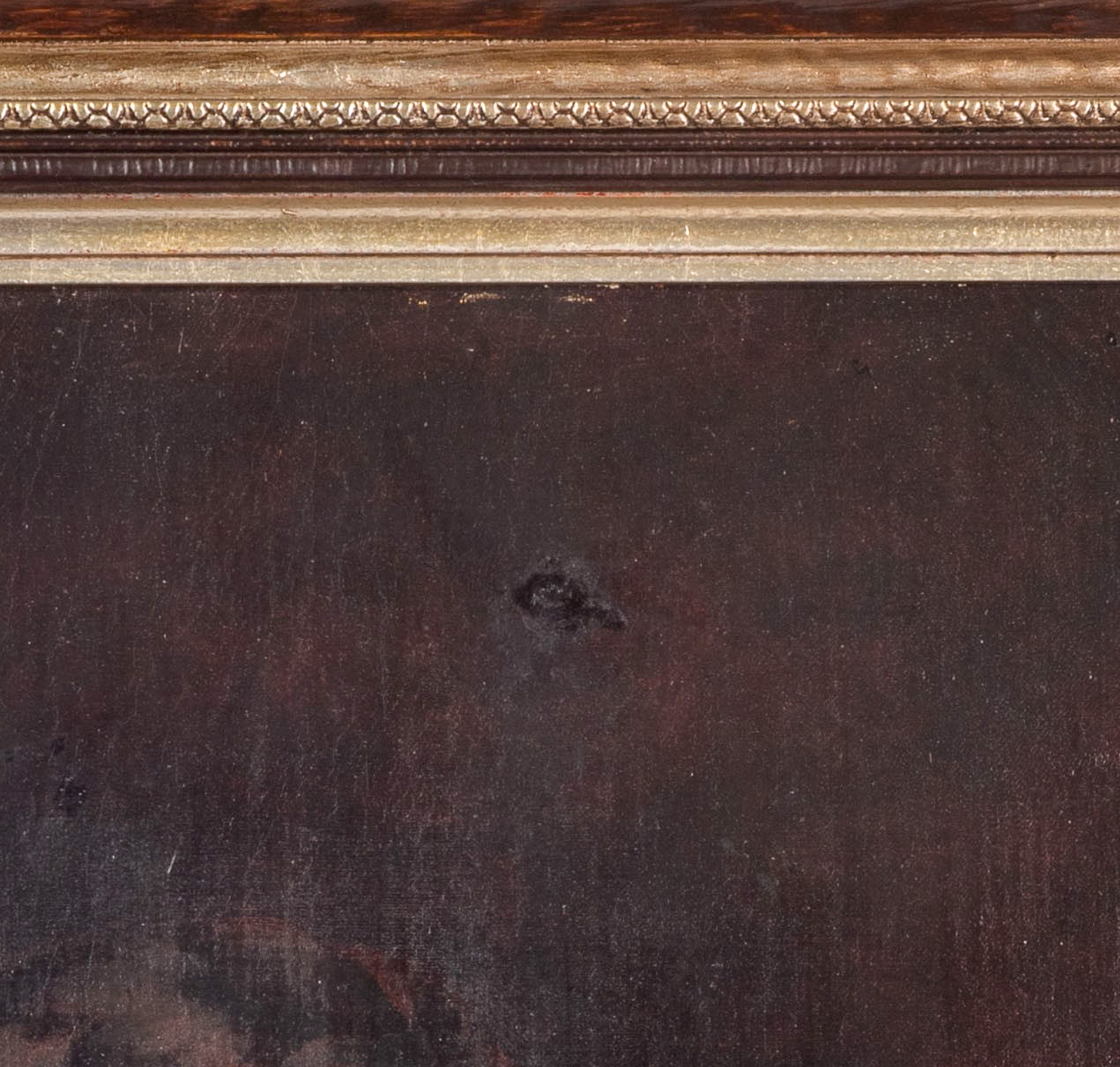 both having punctures, the woman\'s puncture repaired and in-painted, the man\'s canvas loose in frame and showing frame friction, occasional specks of white house paint, light dirt accumulation, frames having light wear