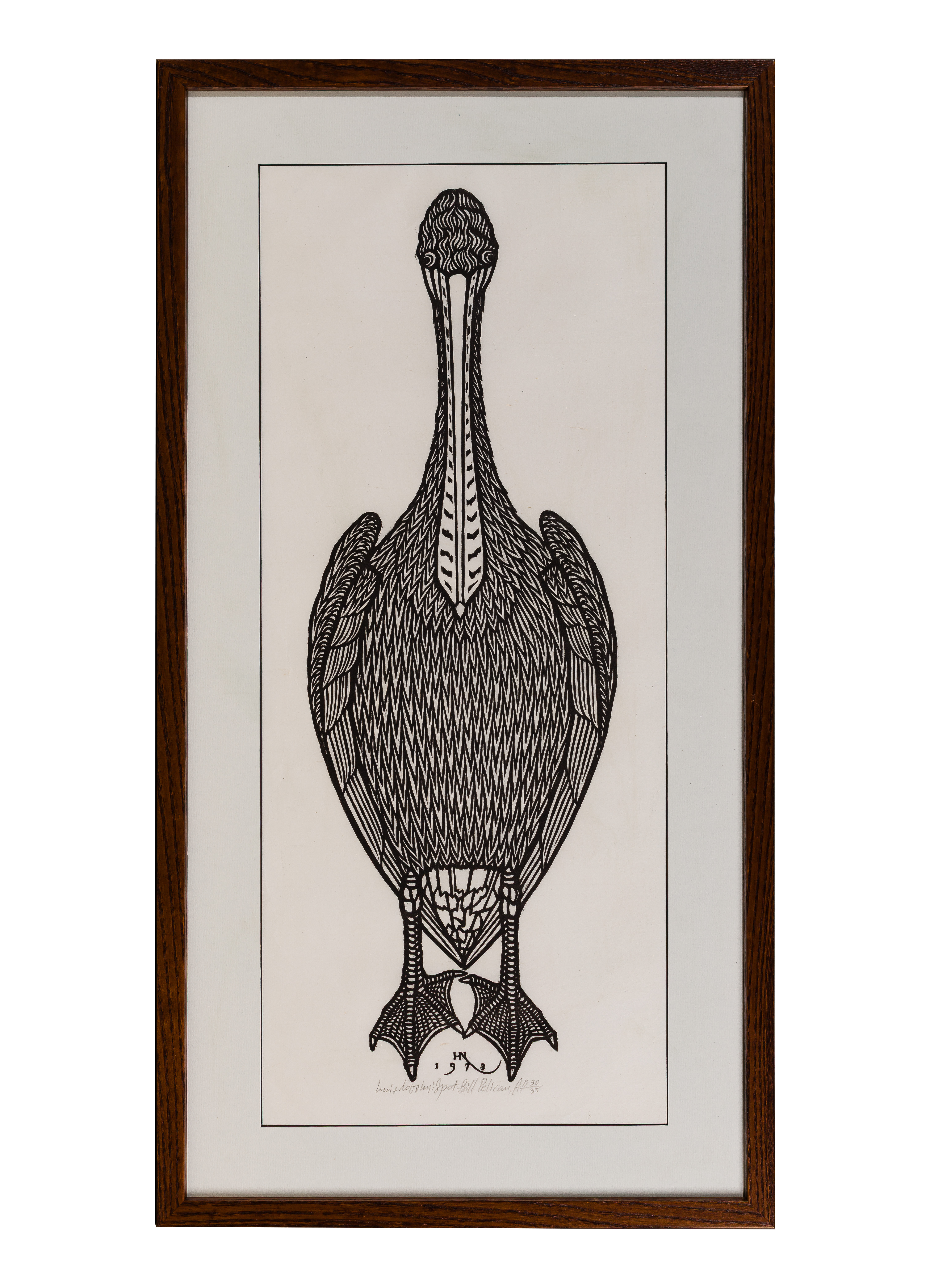 1973, pencil signed, titled and ‘AP 30/35’ lower center margin, depicting a pelican, matted under glass in a wood frame