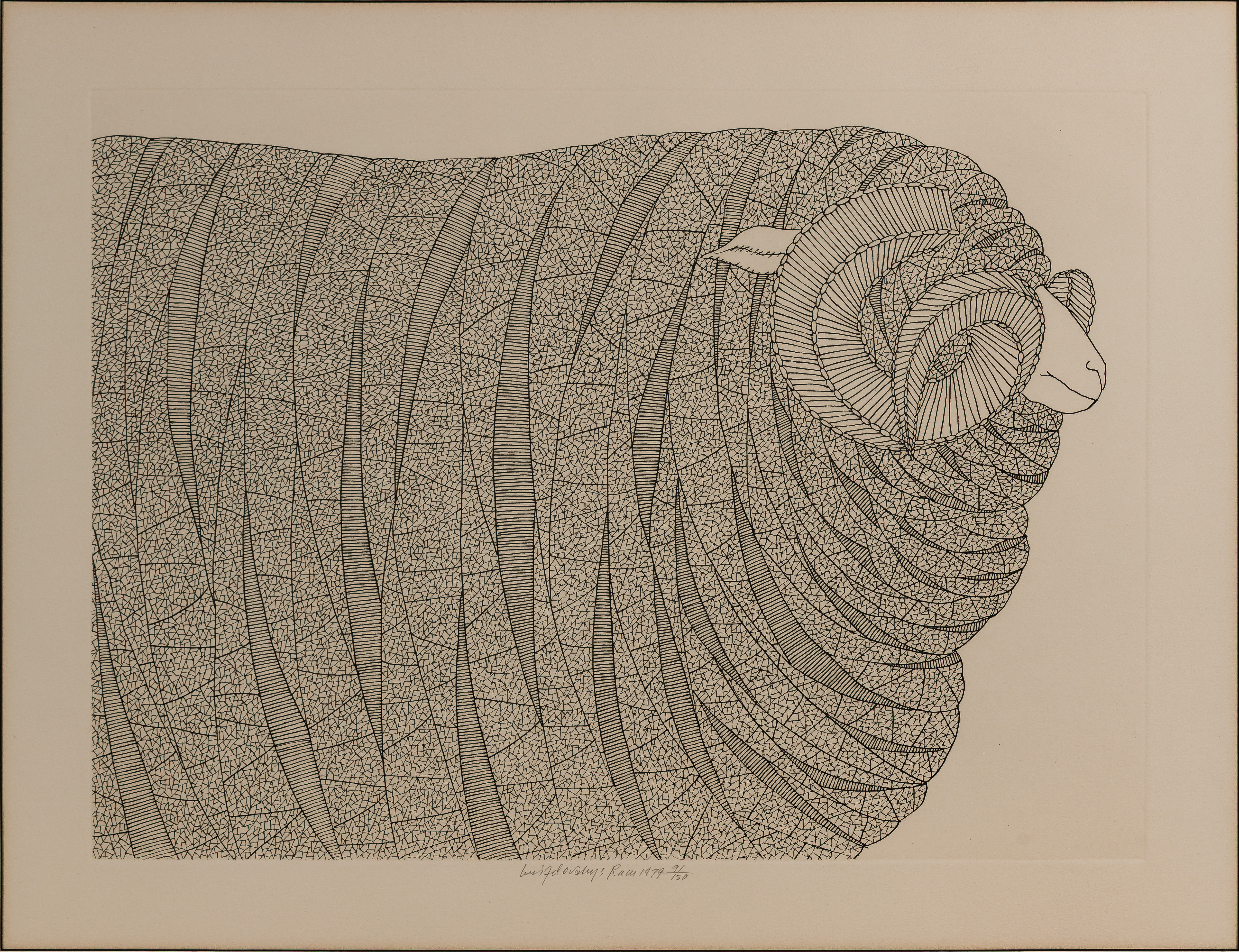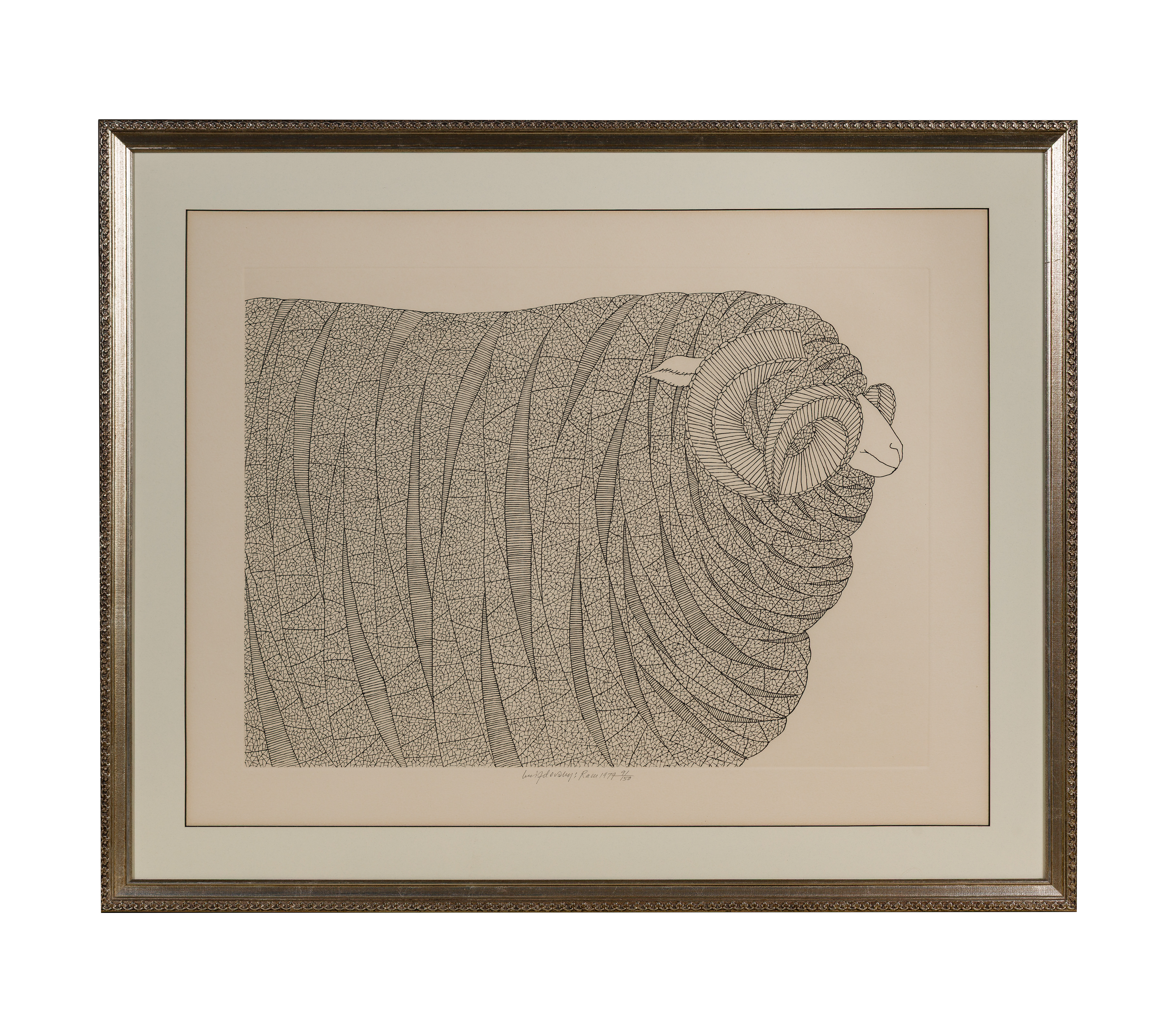 1979, pencil signed, titled and #91/150 lower center, depicting a horned ram, matted under glass in a wood frame