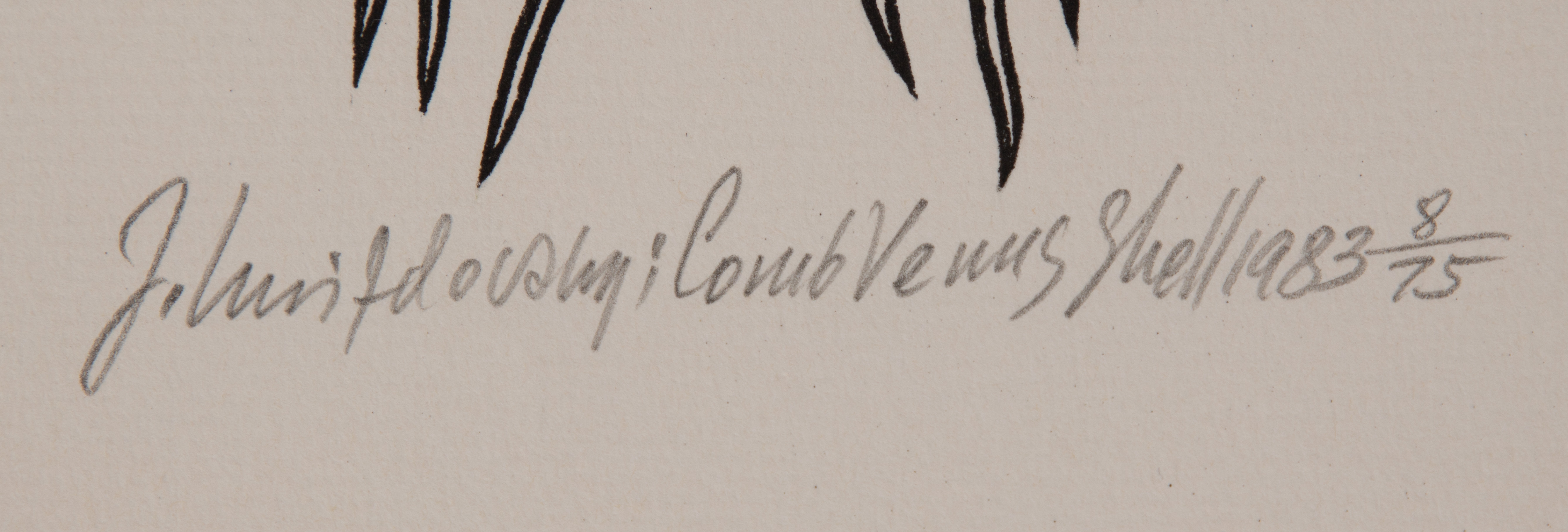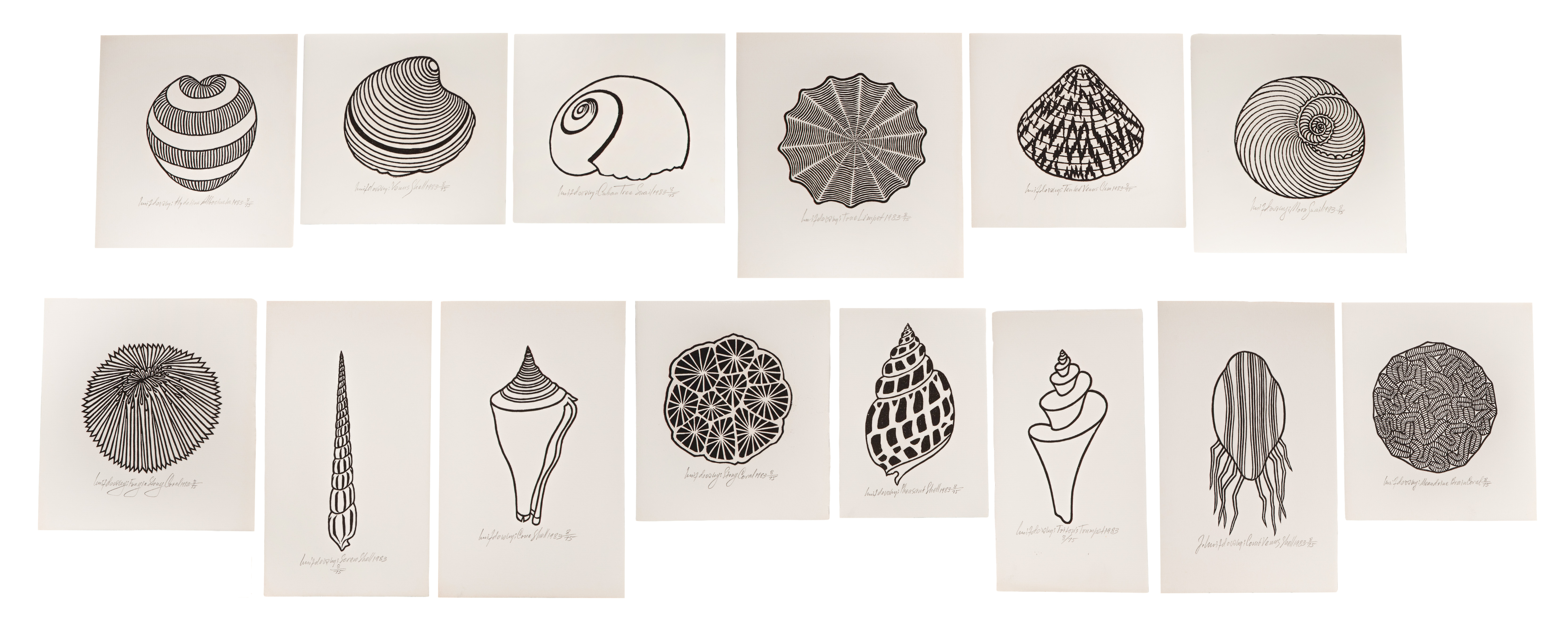 1983, (14) woodcuts depicting shells, each pencil signed, titled, dated and #8/75 below images, on sheets of cream laid paper of various sizes, as issued in a deckle-edged tri-fold paper wrap titled and numbered in the artist’s hand