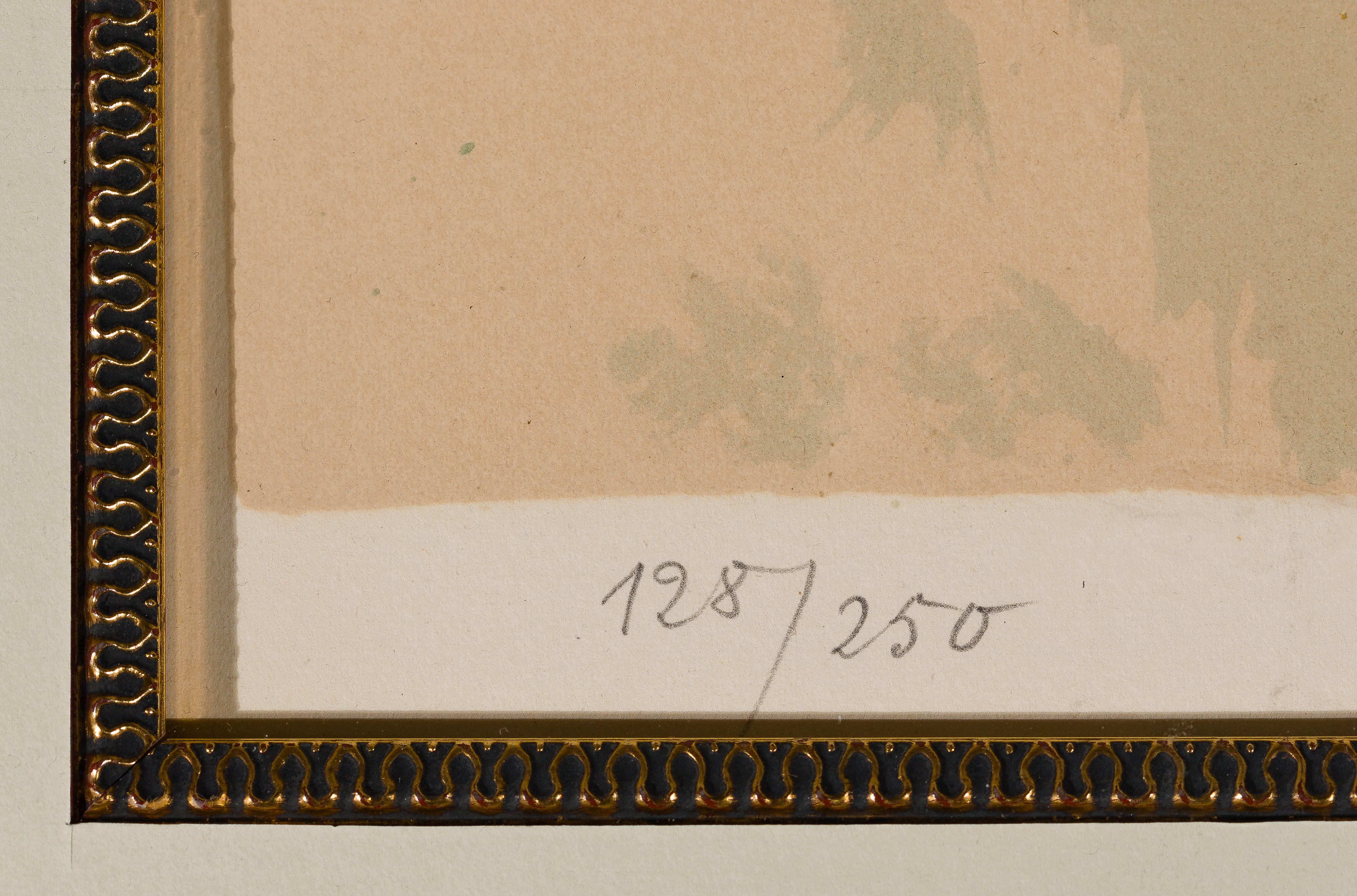 Undated, pencil signed lower right, #128/250, depicting an astrological scale, matted in a carved wood frame