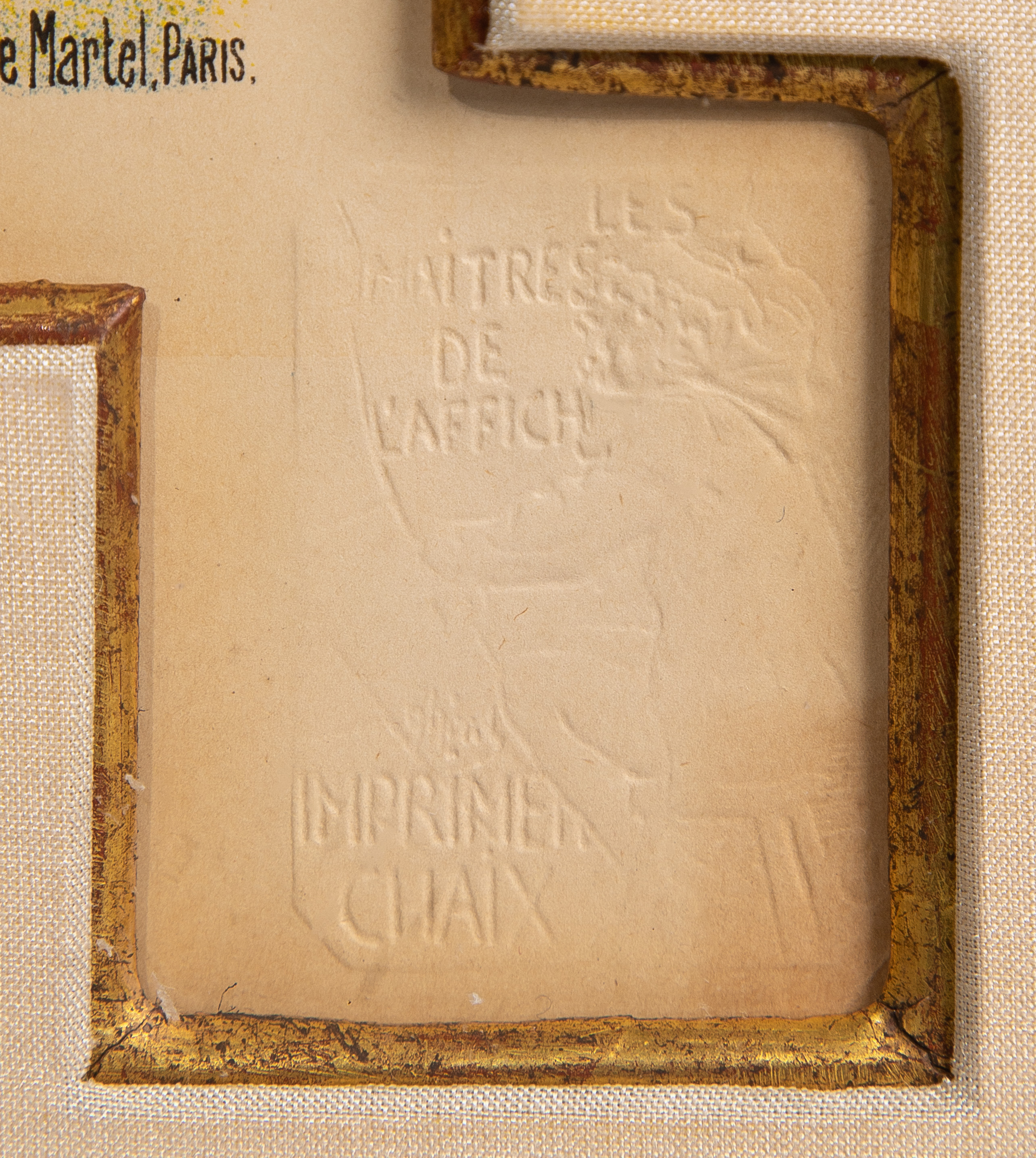 1898, plate #122 from volume #3 of ‘Les Maitres de Affiche’ published by Chaix, Paris, having blind stamp lower right made visible within an auxiliary cut to linen mat, behind glass in a gold-tone composition on wood frame having a brass label affixed to glass and a Hermitage Fine Art bar code label verso