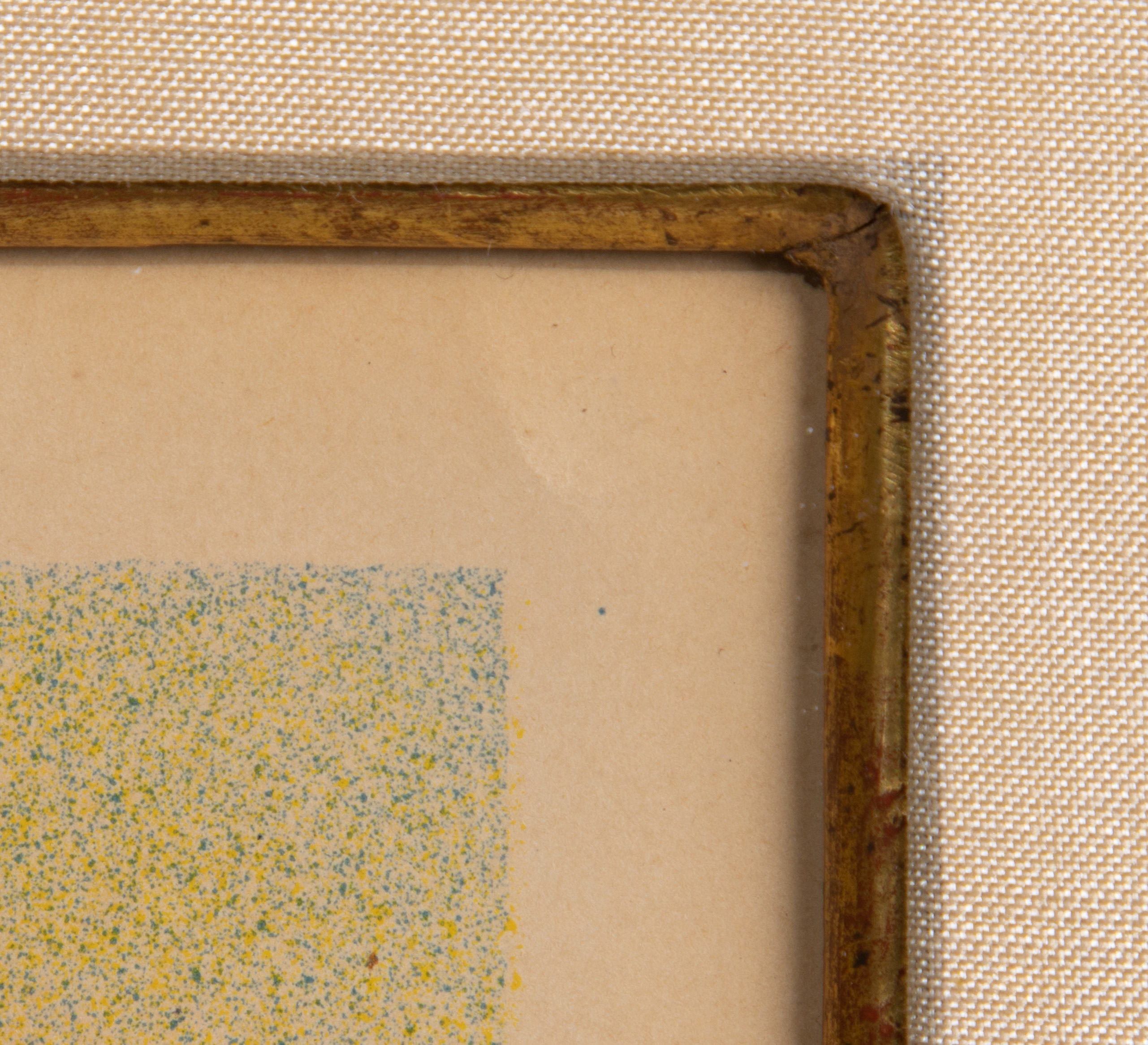 Condition: light toning overall, mat burn or sunning discoloration visible near blind stamp, slight warp to paper upper right corner, frame having light wear