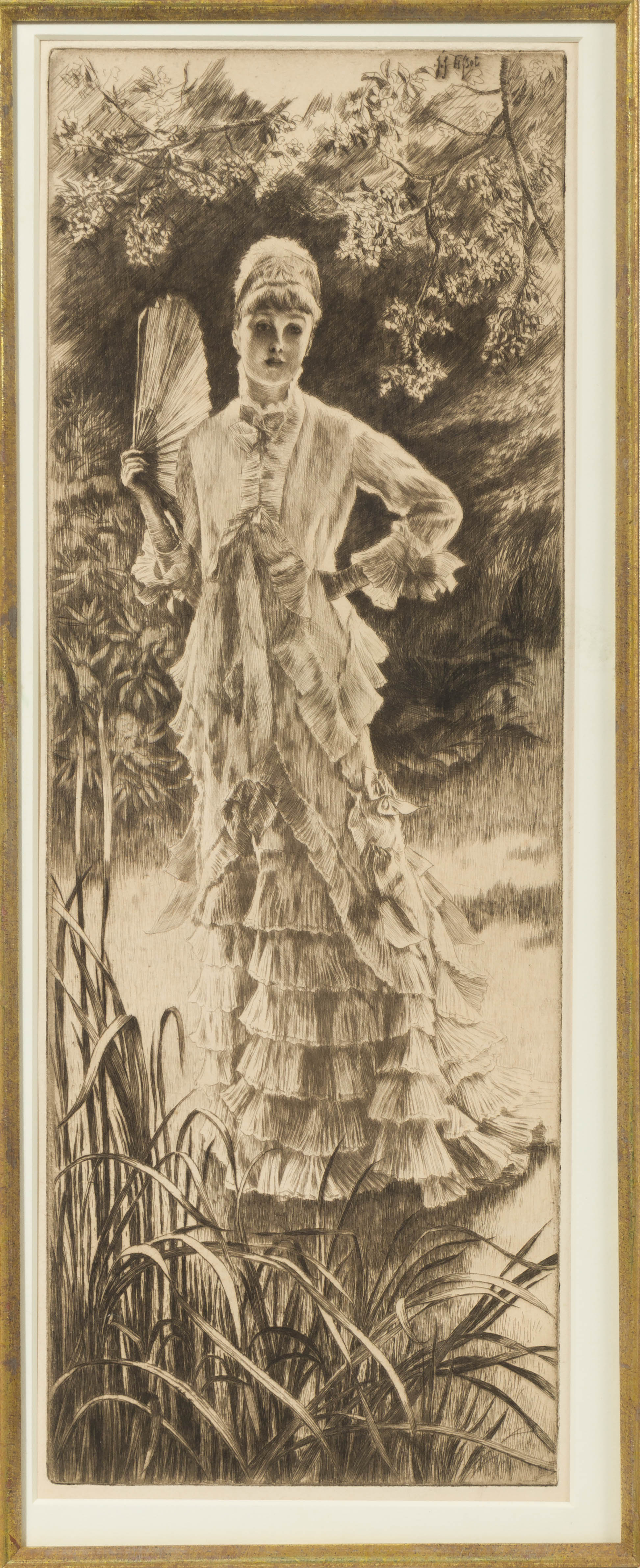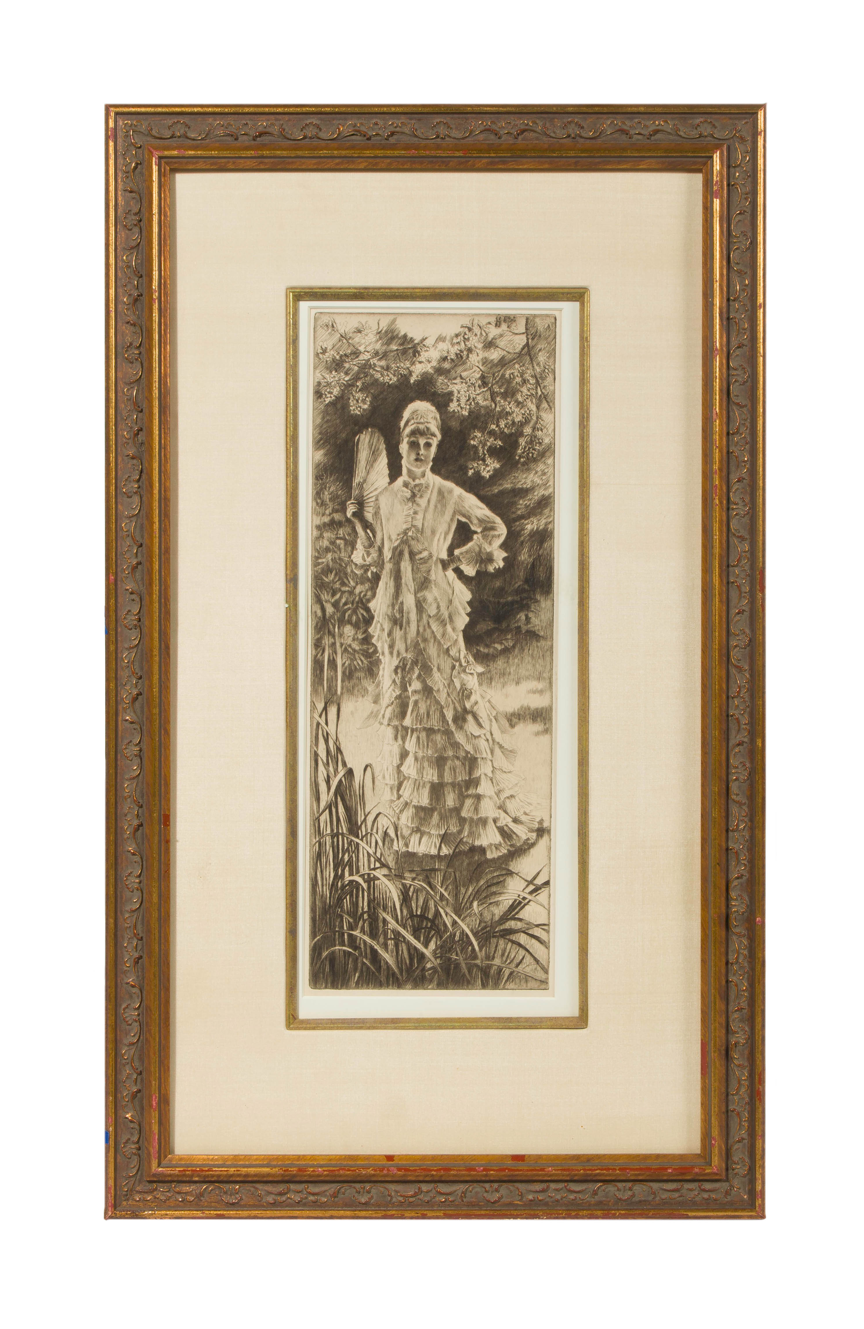 1878, printed signature upper right in plate, etching and drypoint on cream laid paper, depicting a woman in nature, emblematic of spring, matted behind acrylic in a gold-tone frame