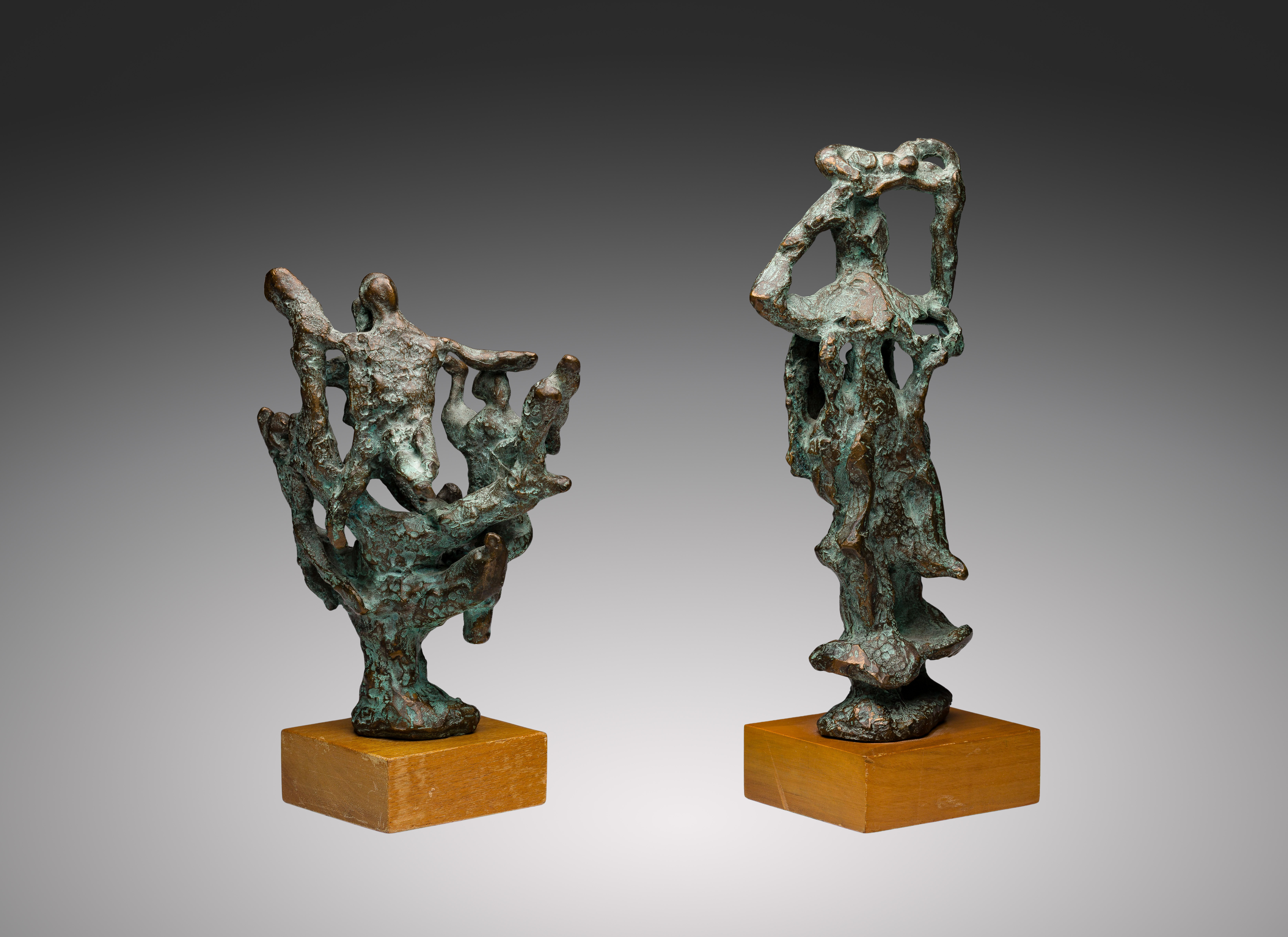 (2) undated items, unsigned, modern brutalist bronzes having abstract figures intertwined and a green patina, set on wood bases