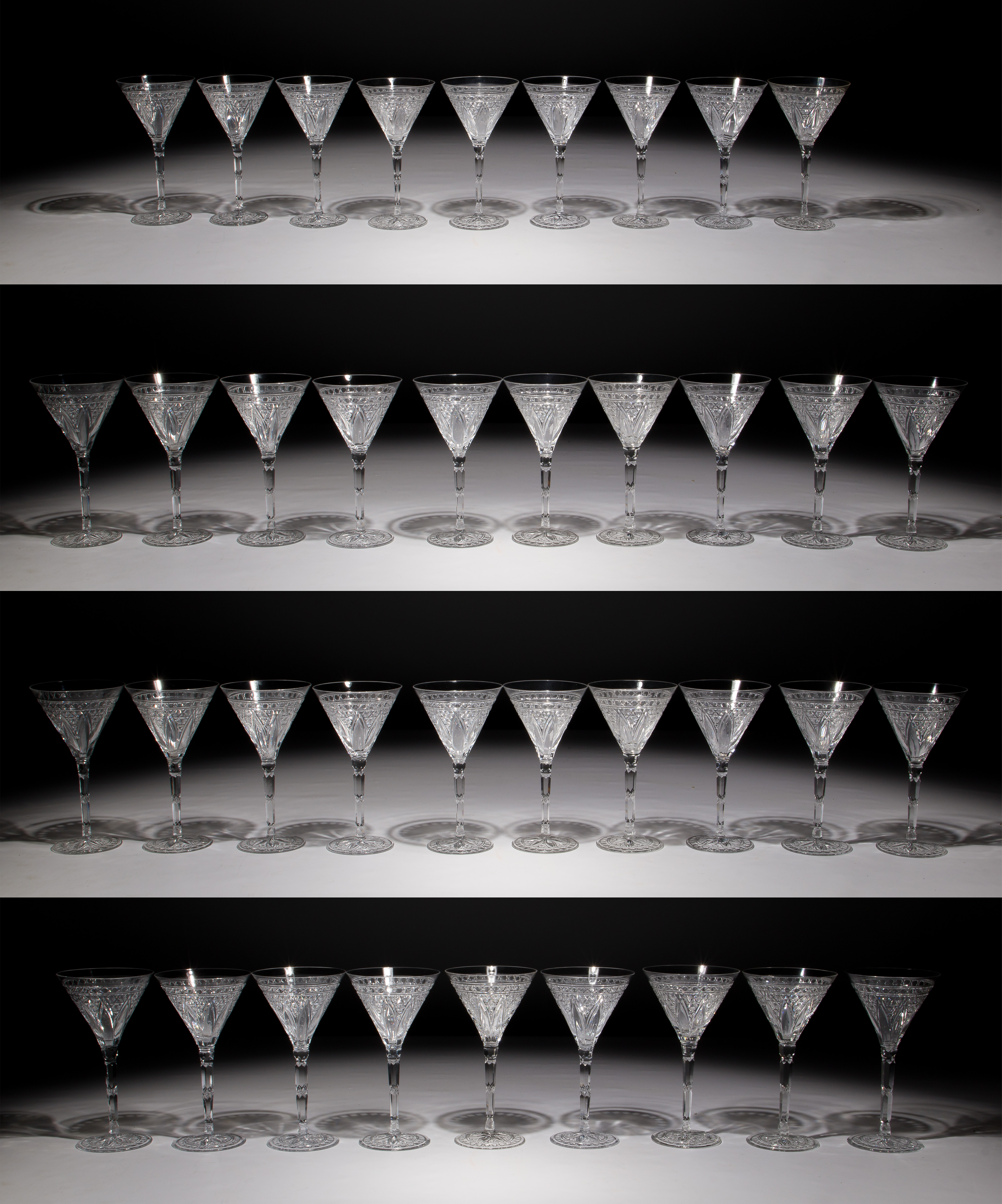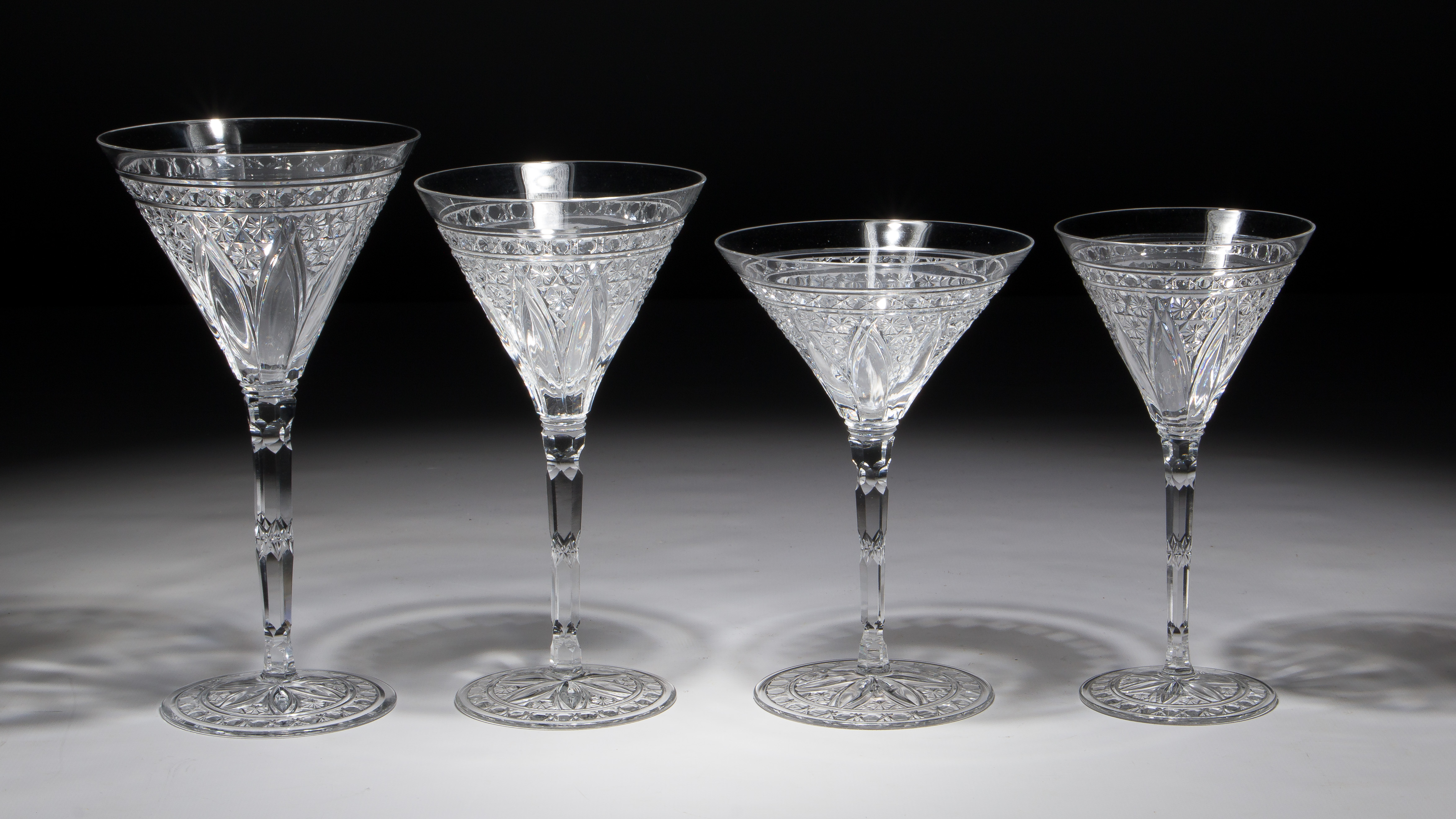 (36) items including (9) goblets, (9) red wines, (9) white wines and (9) champagne coupes, having faint marks on underside, in Styrofoam packing boxes