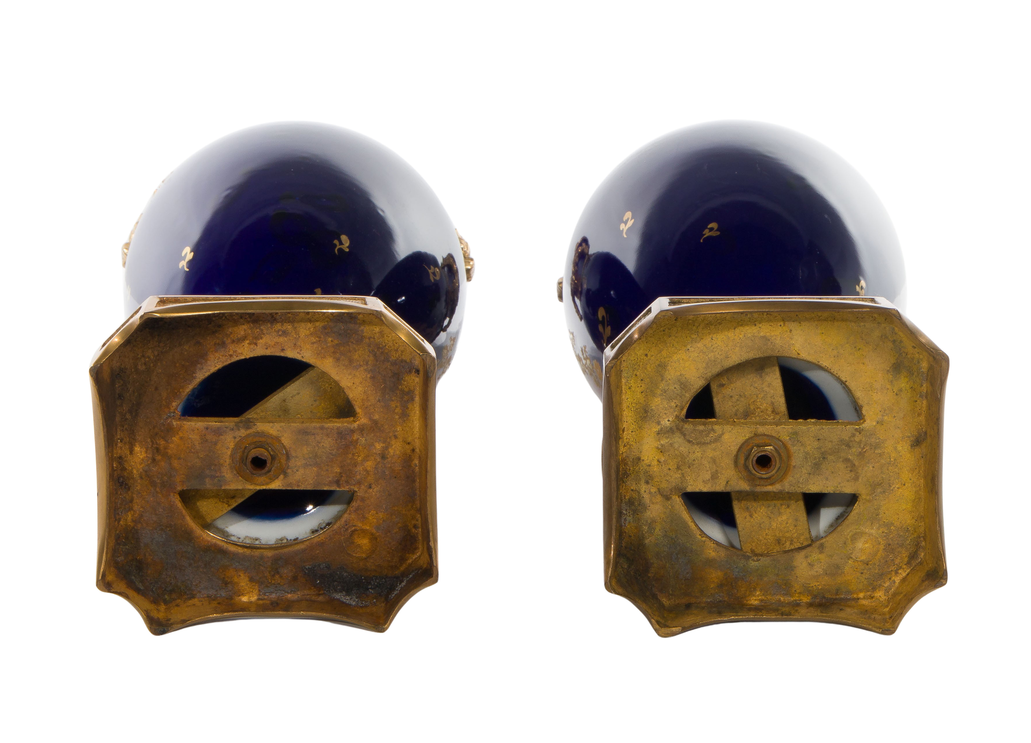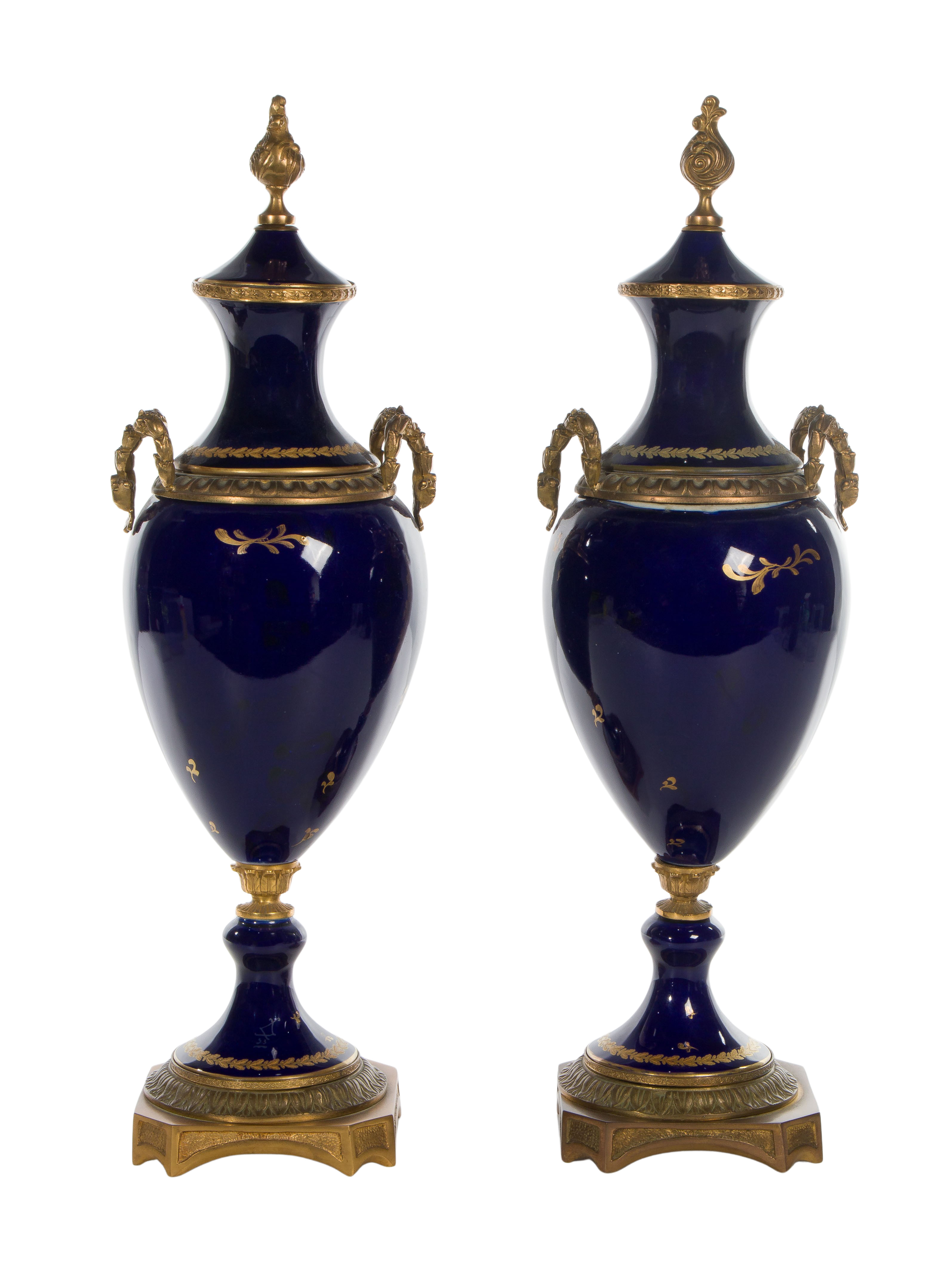 A pair of cobalt lidded urns, having gilt, oval portraits, gilt embellished tops, brass handles and finials, stepped pedestal base, wreathed foot, spurious Sevres marking on foot of base