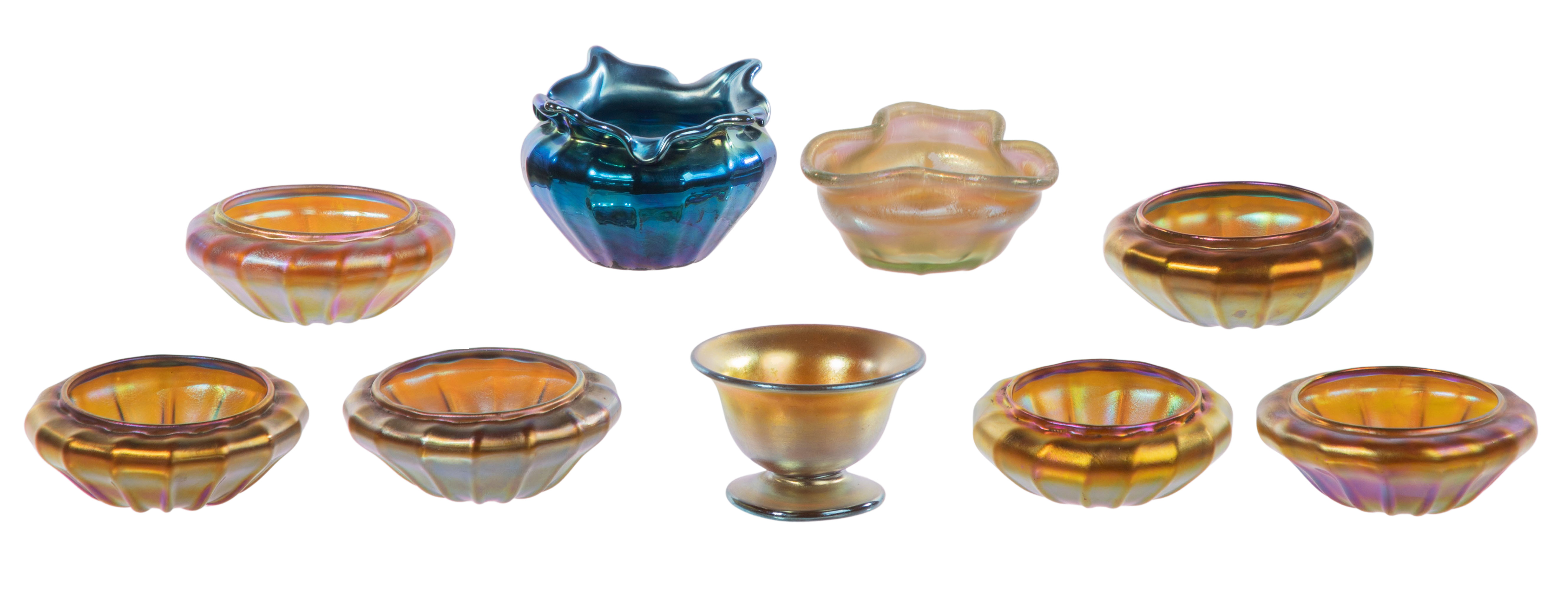 (9) items including a set of (6) favrile open cellars marked ‘Quezal’, a blue Aurene marked ‘Stueben’, a golden Aurene marked ‘Aurene’ and a golden iridescent marked ‘301’